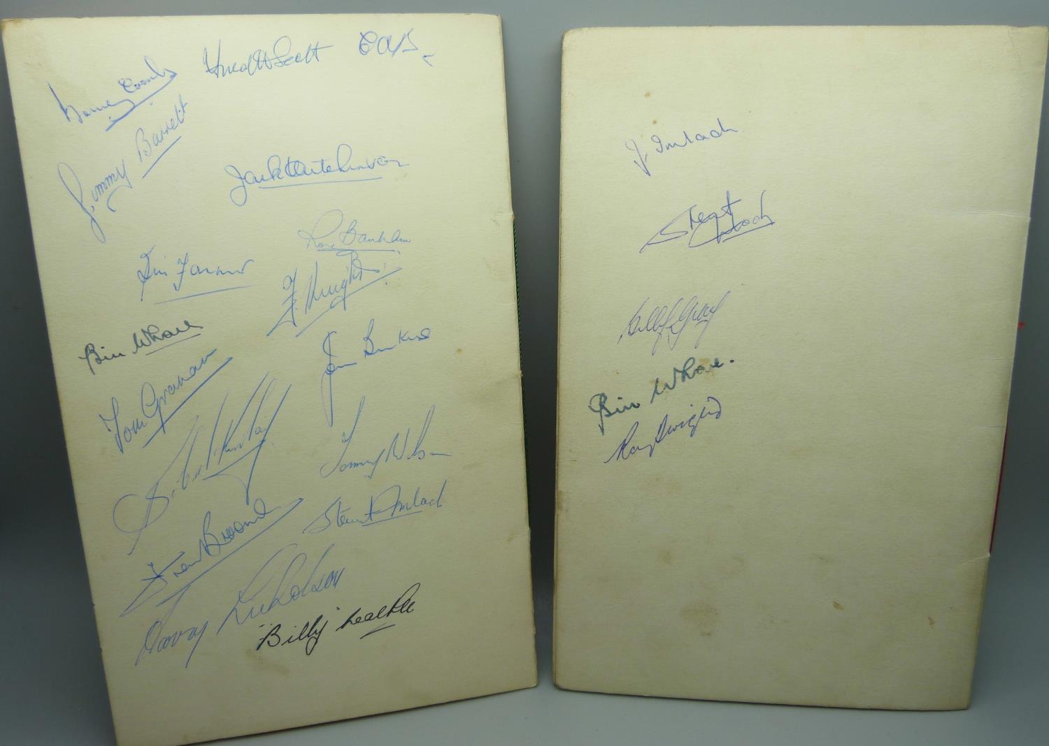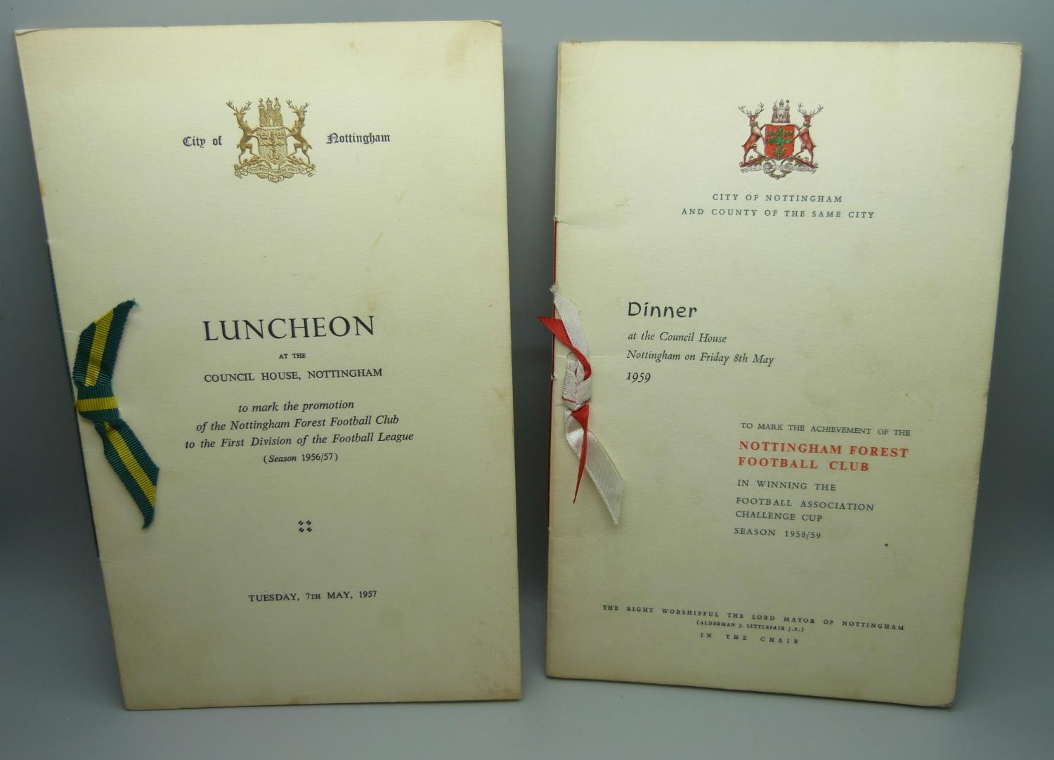 Two Nottingham Forest celebration dinner menus, signed by members of 1956/7 promotion winning side and the 1959 FA Cup winning side
