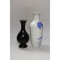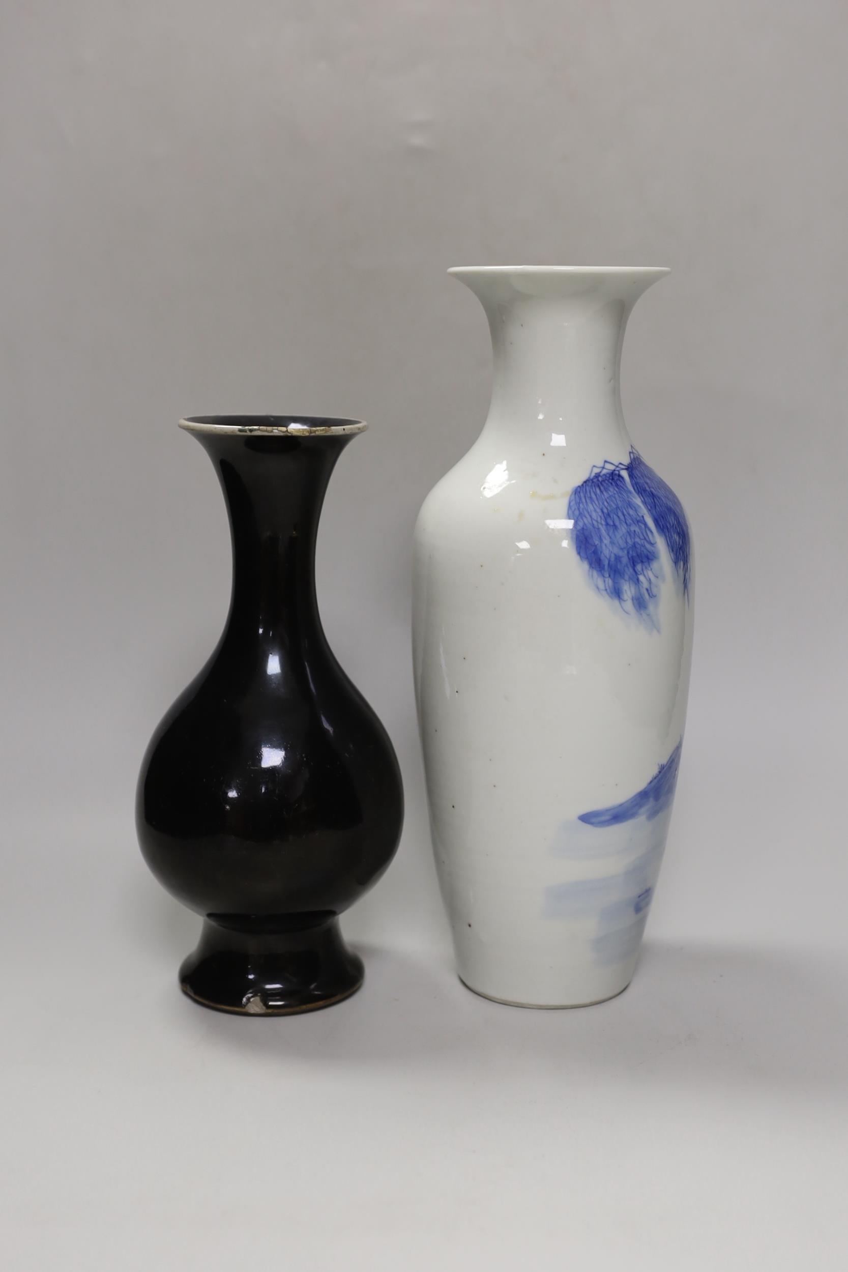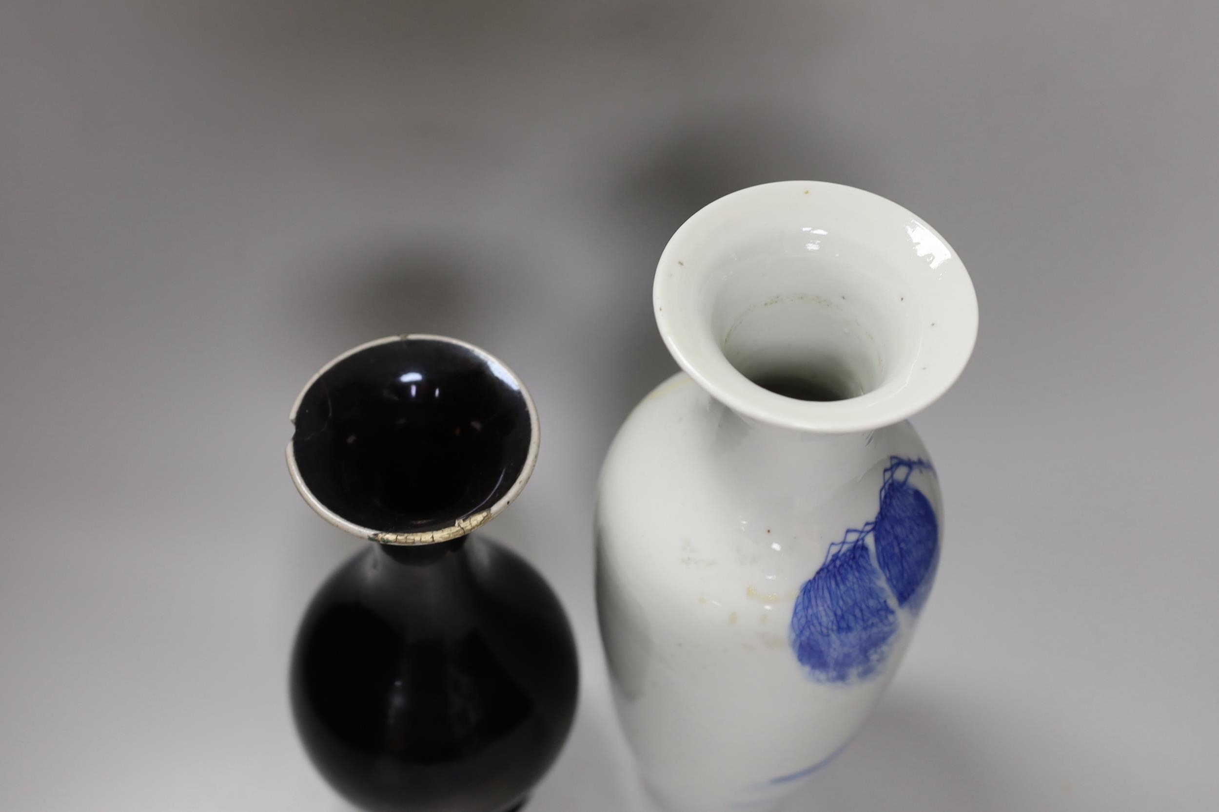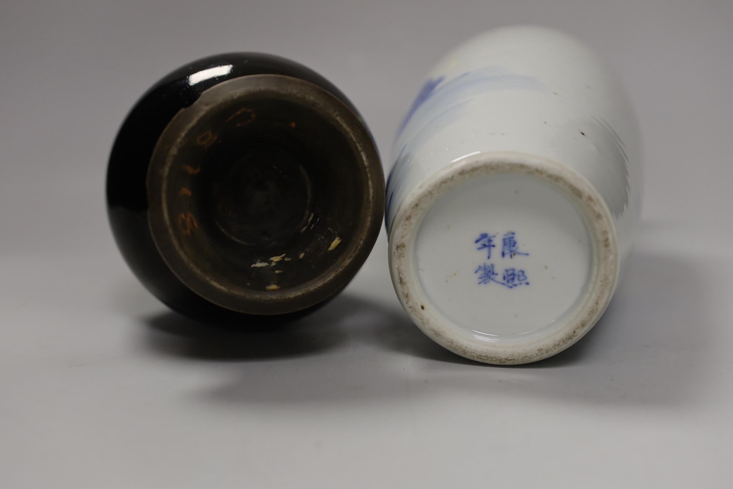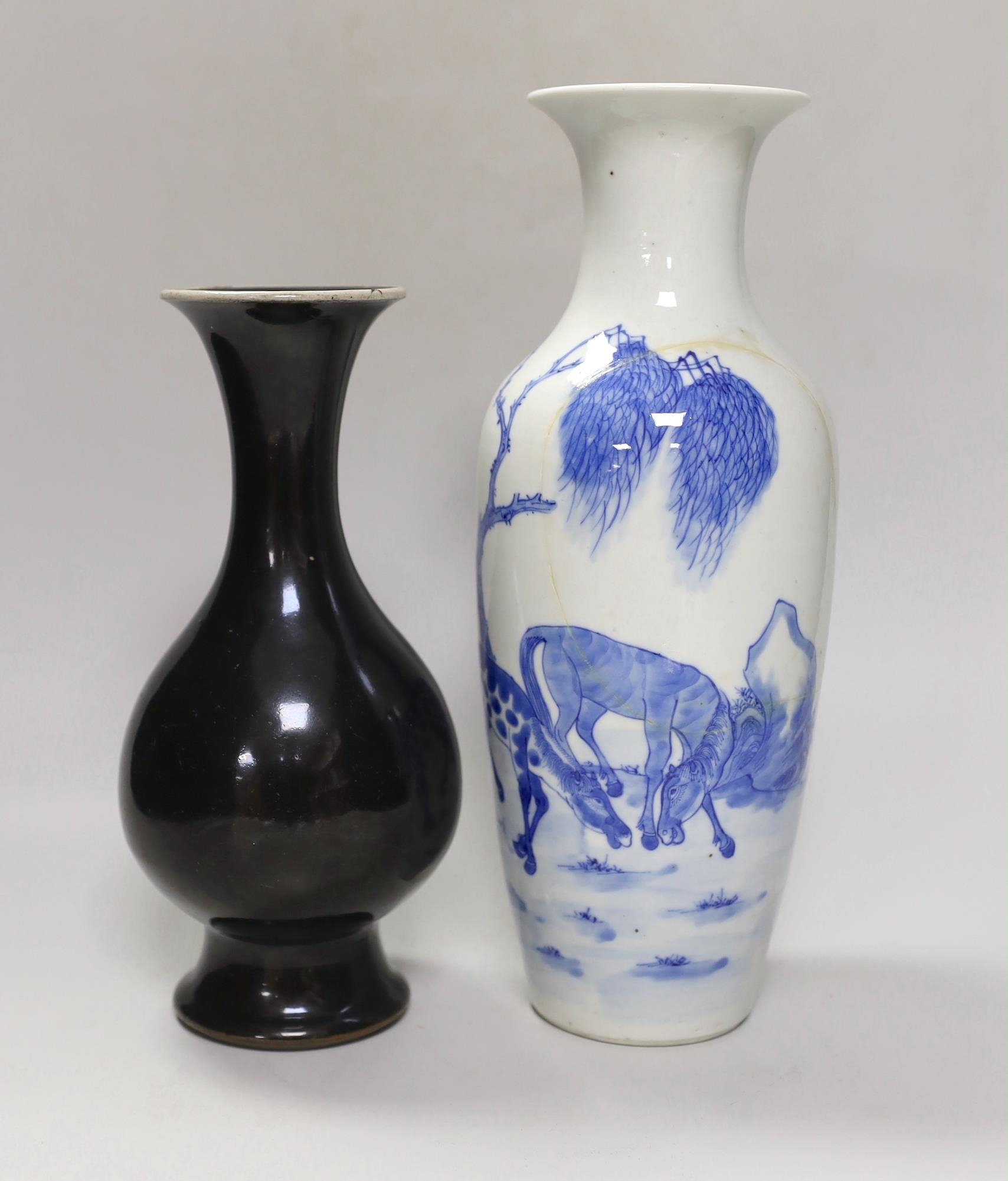 A Chinese mirror-black glazed vase, 18th century and a 19th century Chinese blue and white 'horses' vase, tallest 30cm
