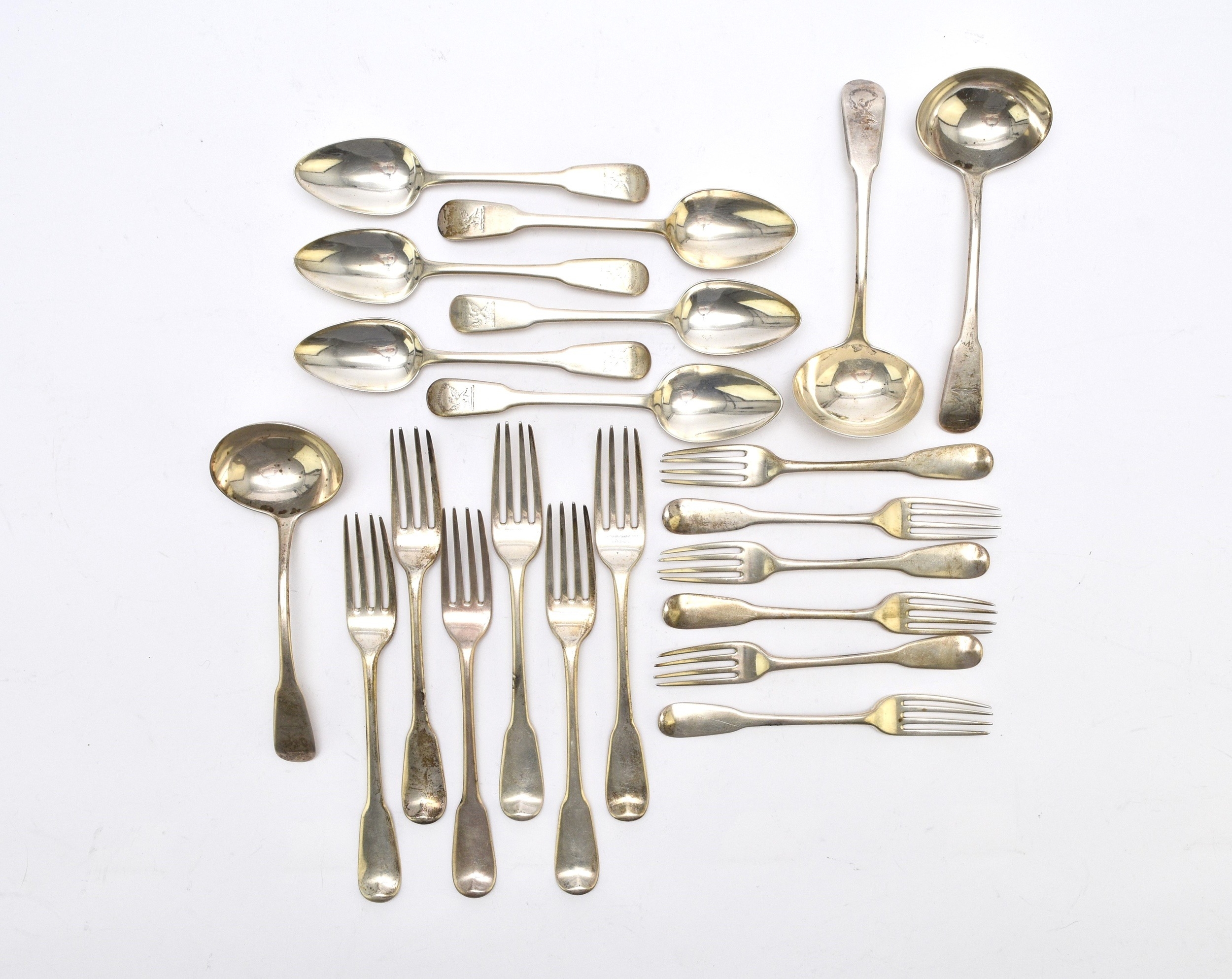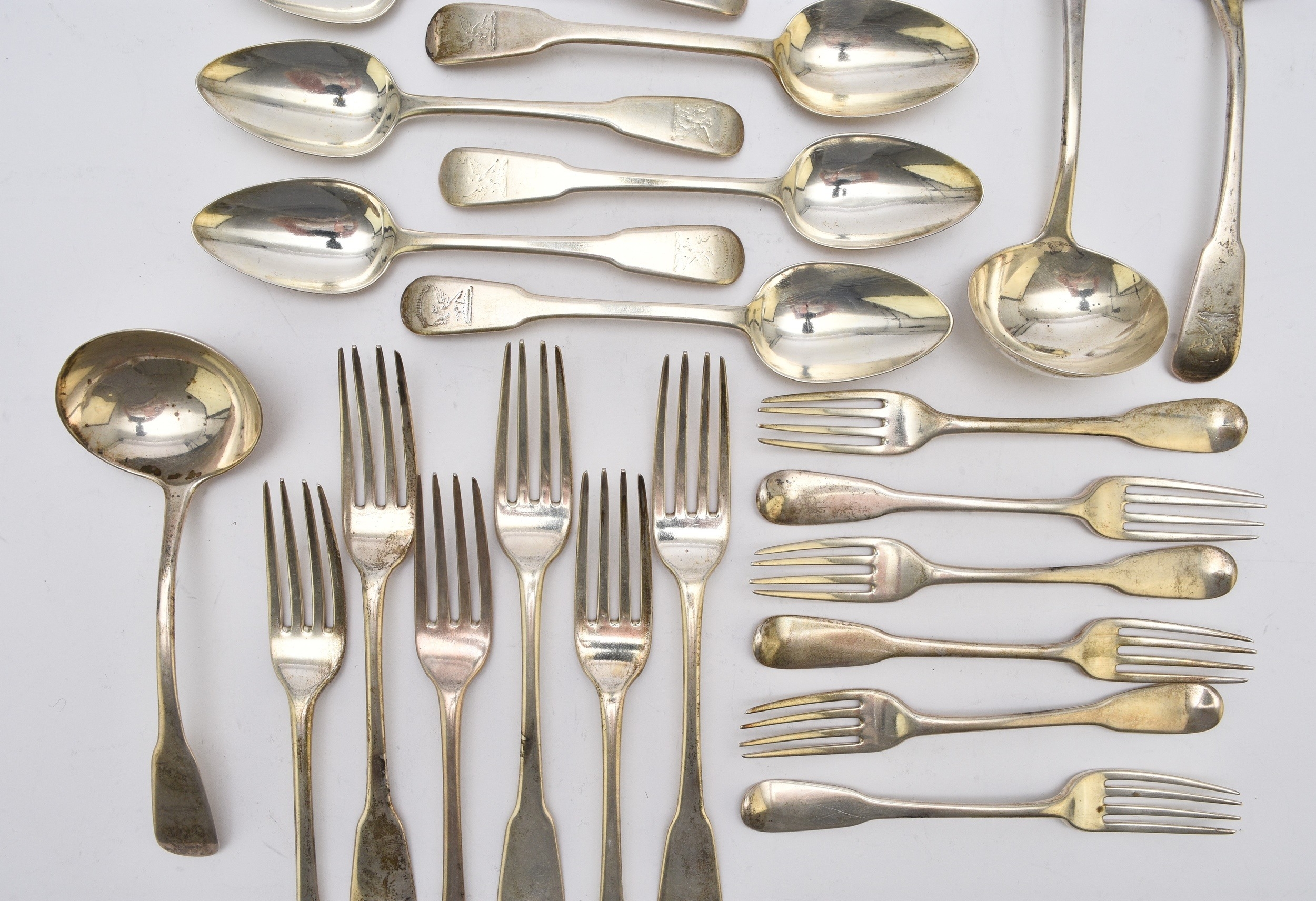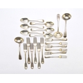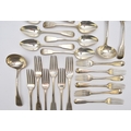 A set of George III silver Fiddle pattern flatware, William Eley I & William Fearn, London 1797, comprising; sixteen table forks, seventeen dessert forks, ten dessert spoons and three sauce ladles, together with four matching dessert spoons, Birmingham 1830, all with engraved crest, total weight approx. 91oz (40)