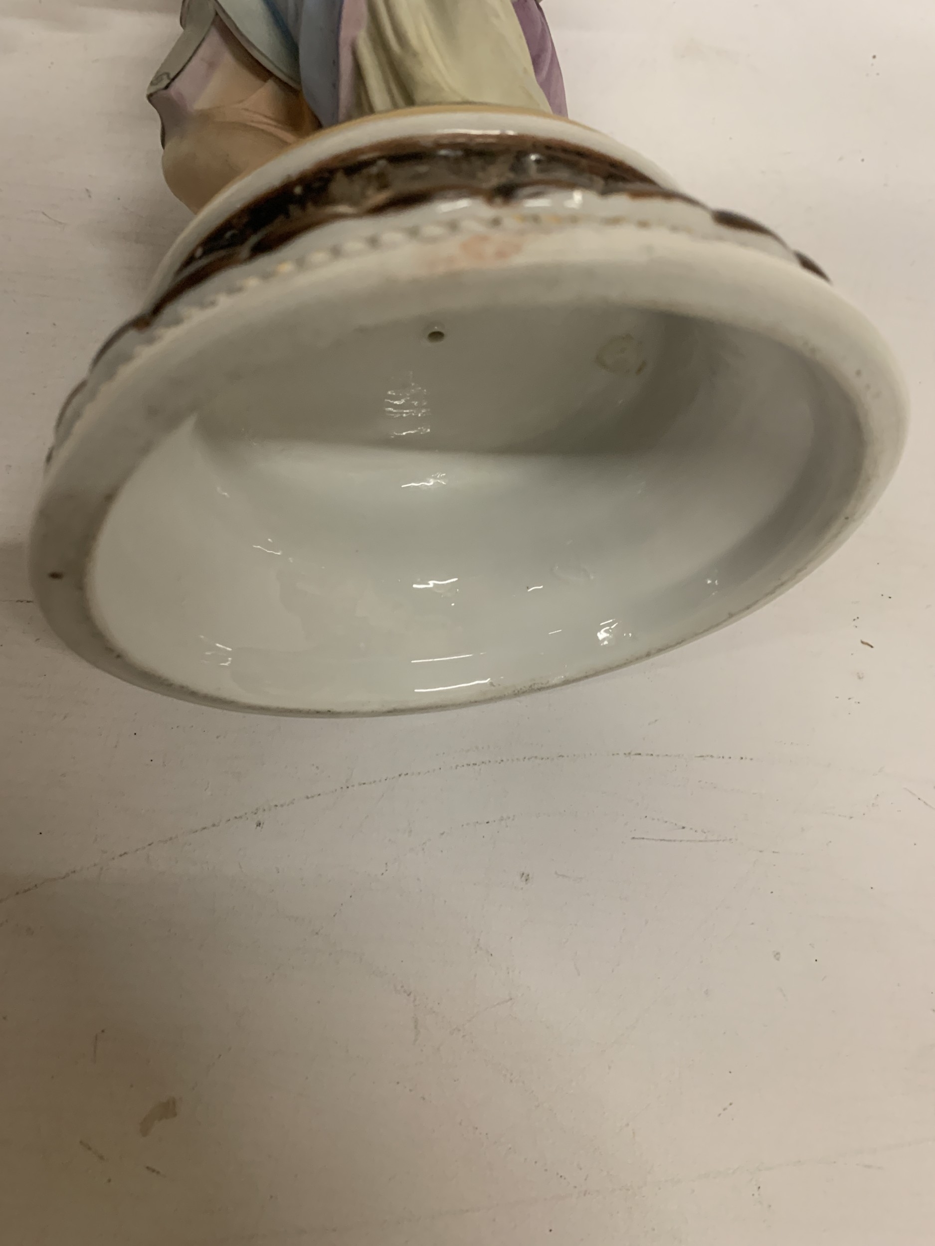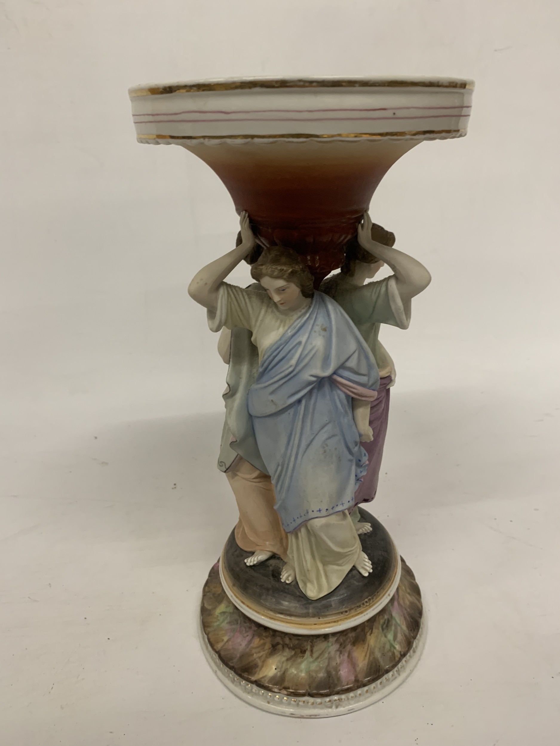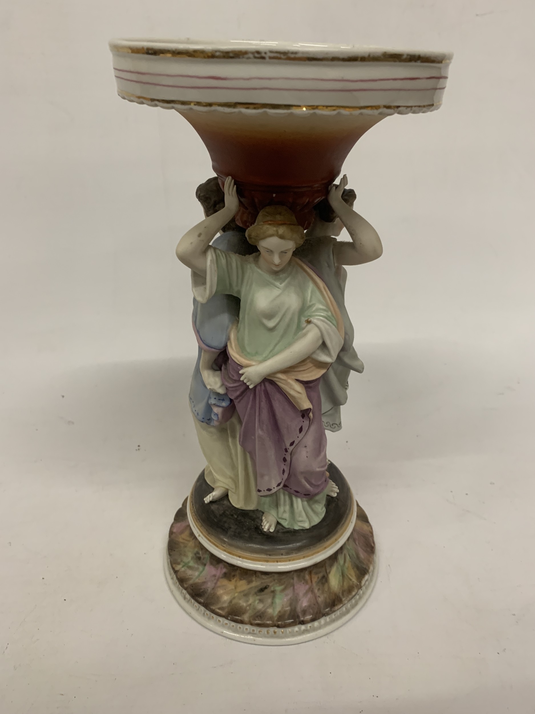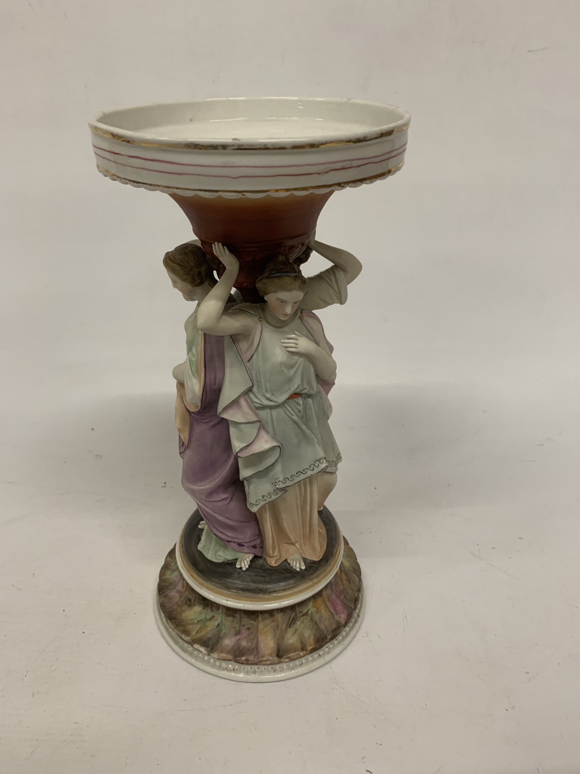A CONTINENTAL DRESDEN STYLE FIGURAL "THREE MAIDENS" CENTREPIECE CERAMIC SCULPTURE - 30 CM