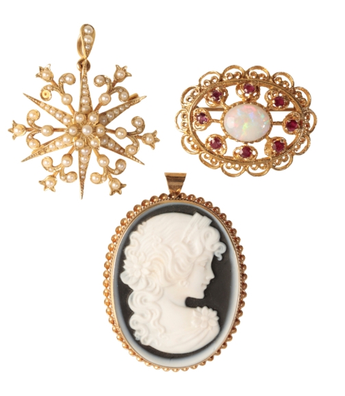 A VICTORIAN SEED PEARL STARBURST BROOCH / PENDANT, the reverse stamped "15ct", together with a 9ct gold cameo brooch and a 9ct gold opal and gem-set brooch (3)