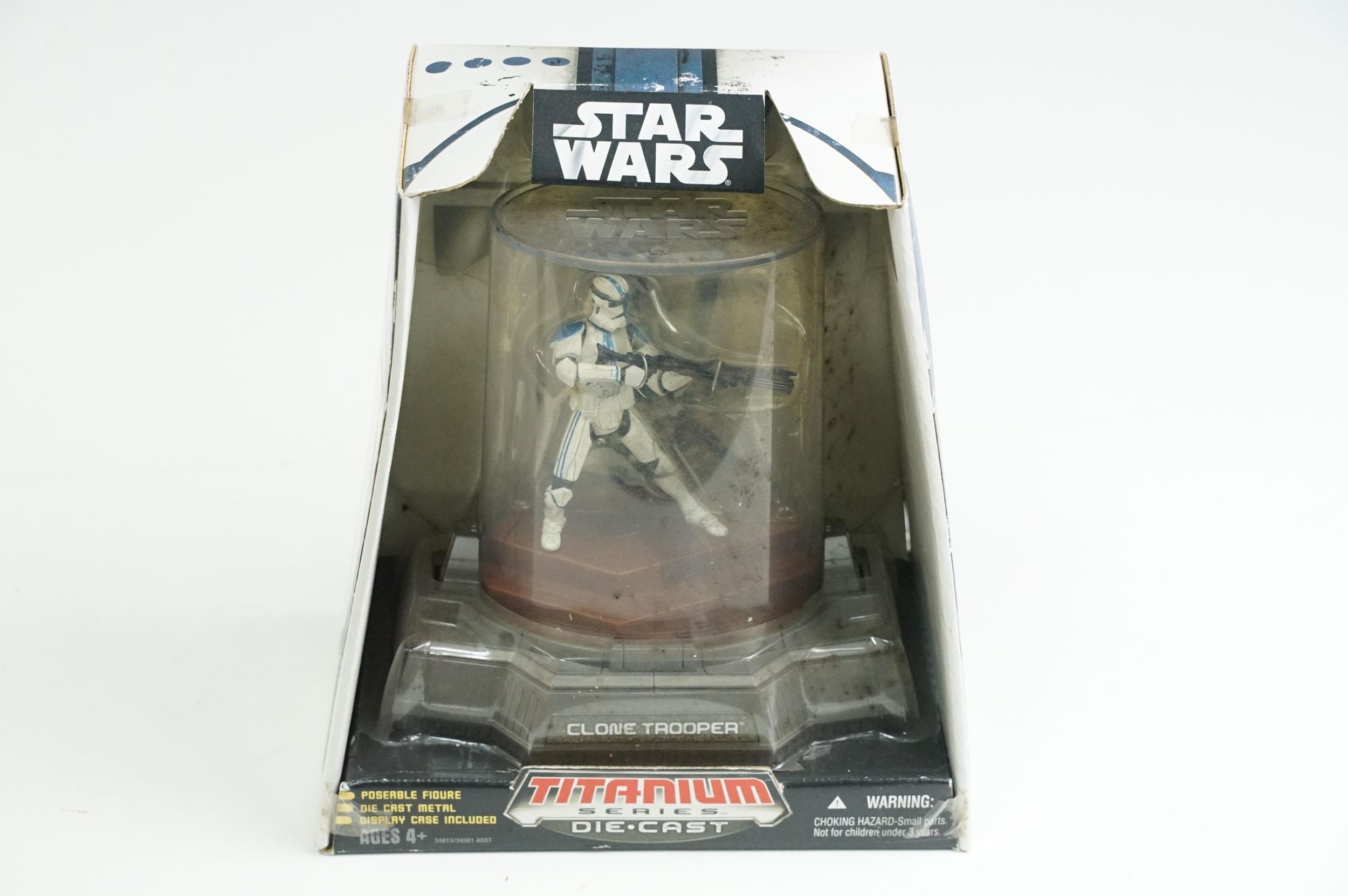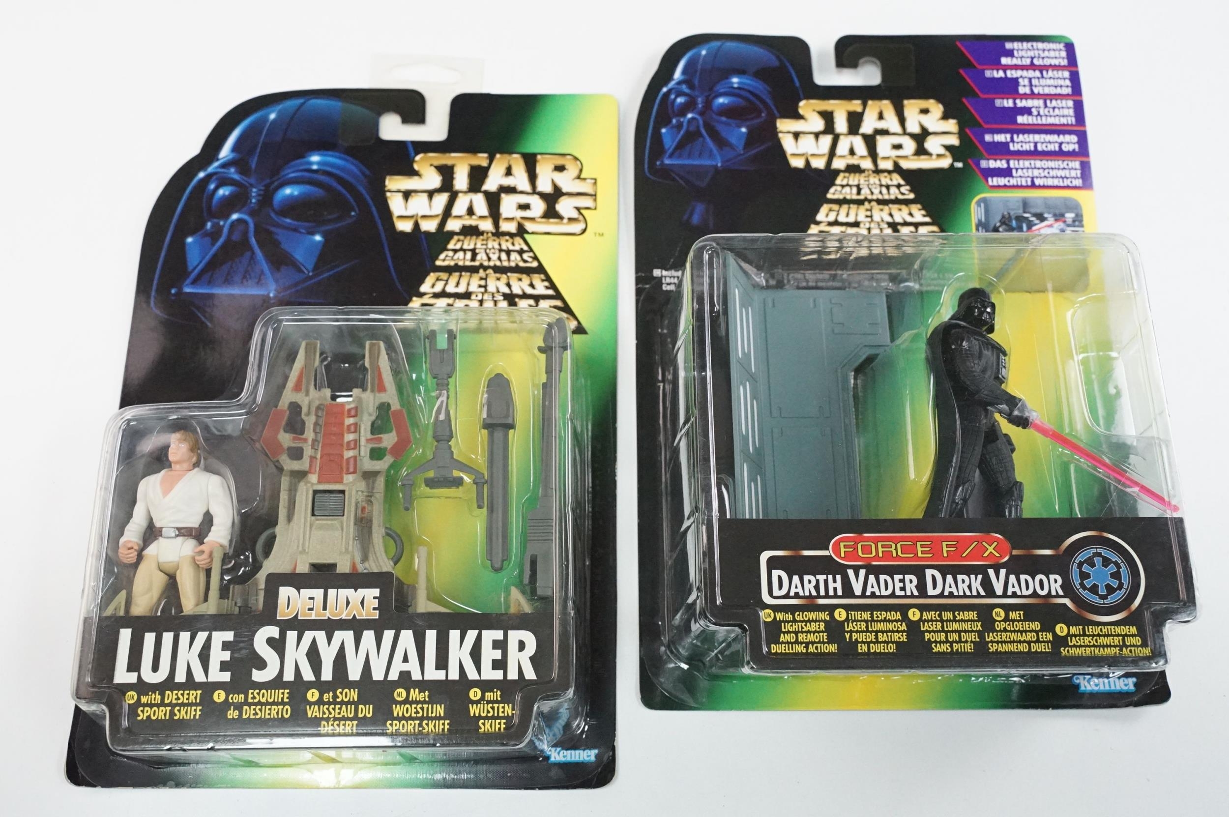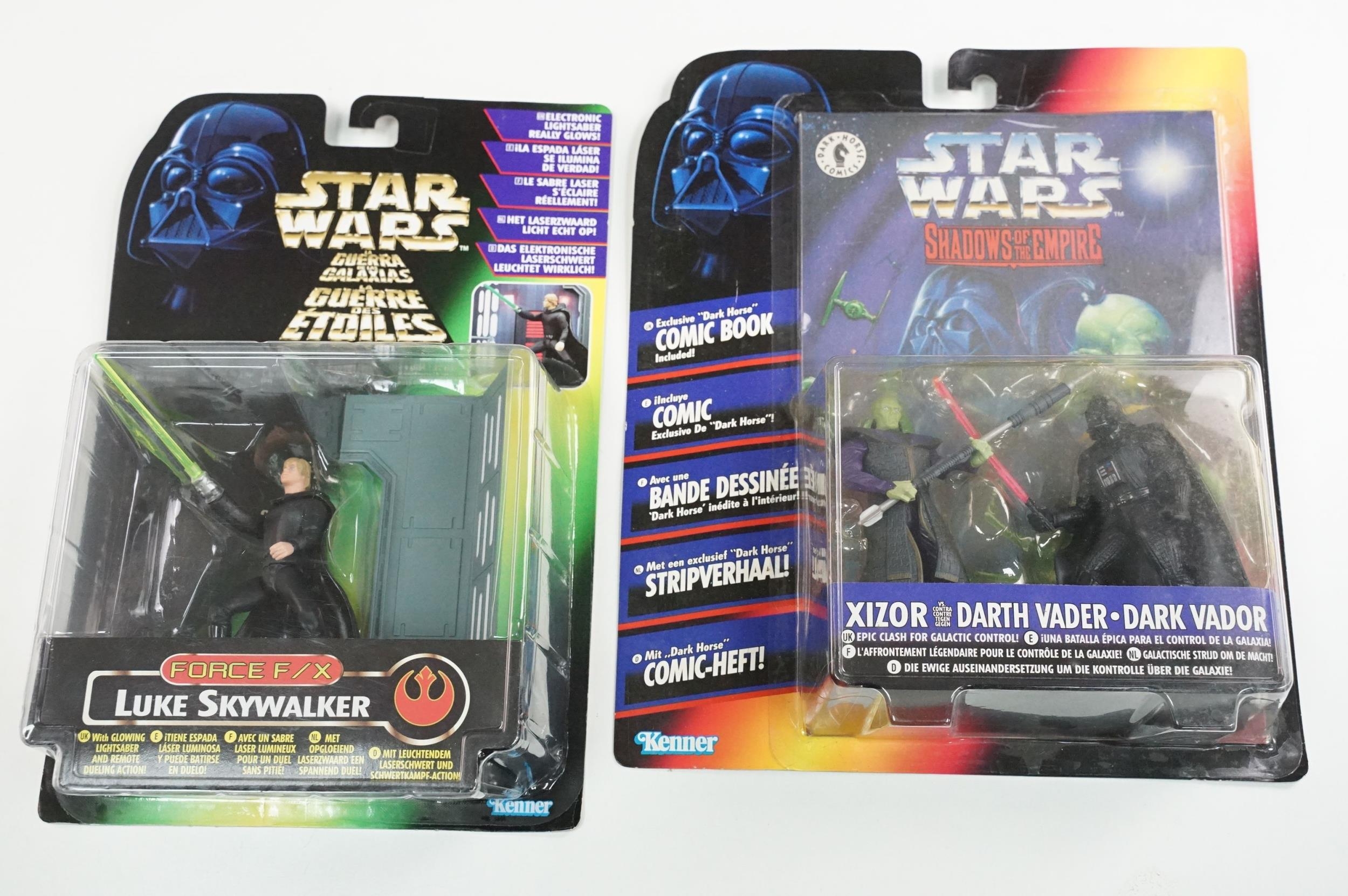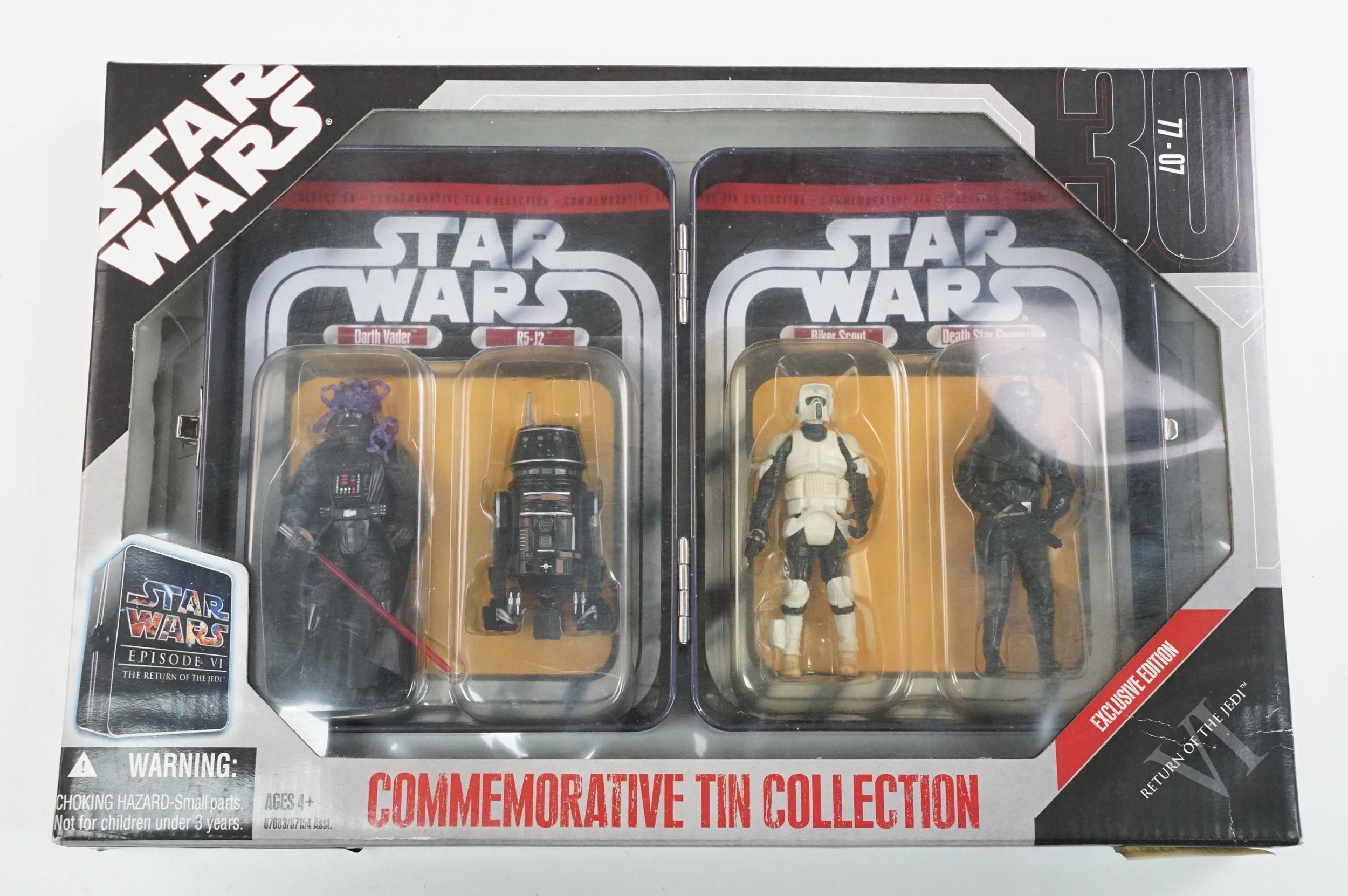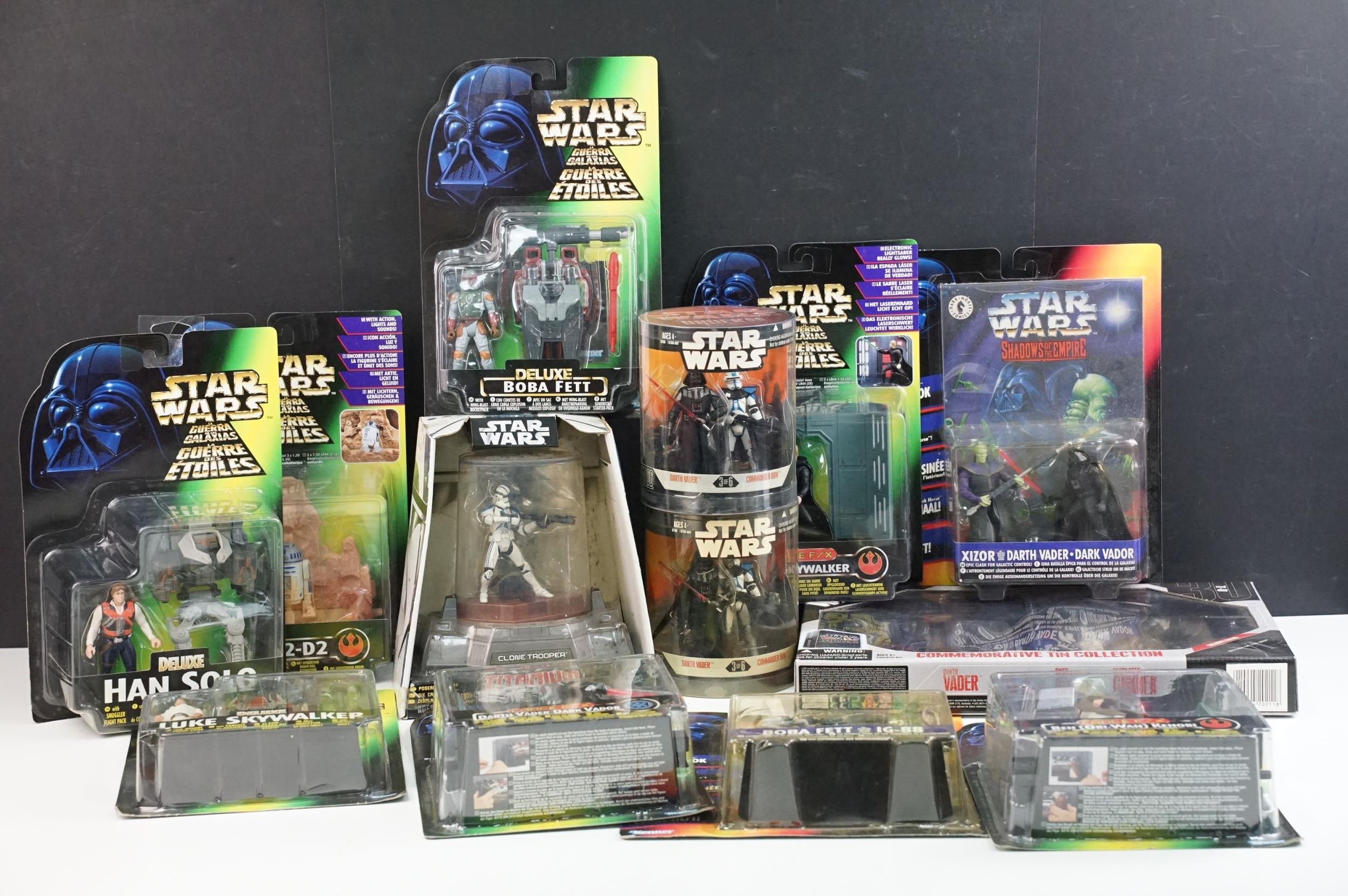 Star Wars - 13 Boxed Star Wars figures to include Hasbro Commemorative Tin Collection (Darth Vader, R5-J2, Biker Scout & Death Star Gunner), 3 x Kenner Deluxe, 4 x Kenner Force FX, 2 x Kenner Shadows of the Empire, 2 x Hasbro Order 66 and Hasbro Titanium Series Diecast Clone Trooper (two boxes)