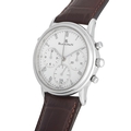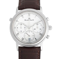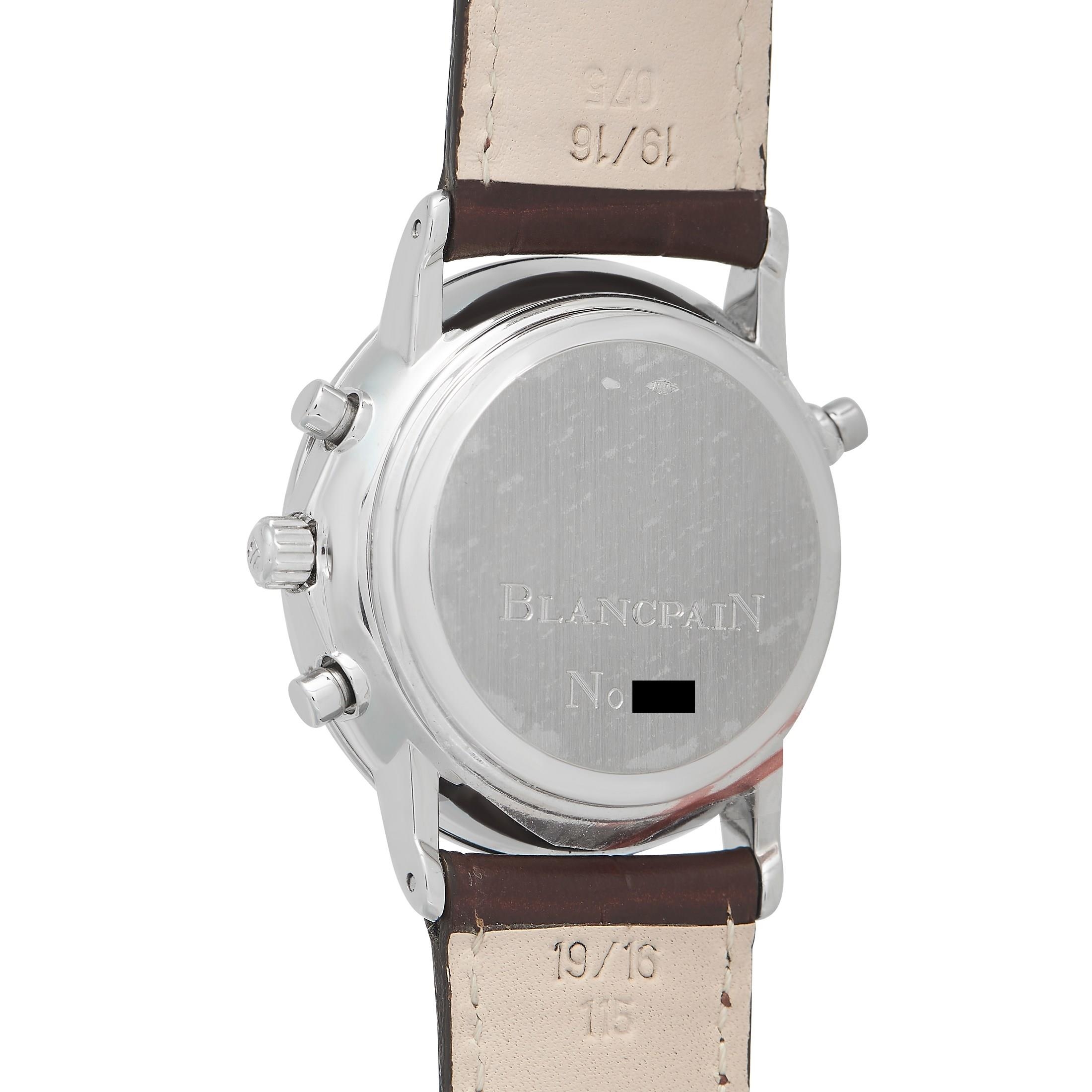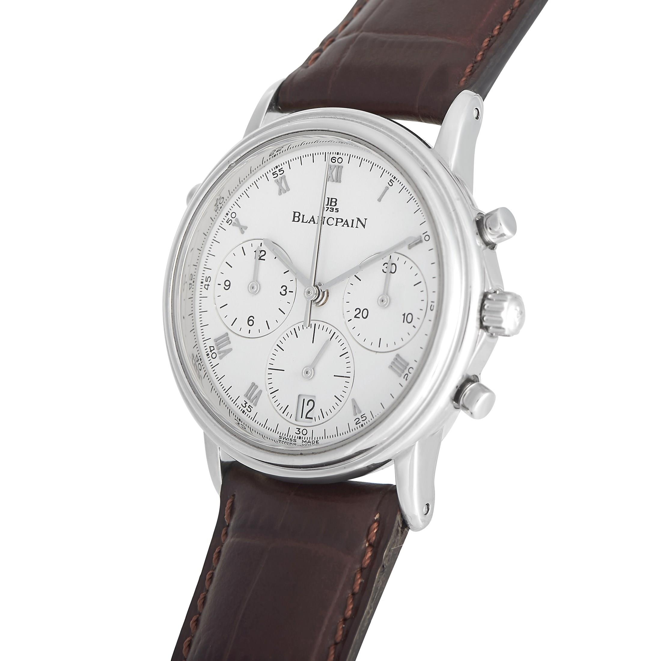 A Blancpain Villeret Split Seconds Chronograph Platinum Watch. The neo-vintage Blancpain 1186 dubbed as the world's first rattrapante chronograph (split-seconds). 34mm platinum case housing an extremely thin movement which is the self-winding caliber 1186 split-seconds chronograph movement with 38 jewels, 361 components, a frequency of 21,600 vph, and a power reserve of 40 hours. The three-body case is complemented by a stepped convex bezel, straight lugs, and a white dial with applied Roman numeral hour markers, luminescent baton hands, three sub-dials, and a date window at 6 o'clock. The watch is outfitted with a brown leather strap. In excellent condition and accompanied by the manufacturer's box and papers.*This item is held at Cadmore USA Office in Pennsylvania, USA and will be shipped from there*