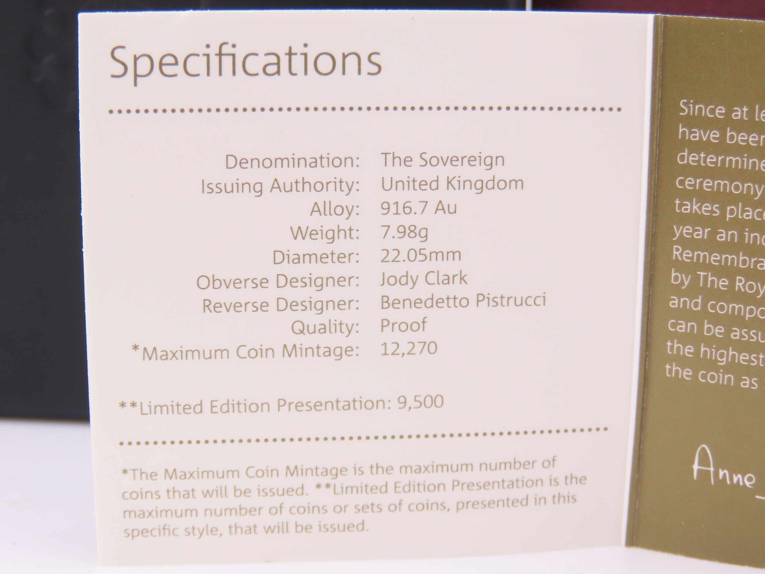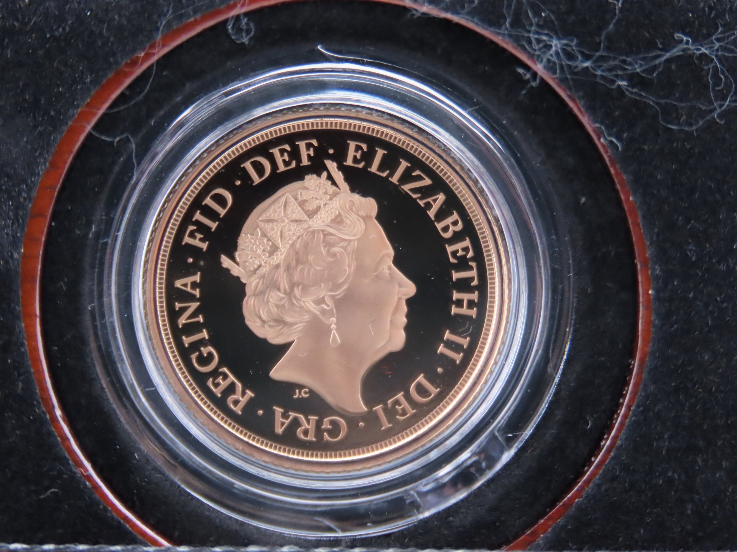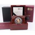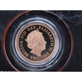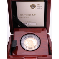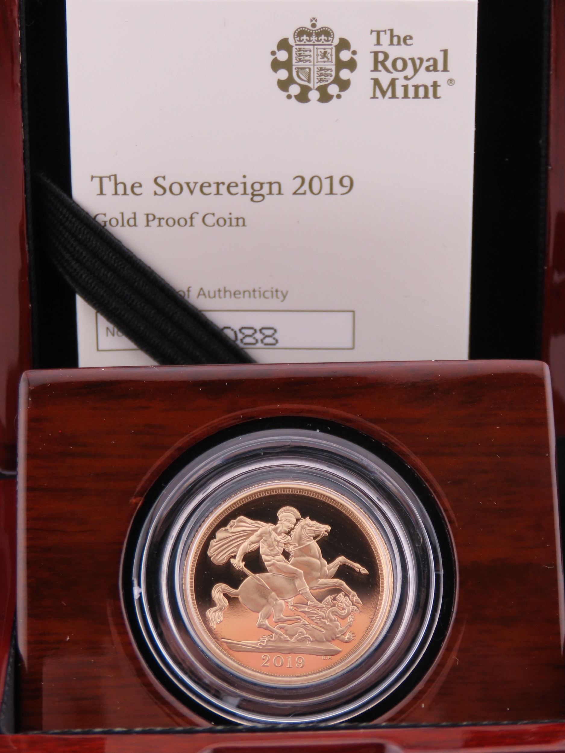 A 2019 United Kingdom gold Sovereign struck in 22 carat gold to proof standard. The obverse features the fifth portrait of Queen Elizabeth II by Jody Clark, with the reverse showing the timeless St George and the Dragon design by Benedetto Pistrucci. Weighing approximately 7.98 grams with a gold content of approximately 7.32 grams. Proof finish. Presented in the original Royal Mint presentation case with certificate of authenticity.