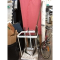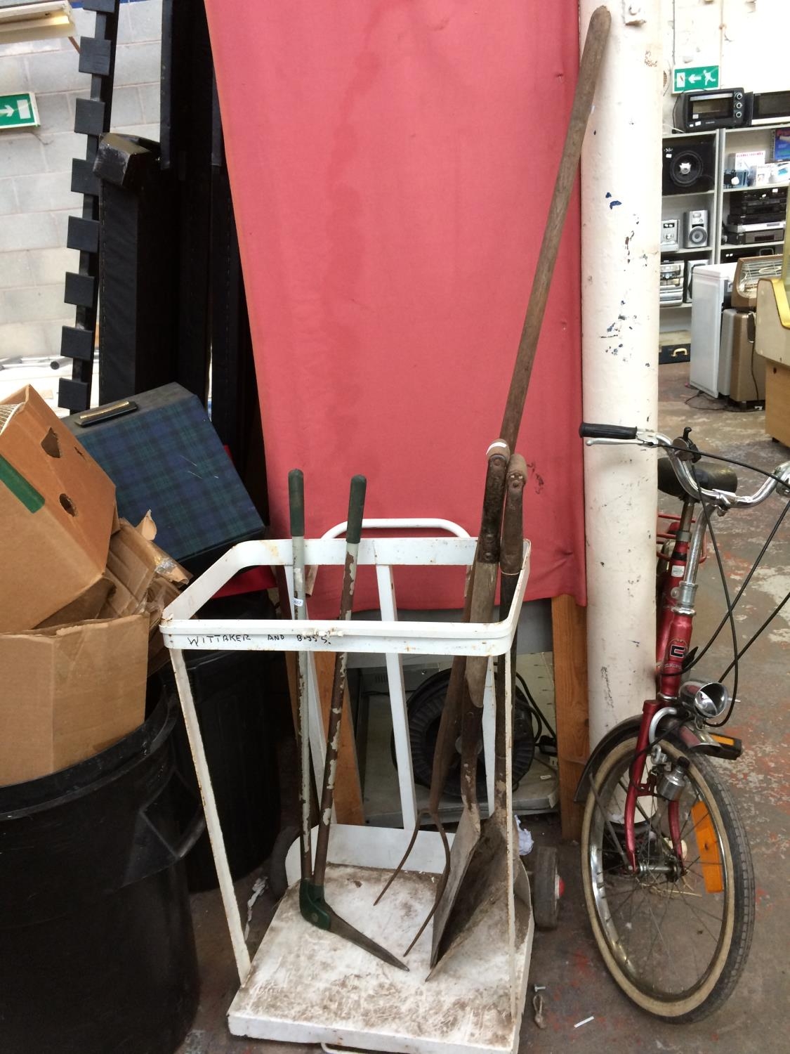 FOUR ITEMS - A SET OF EDGING SHEARS, A HAY FORK, A SHOVEL AND A SPADE