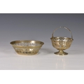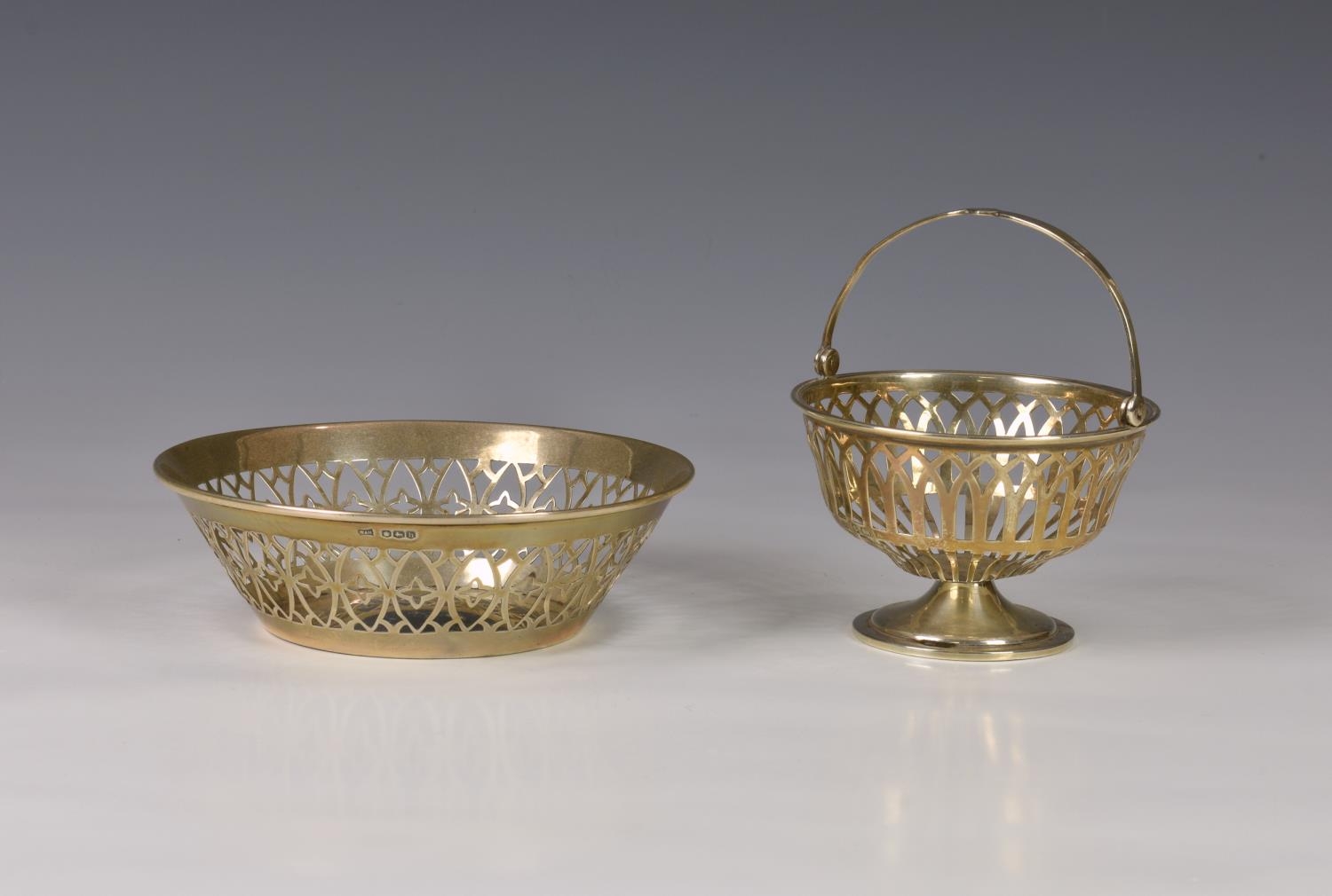 A silver swing handle sugar basket, Adie Brothers Ltd., Birmingham 1925, with shaped ribbed pierced sides, raised on circular stepped foot; together with a Walker and Hall circular pierced bon bon dish, 5in. (12.8cm.) diameter, weight 4.2 tr.oz. (2)