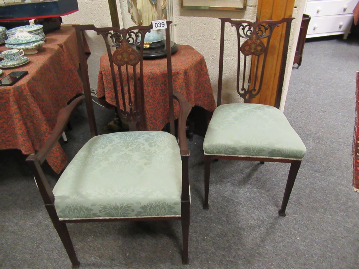 Victorian mahogany inlaid armchair plus single chair.