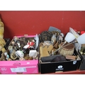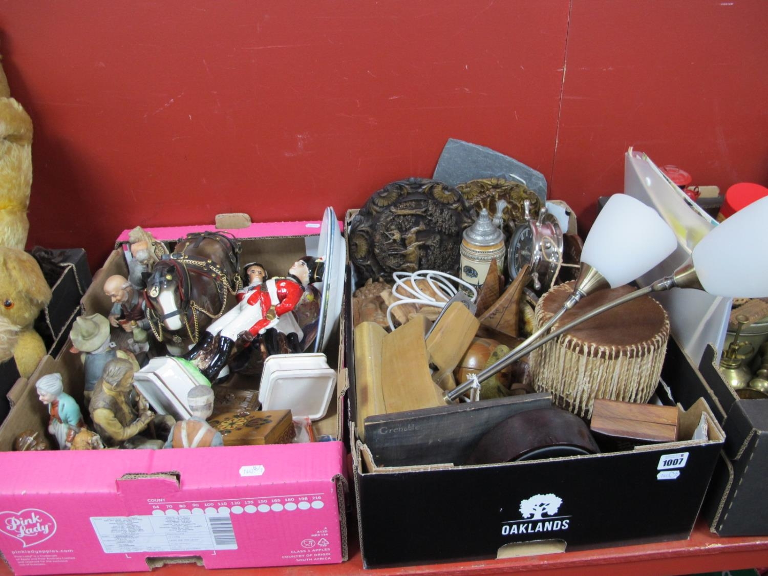Carved Wooden Figures, ships wheel clock, 'Smoothing Plane', table light, drum, pottery shire horse, ornaments, etc:- Two Boxes