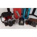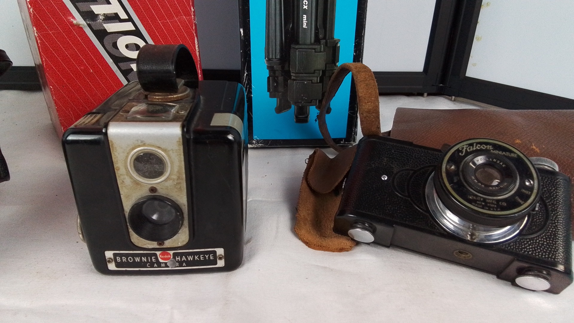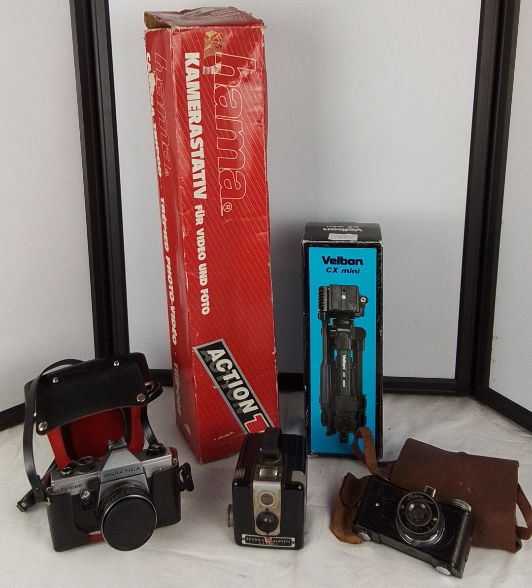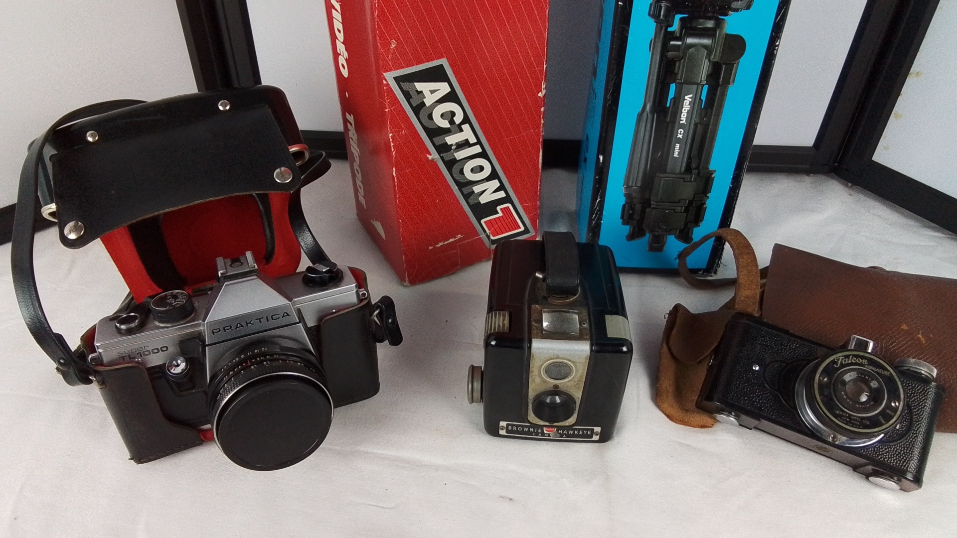 Group of three cameras comprising a Praktica Super TL 1000 SLR, a Kodak Brownie Hawkeye box camera, and a Falcon Miniature camera with Wolensak lens, with leather cases and two boxed tripods (Hama Action 1 and Velbon CX Mini).