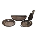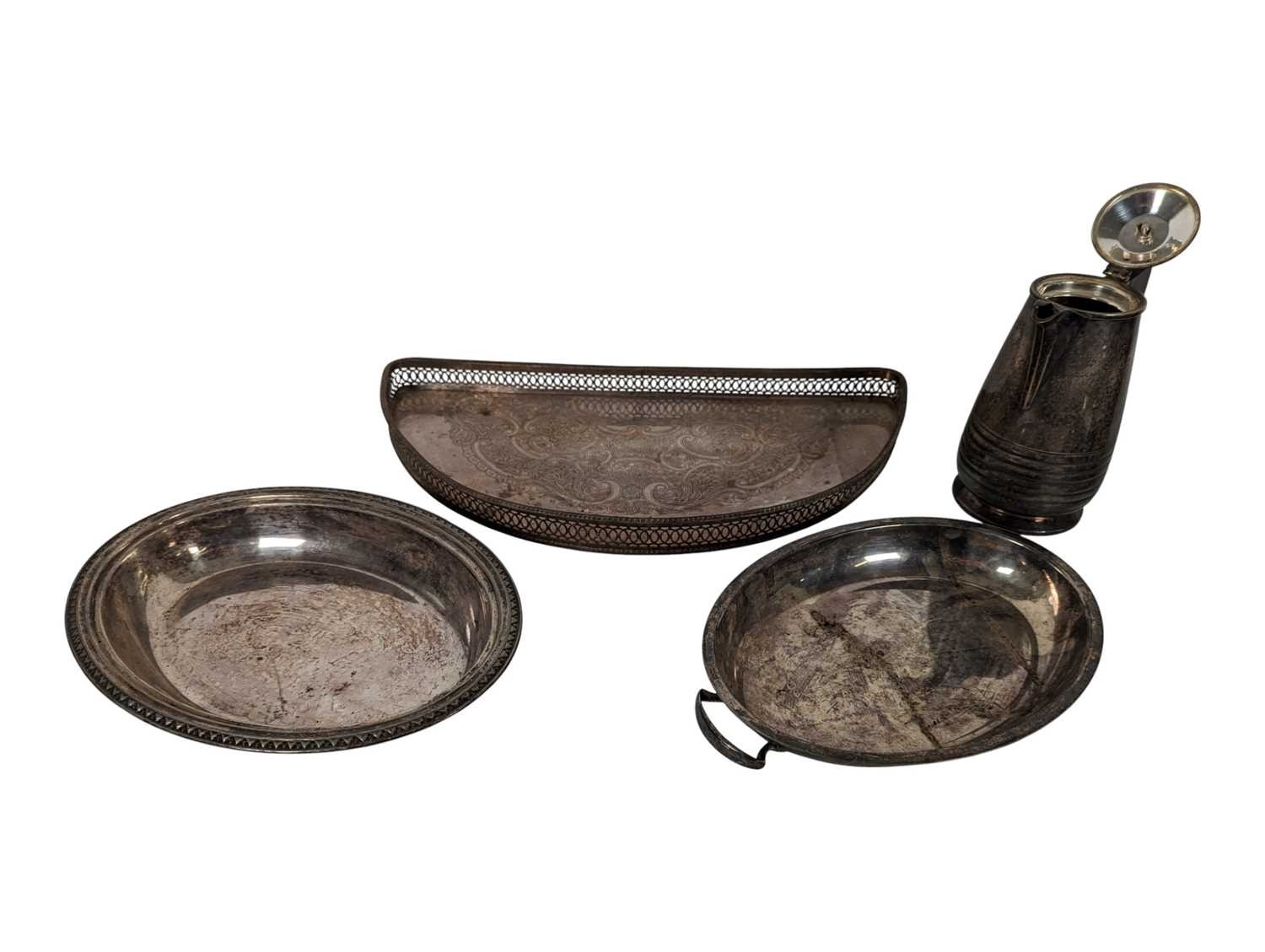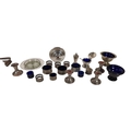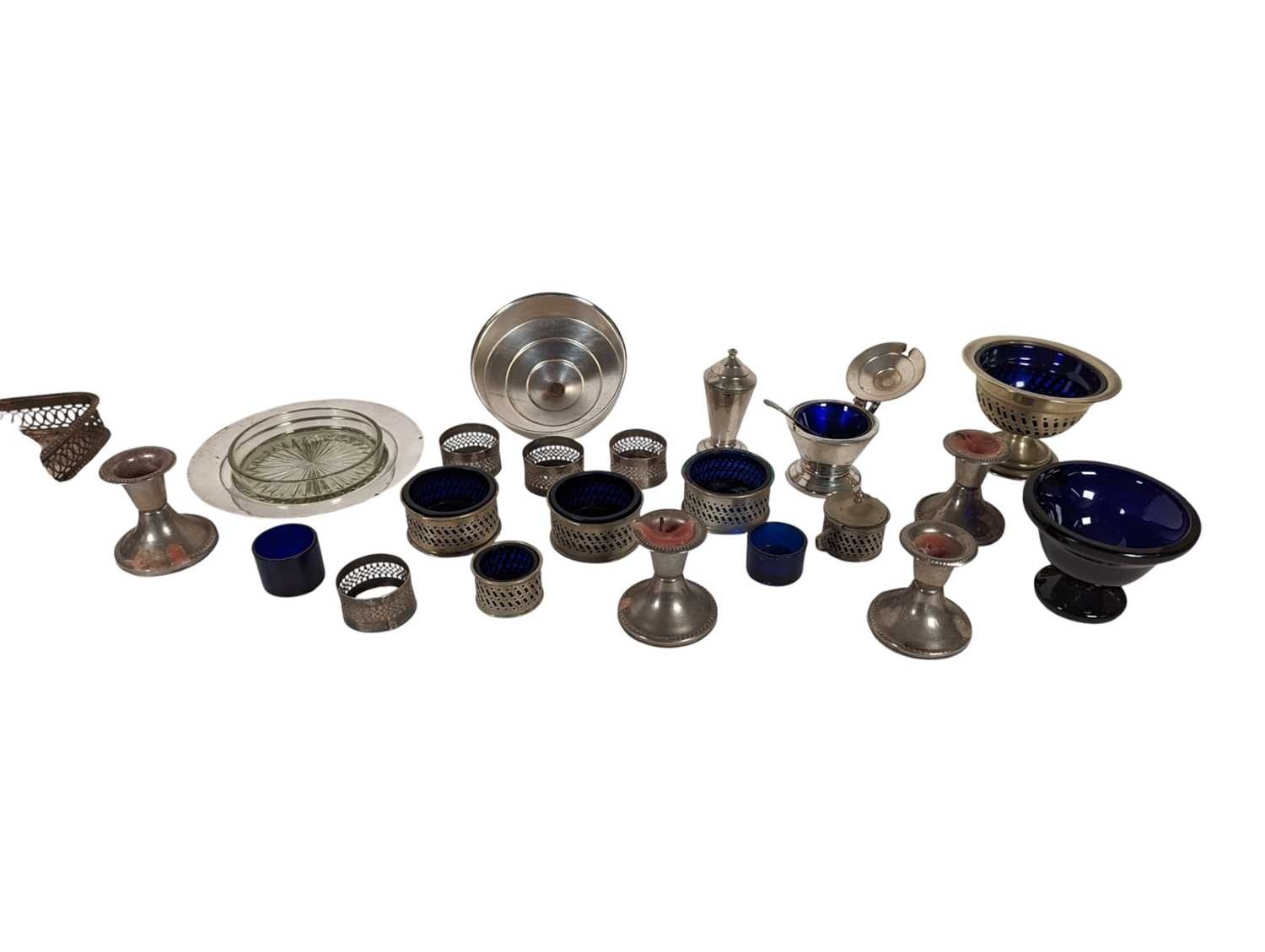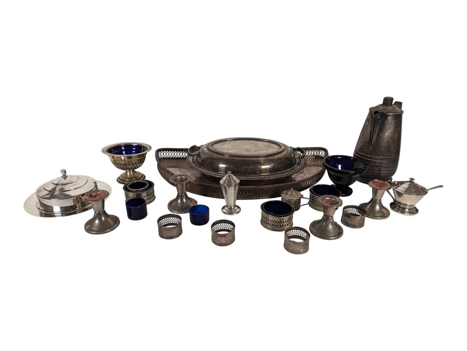 Collection of early 20th century Art Deco silver plated dinnerware. To include a Walker and Hall serving tray, a THF stag marked crescent moon shaped serving tray, a Regis plate N1679 coffee pot, candlestick holders, napkin rings, Duchess plate salt pot, crumpet warmer, a selection of pierced silver plated pots with inset Bristol blue bowls, and more. Most with marks to the base.