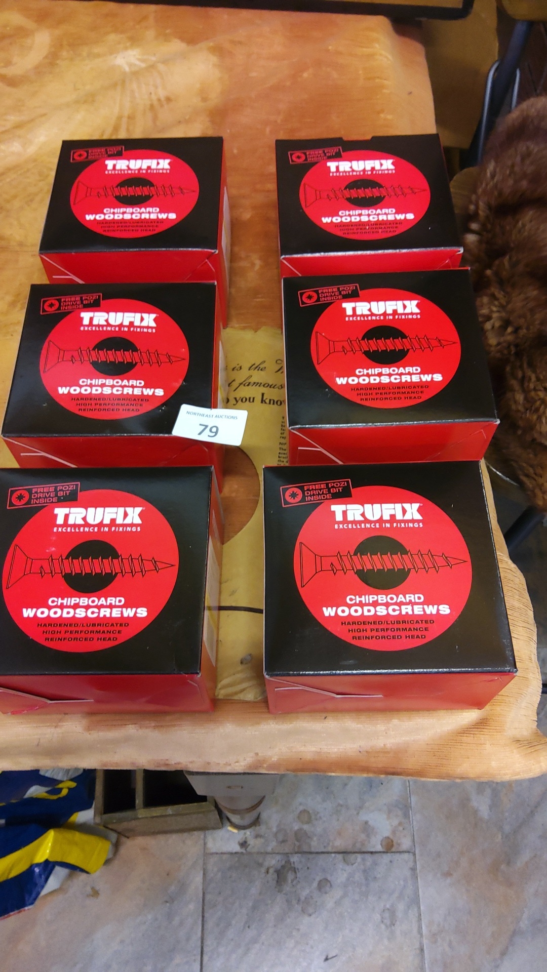 Six sealed boxes of Trufix "Excellence in Fixings" chipboard woodscrews, hardened and lubricated with reinforced heads, each box including a free Pozi drive bit.
