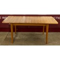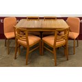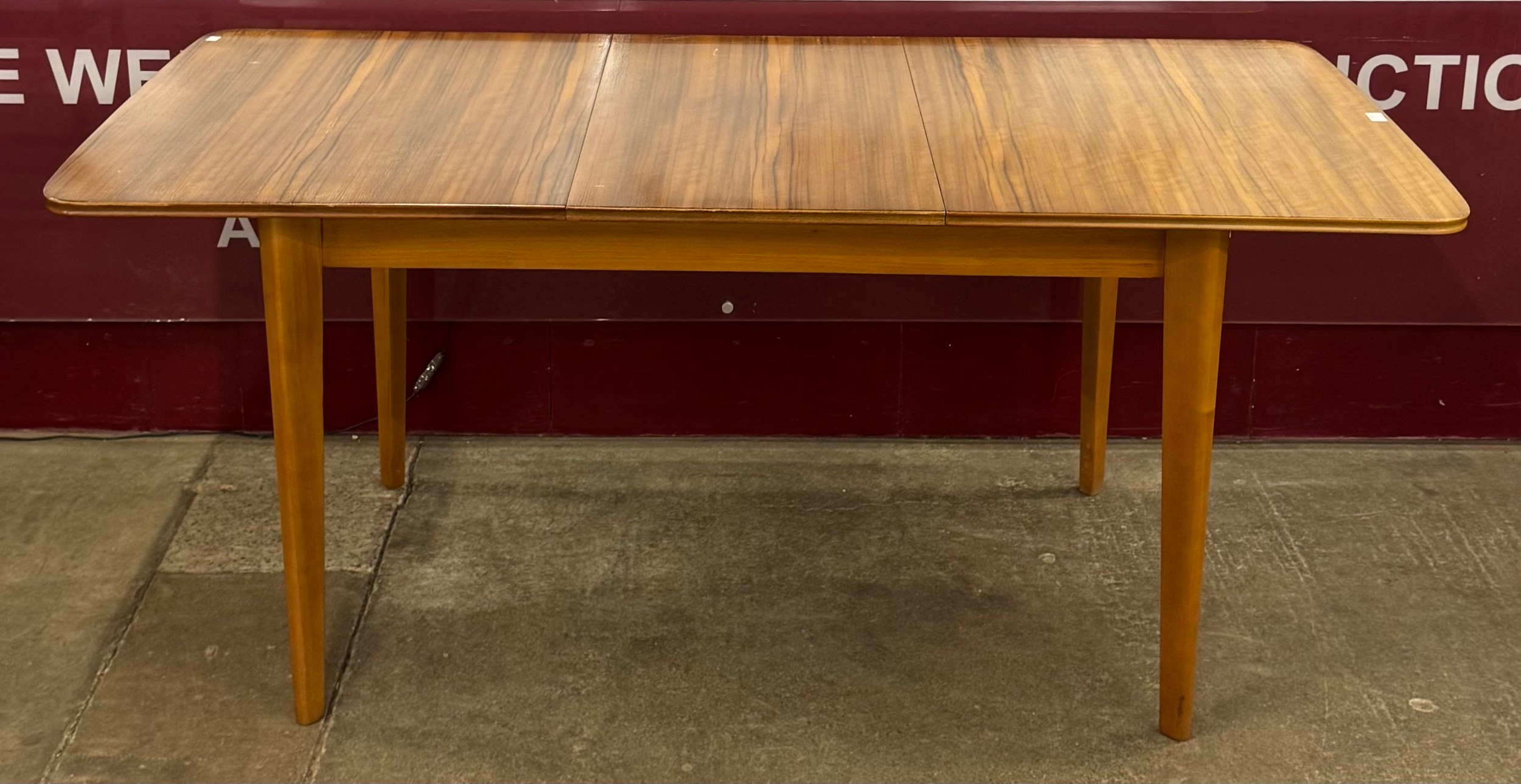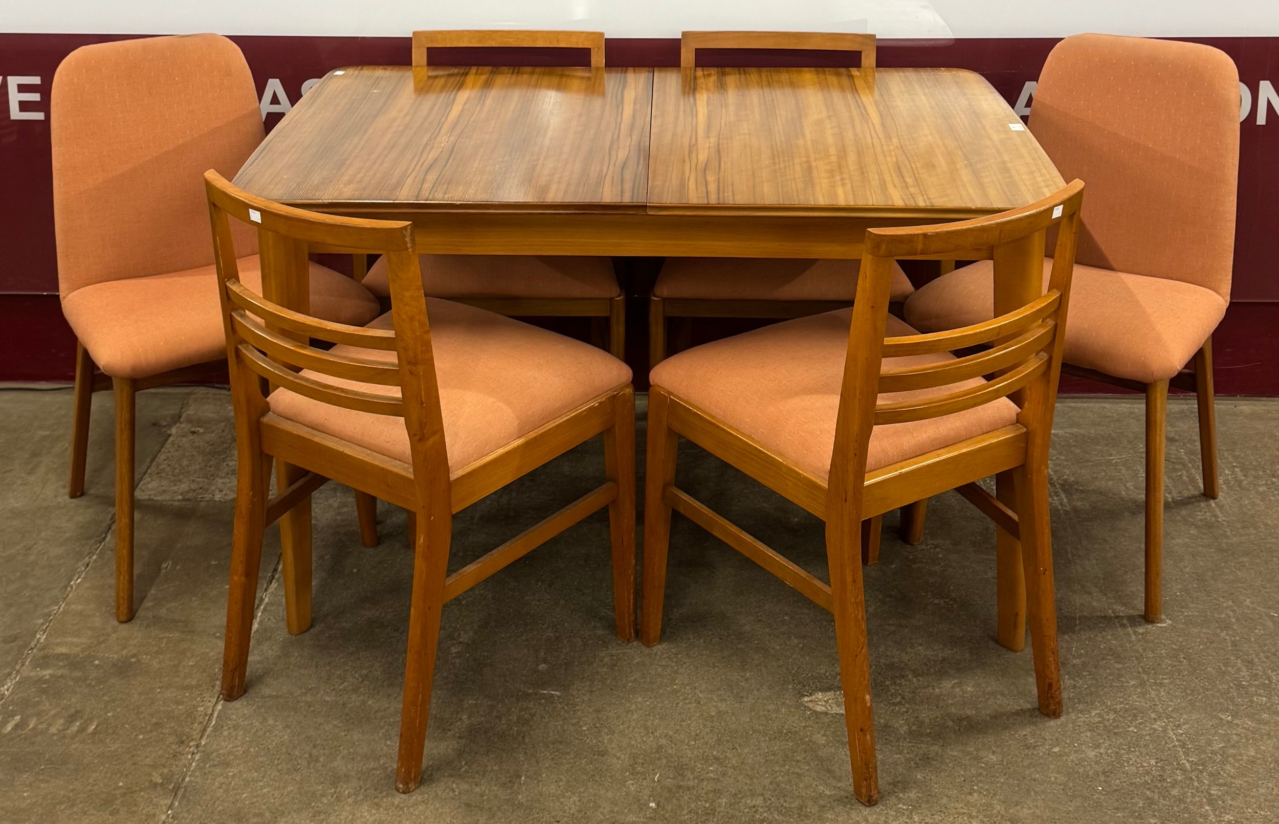 A walnut rectangular extending dining table and six chairs