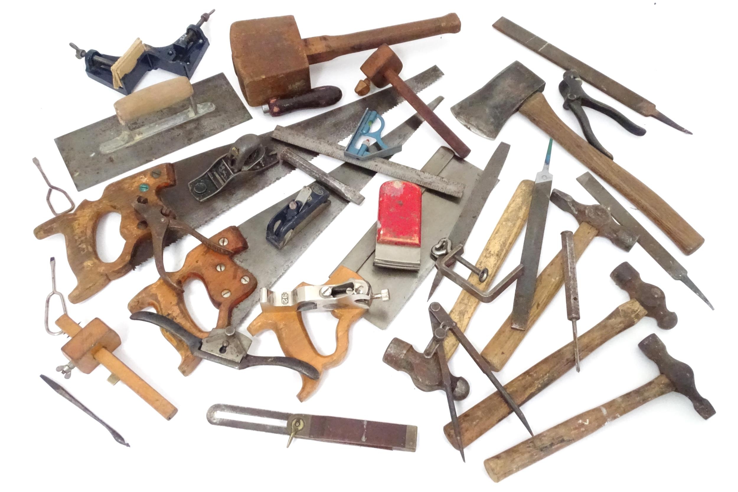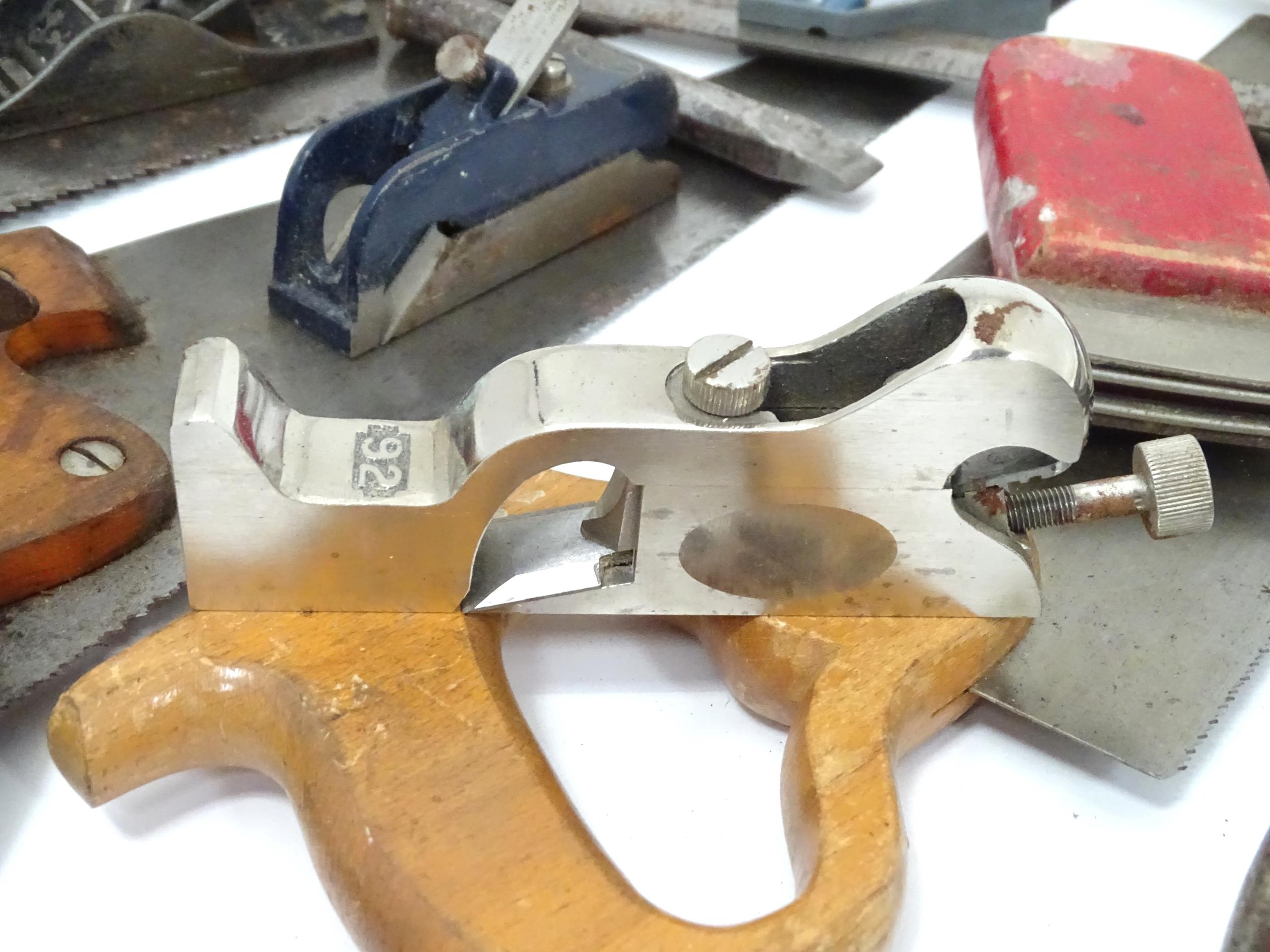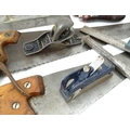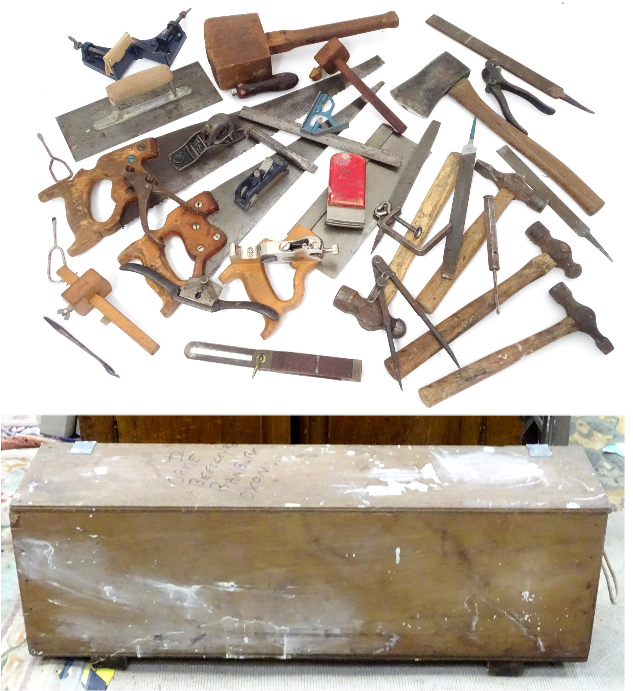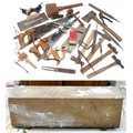 Workshop Tools : a carpenter's toolbox containing a quantity of hand saws, bullnose planes, spoke shave, hammers etc. The box approx 39" wide