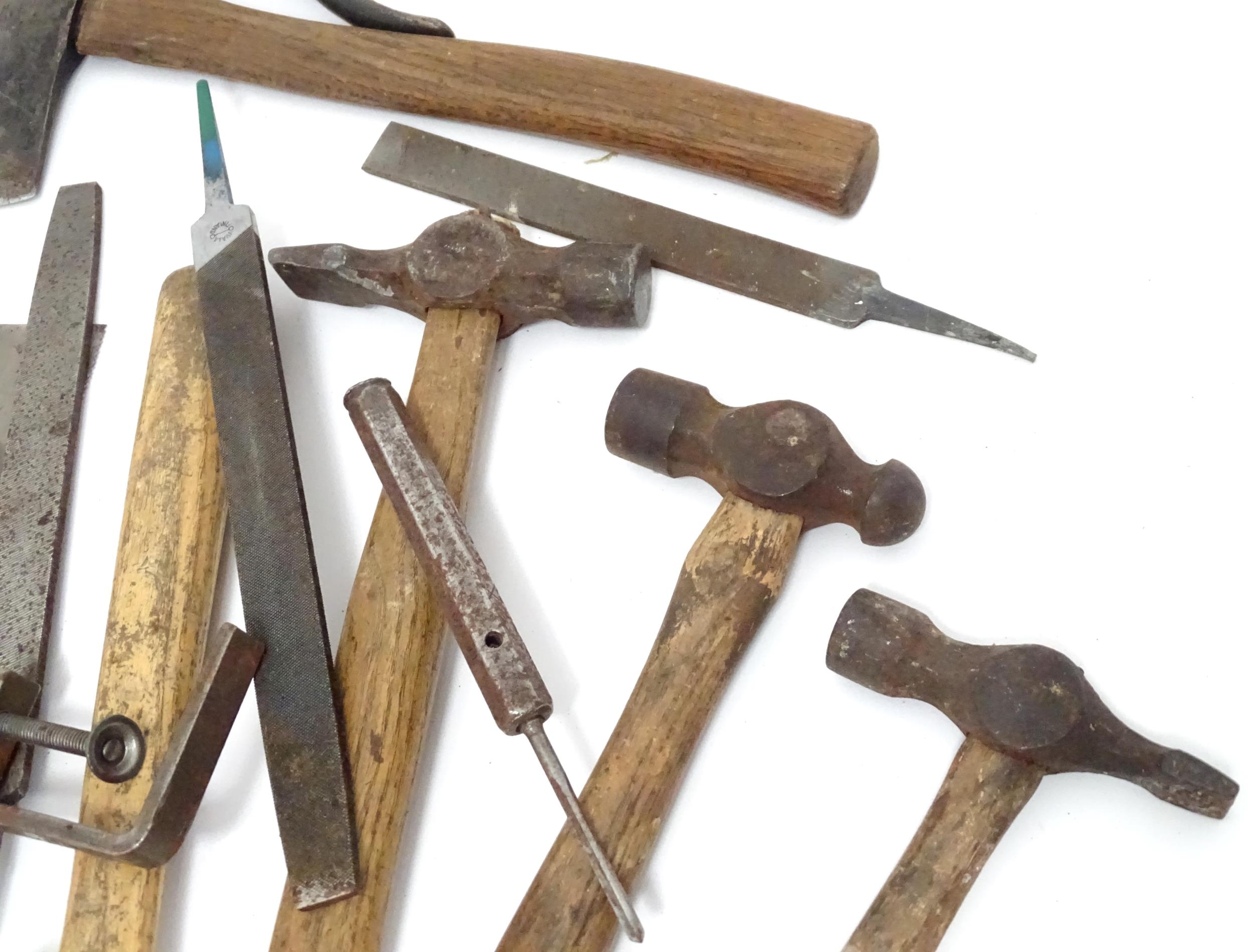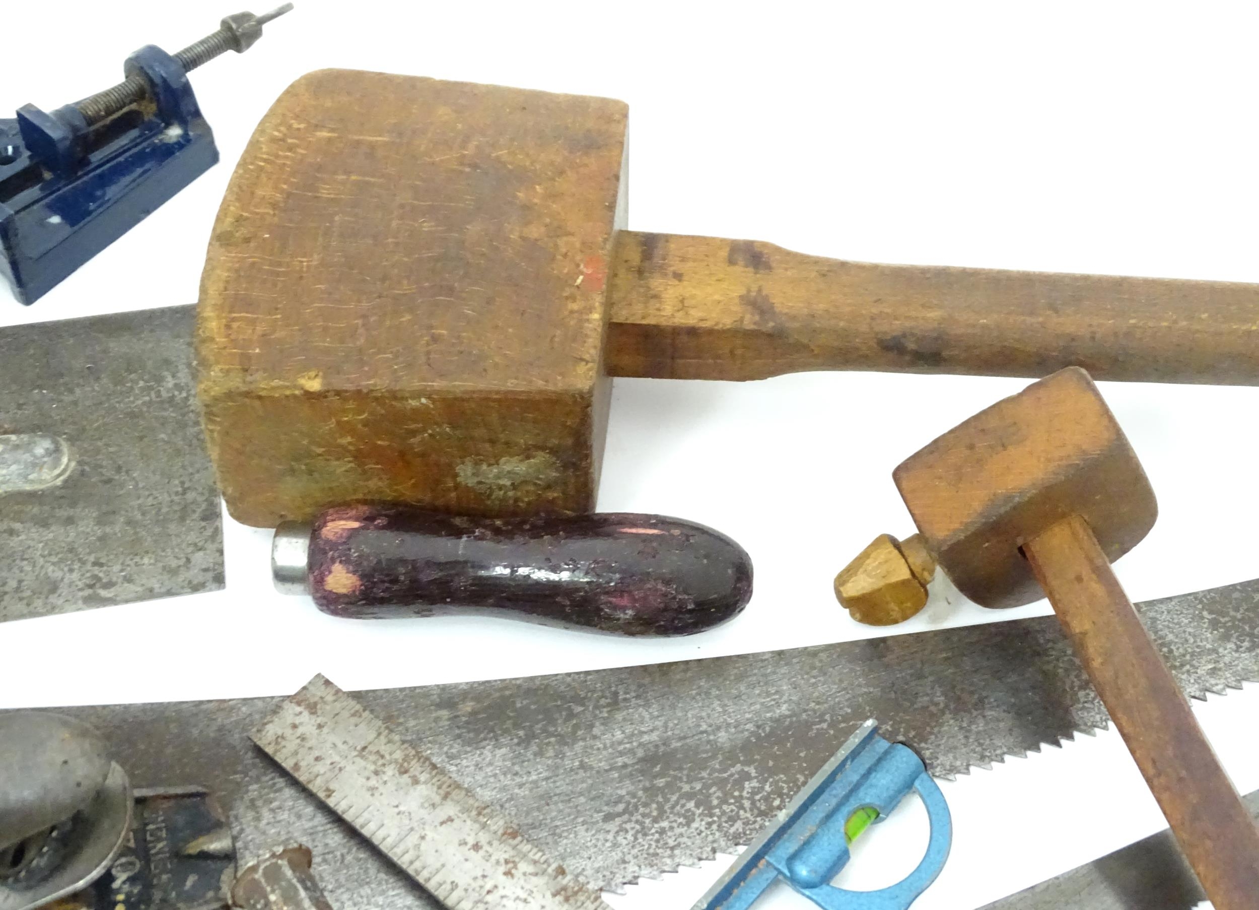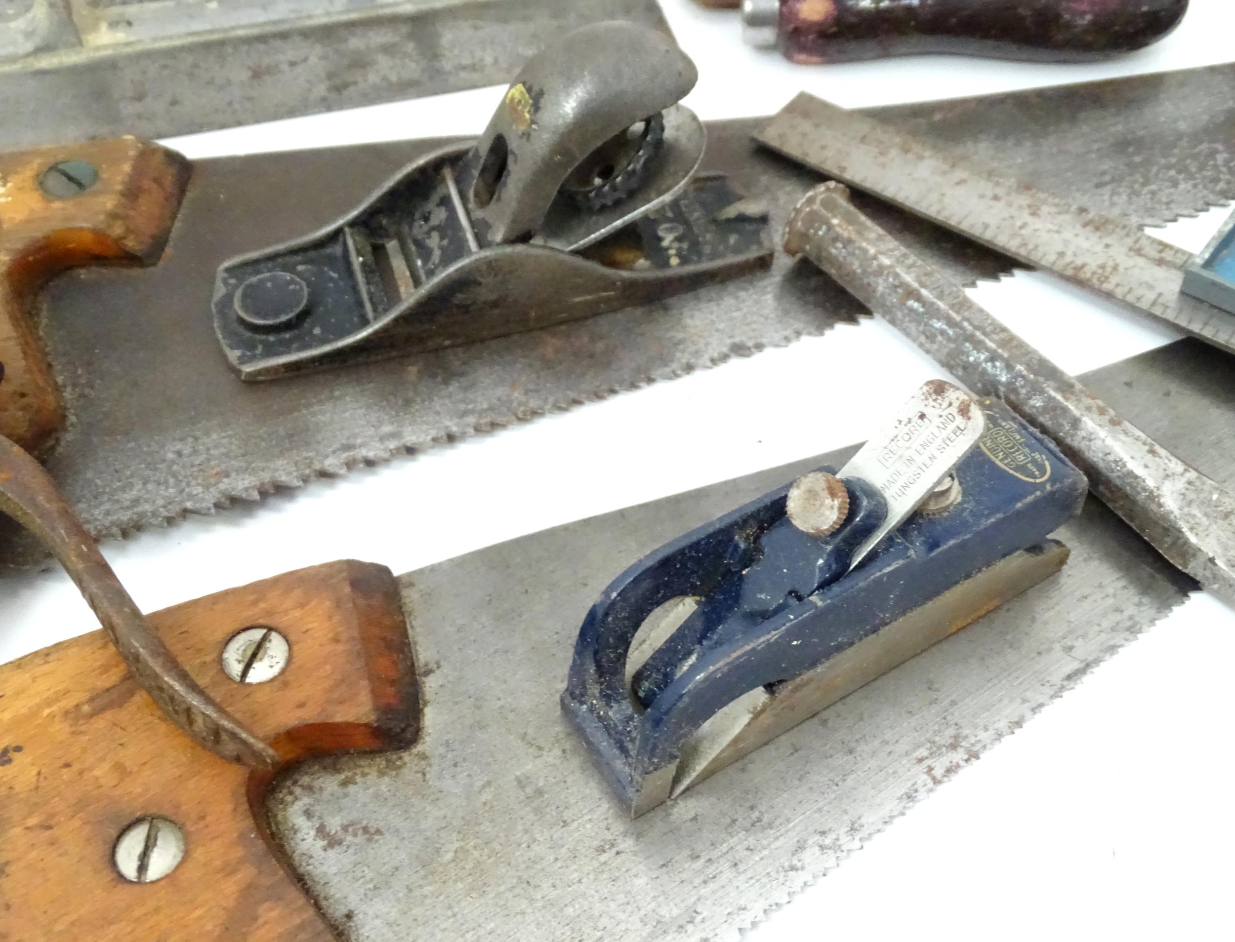 Workshop Tools : a carpenter's toolbox containing a quantity of hand saws, bullnose planes, spoke shave, hammers etc. The box approx 39" wide