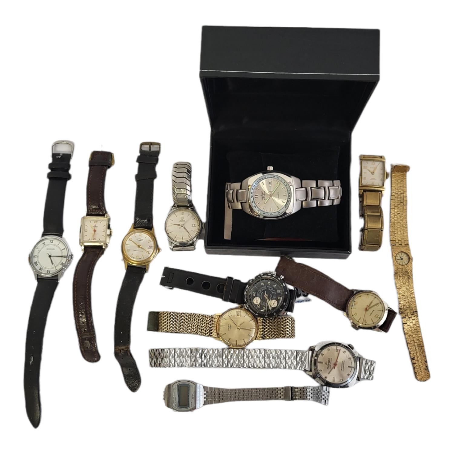 Together with eleven other wristwatches to include Buren Grand Prix, Timex, Newmark, Rotary and others, on stainless steel and leather straps.