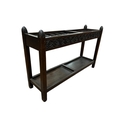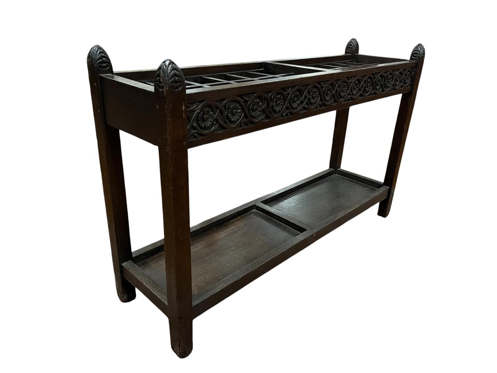 A VINTAGE GOTHIC STYLE OAK TWENTY-FOUR COMPARTMENT STICK STAND the foliate and flowerhead carved apron on square moulded legs joined by an under tier 80cm (h) x 127cm (w) x 36cm (d)