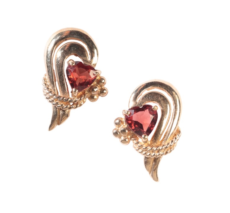 in 9ct gold, each set with a heart shape garnet held in claw settings, to a stylised design with rope swags, full British hallmarks, 1.7cm, (gross weight - c.2.4g), accompanied by a box