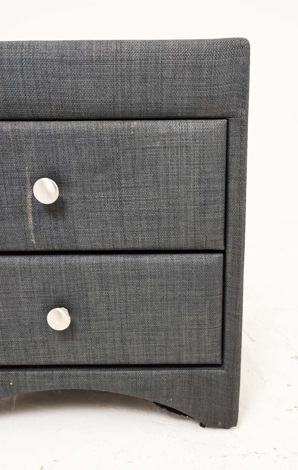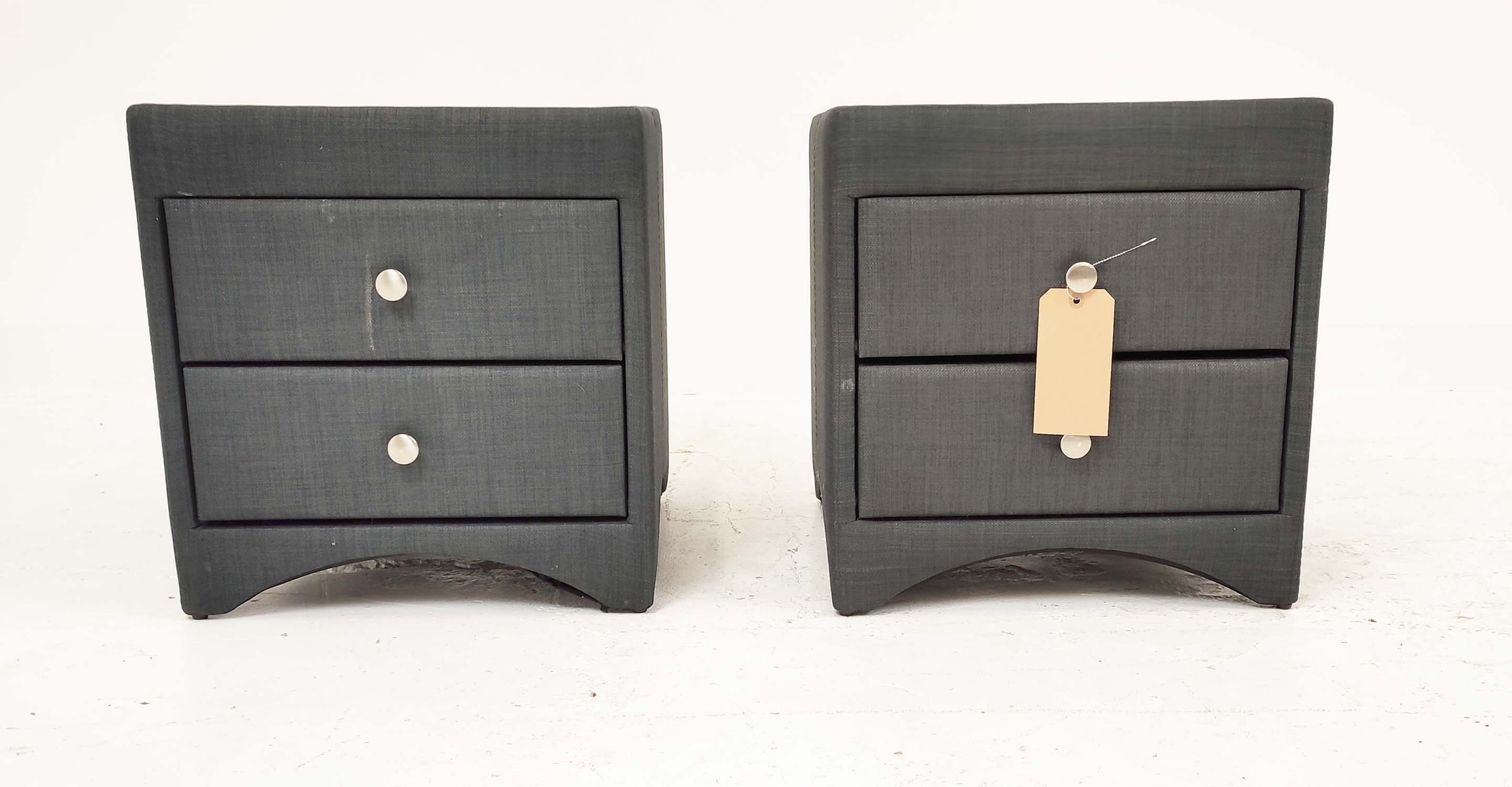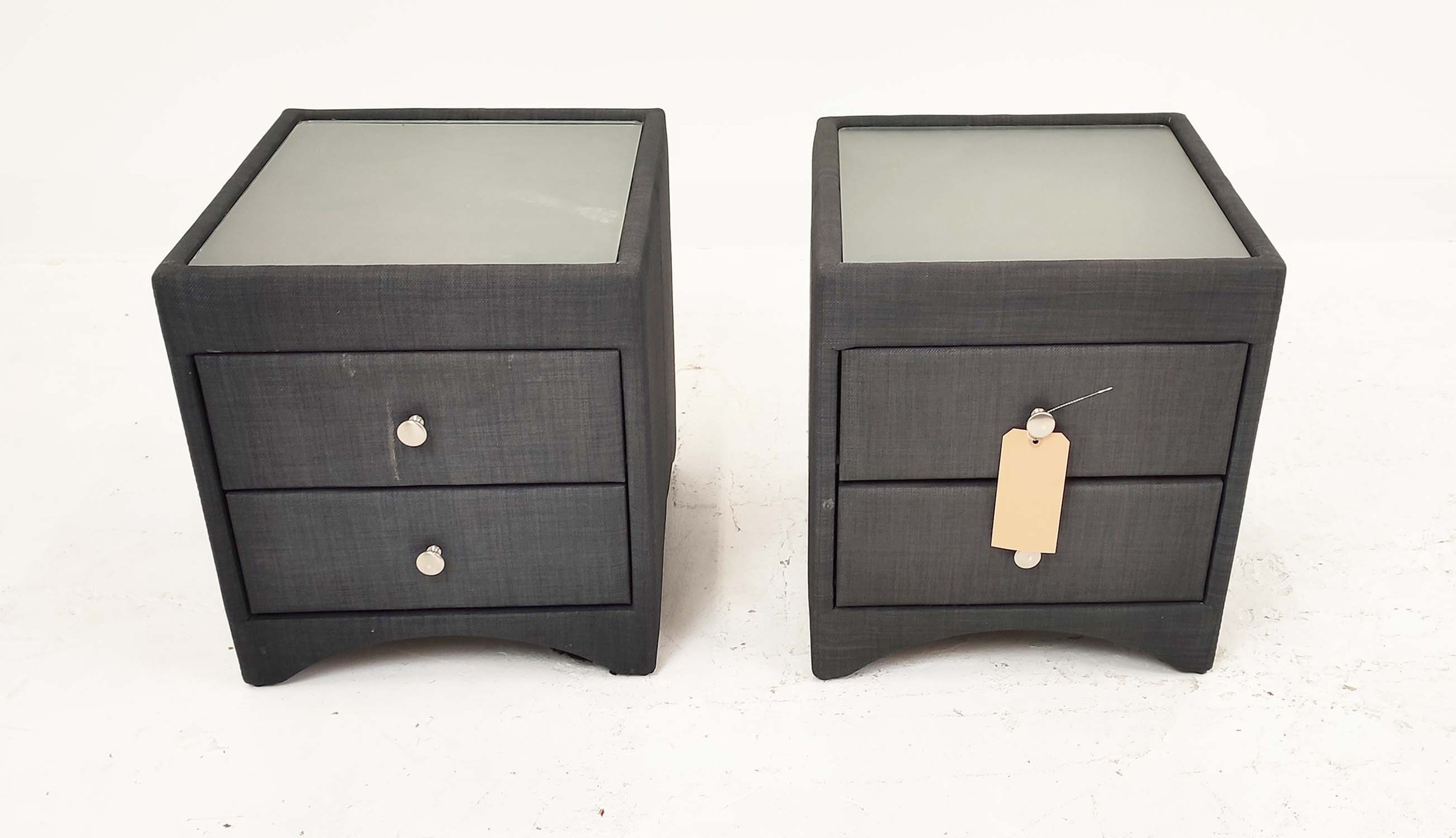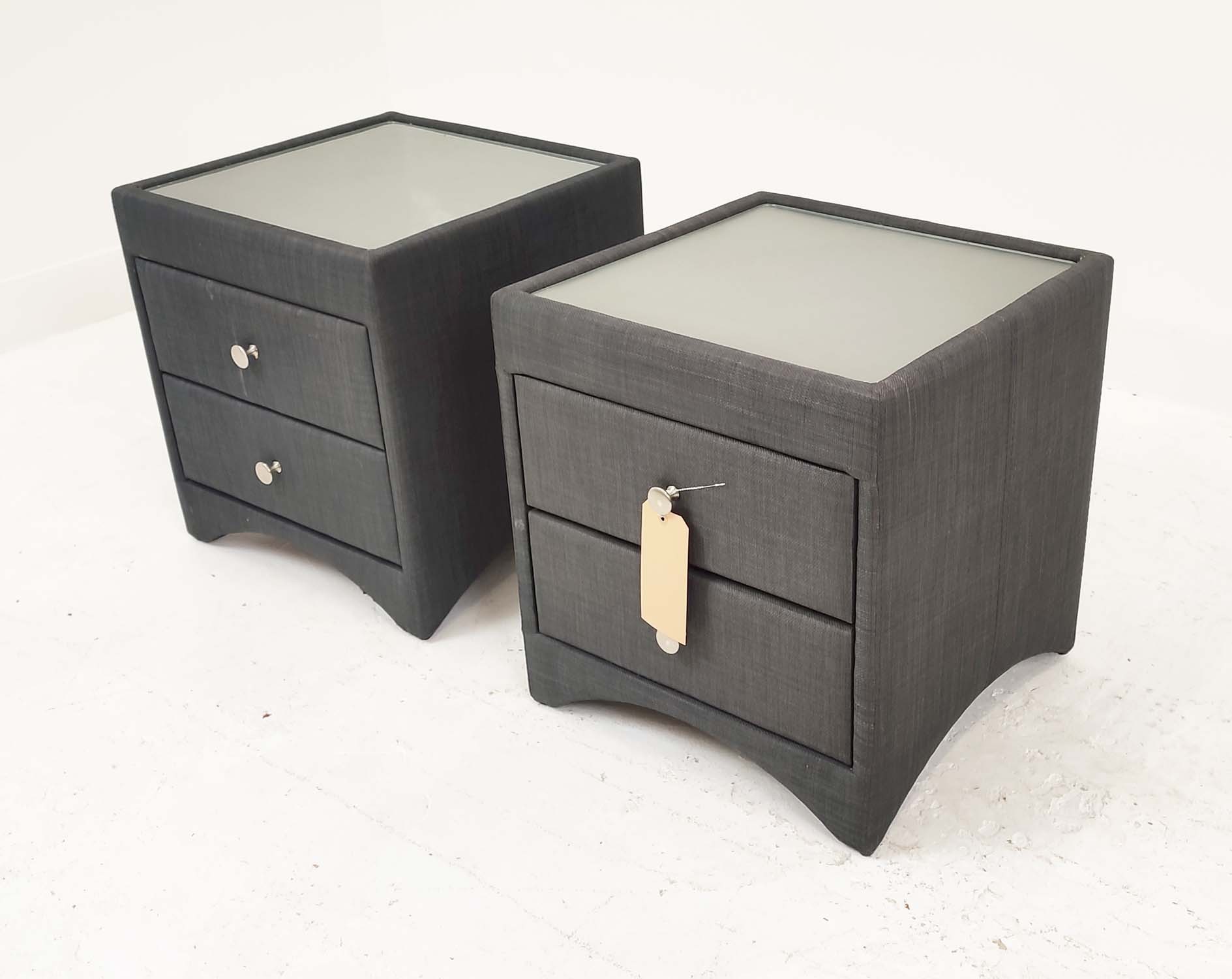 BEDSIDE CHESTS, a pair, grey fabric with two drawers and glass tops, 49cm H x 45cm W x 45cm D. (2)