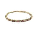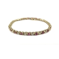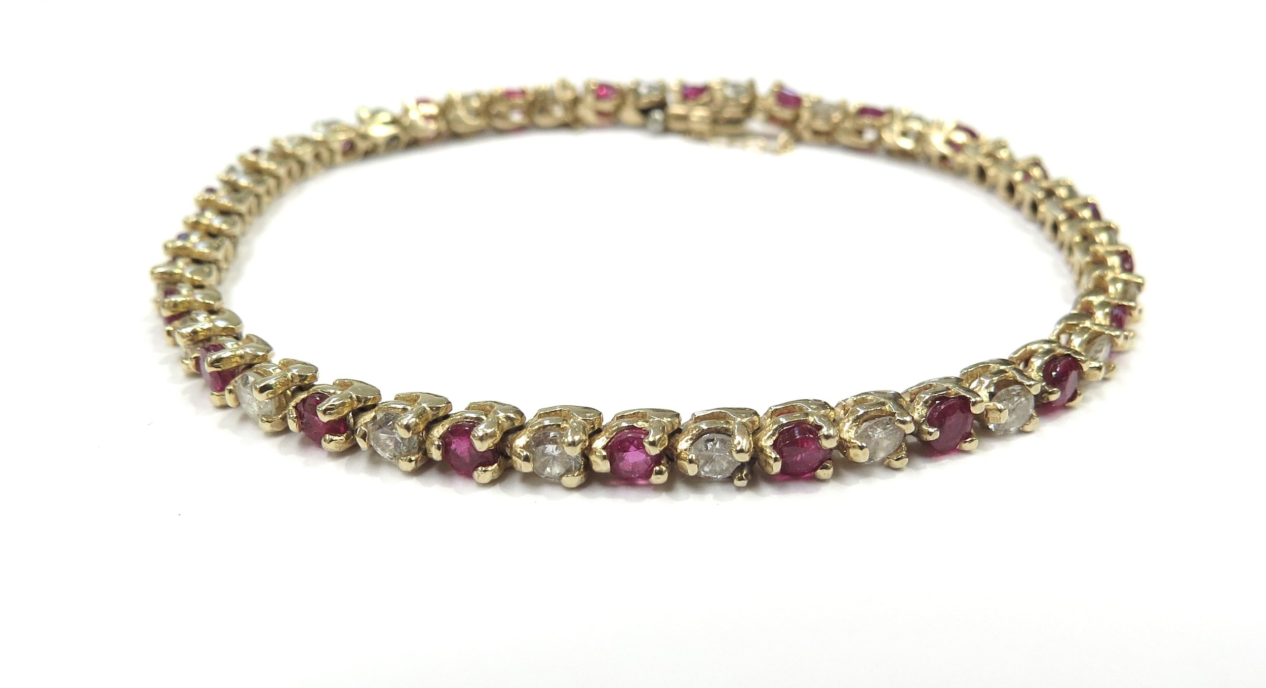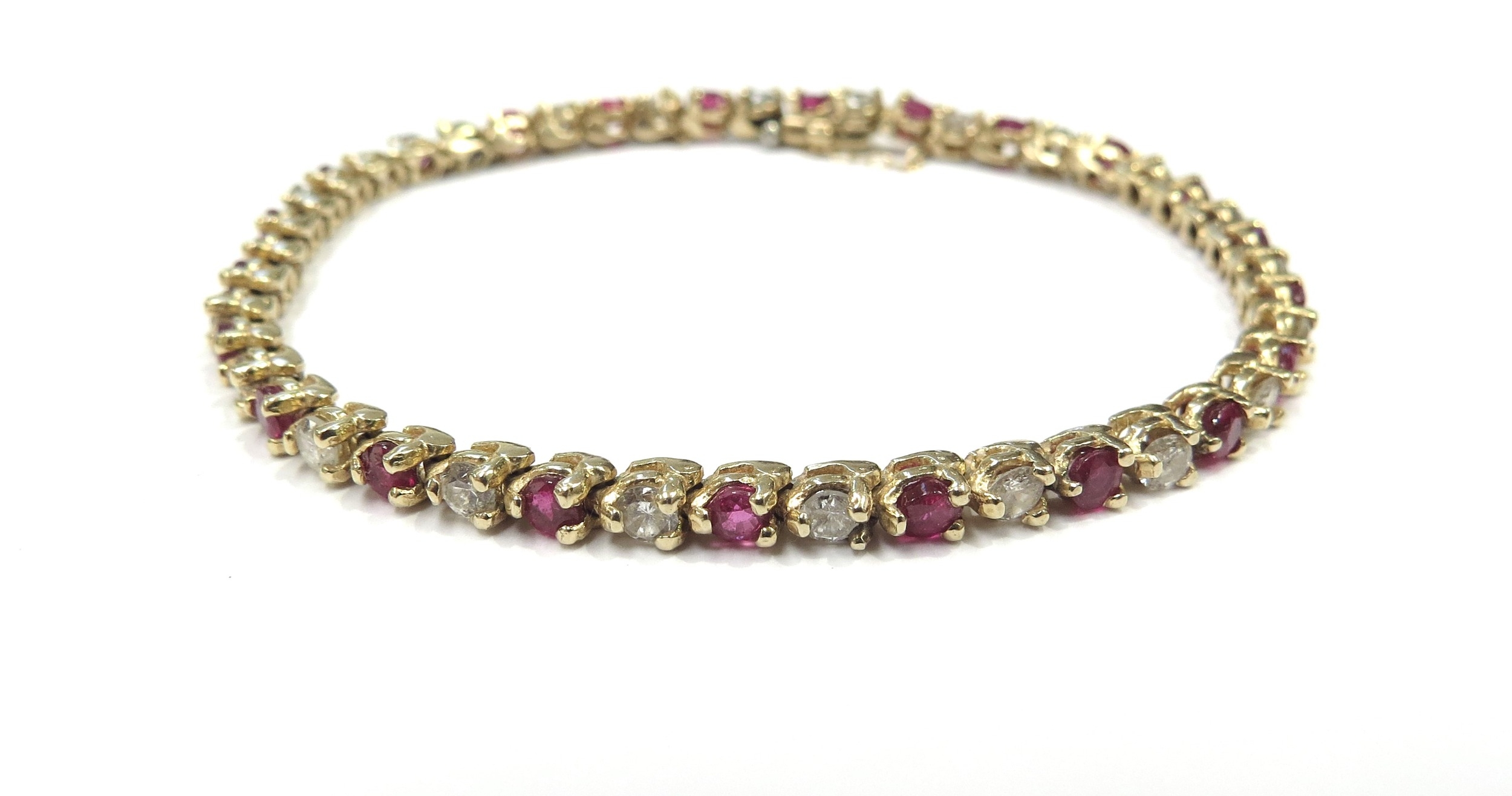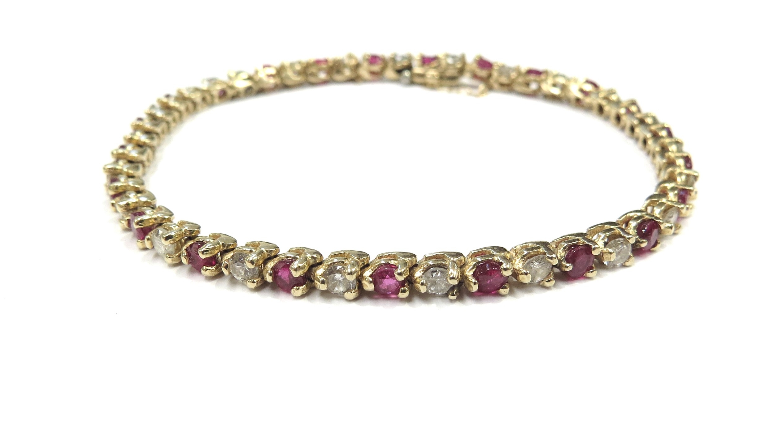 A yellow gold ruby and diamond line bracelet, 3.22ct approx ruby total, 1.84ct approx diamond total, unmarked 14k gold, 18cm long, 10.6g