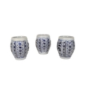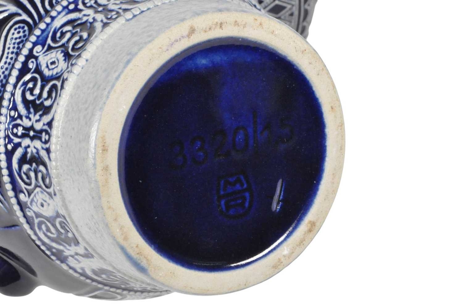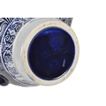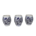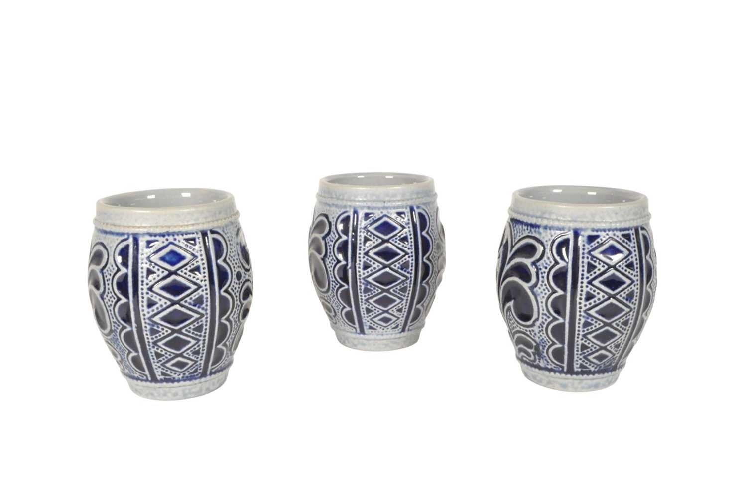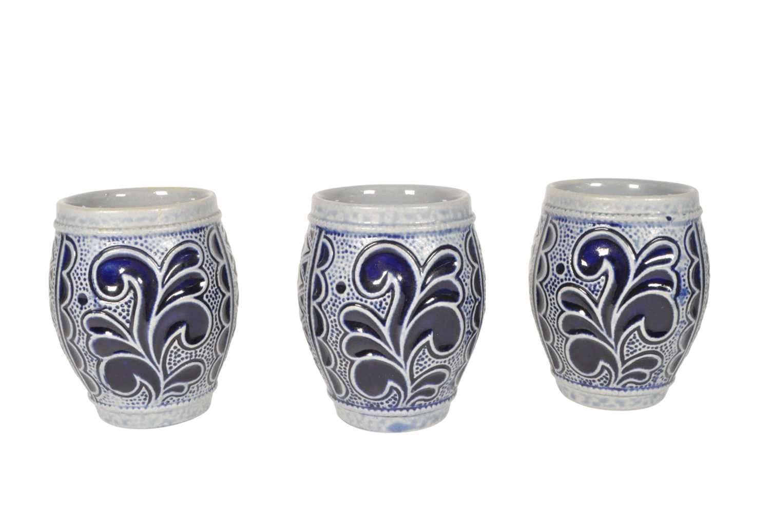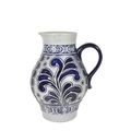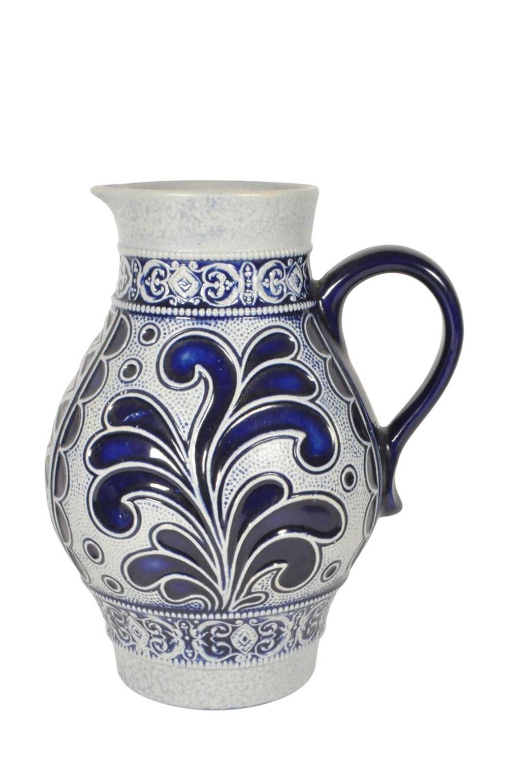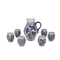 West German mid century ceramic jug with cups / lemonade set. Comprising of large water jug, with six matching handleless cups. Featuring floral relief in a blue field with a white mottled background. 3320 / 15