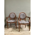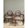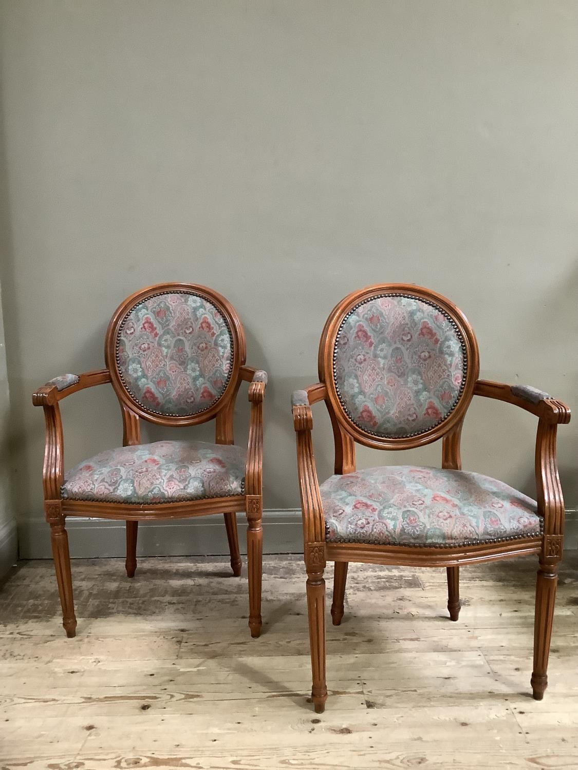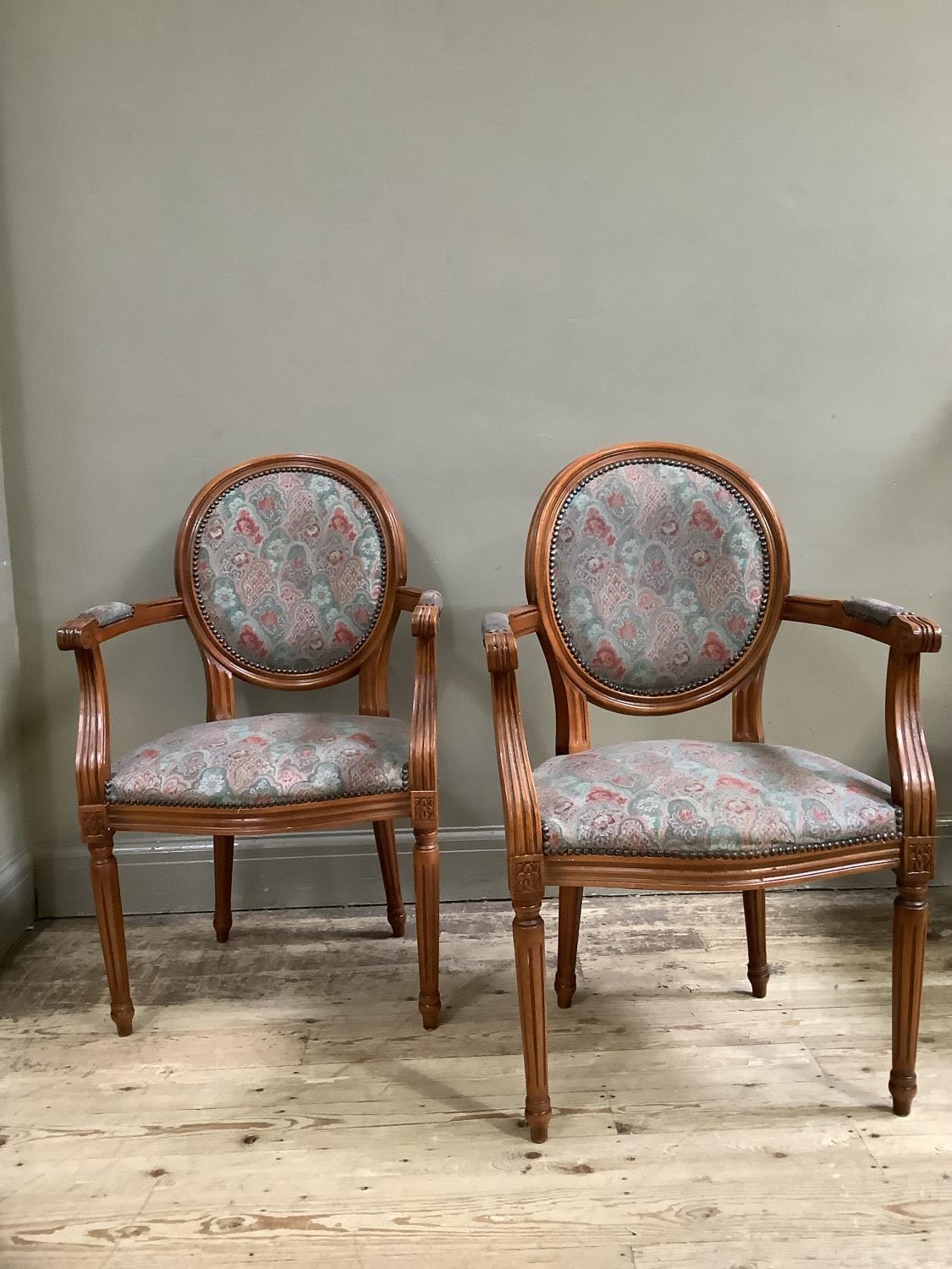 A pair of reproduction cherry wood armchairs with upholstered backs and seats