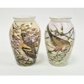 Two limited edition bone china oviform vases painted with birds by Helen Halloran, late 20th century, printed black marks, decorated in Worcester, each signed and titled in black enamels, with box, signed and numbered certificate comprising: Linnet in Spring no. 1/1 and Winter Brambling no. 1/1, 2017, initialled H.H., 9.6 cm high (2)