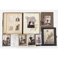 Victorian brown leather CDV photograph album, partly filled with black and white family photographic portraits, the cover with a floral sinuous design
