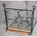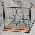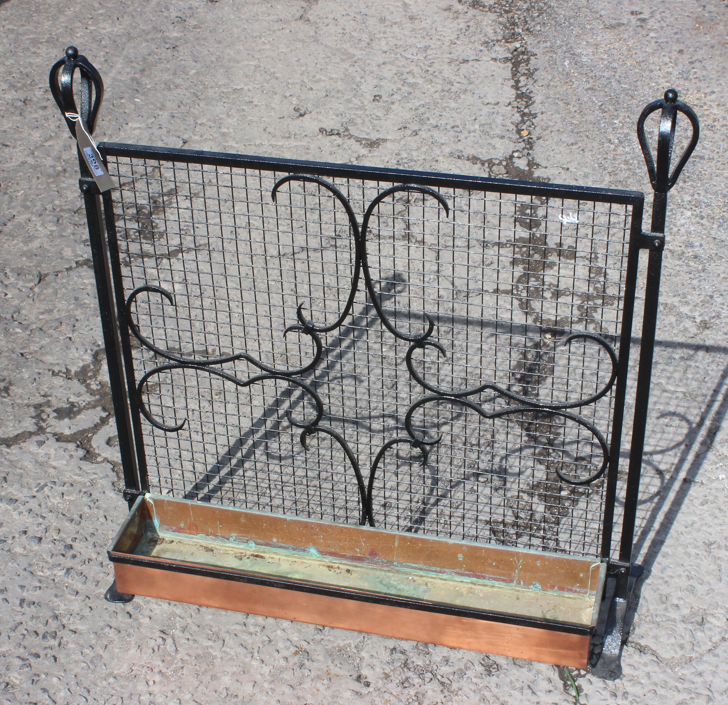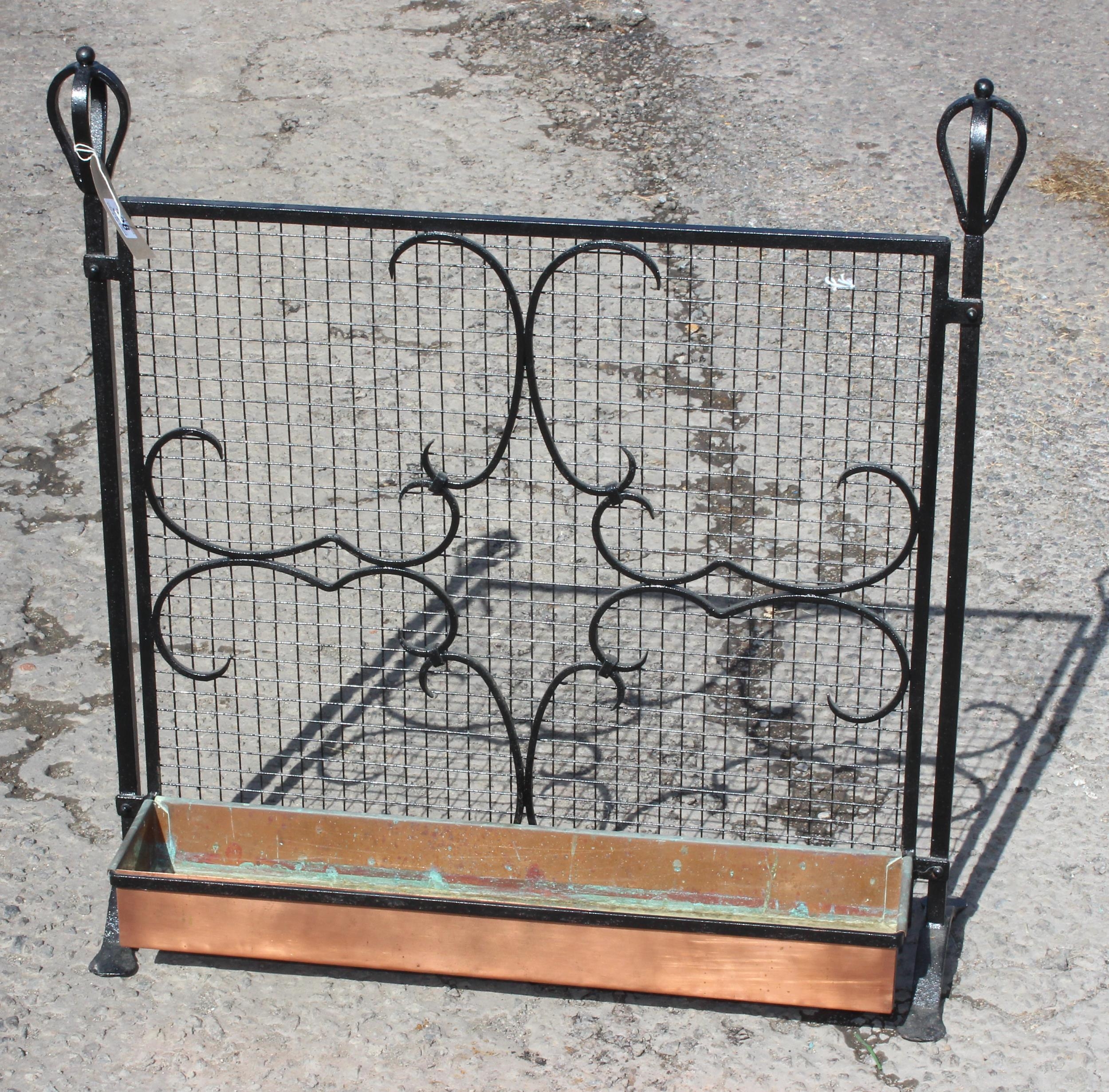 An unusual blacksmith made copper planter under wrought iron grill with scrolled designs, approx 32" high
