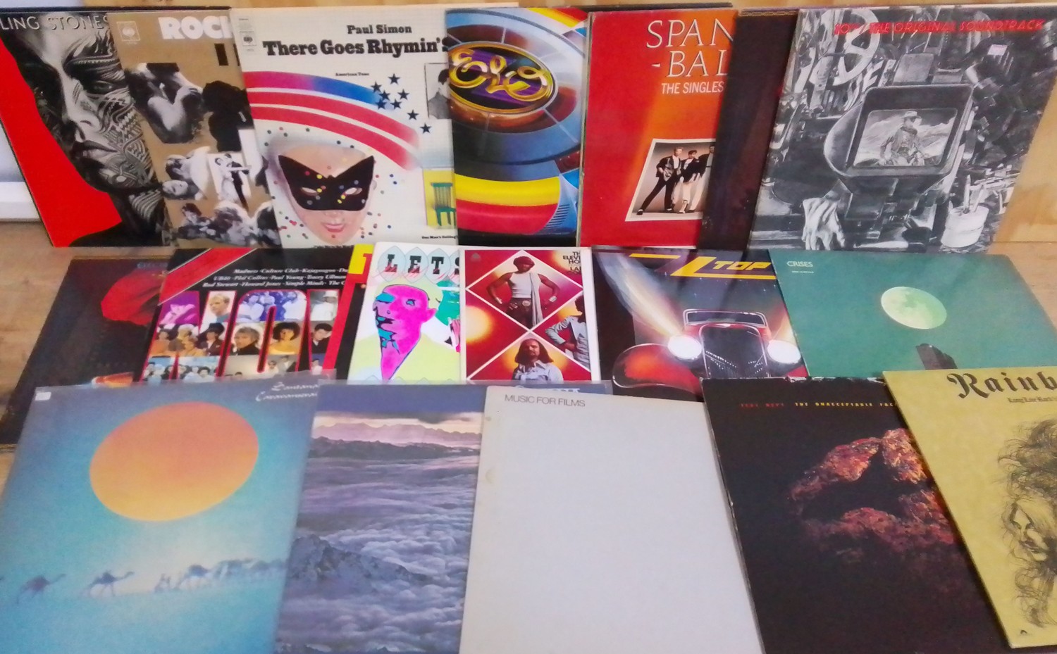 A selection of vinyl LP records including Santana, Mike Oldfield, ZZ Top, The Last Poets, Rolling Stones, Rainbow, Brian Eno and more.