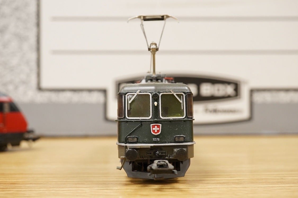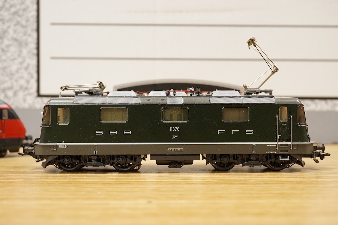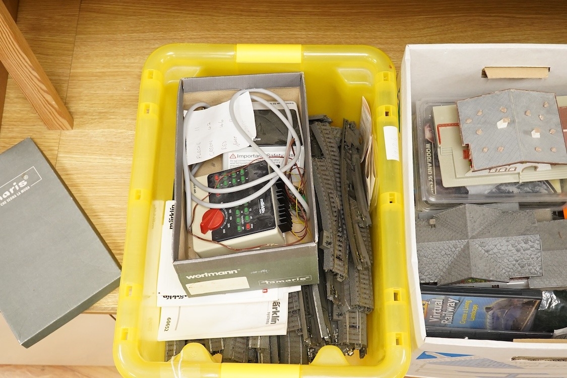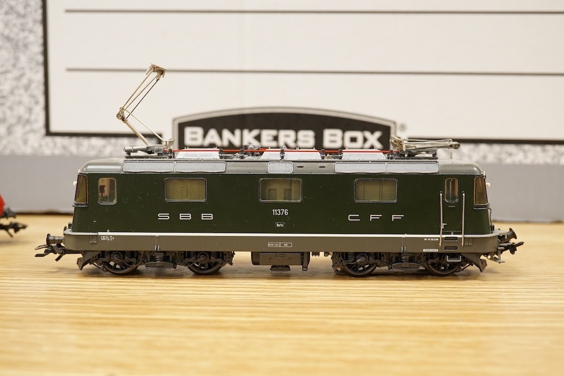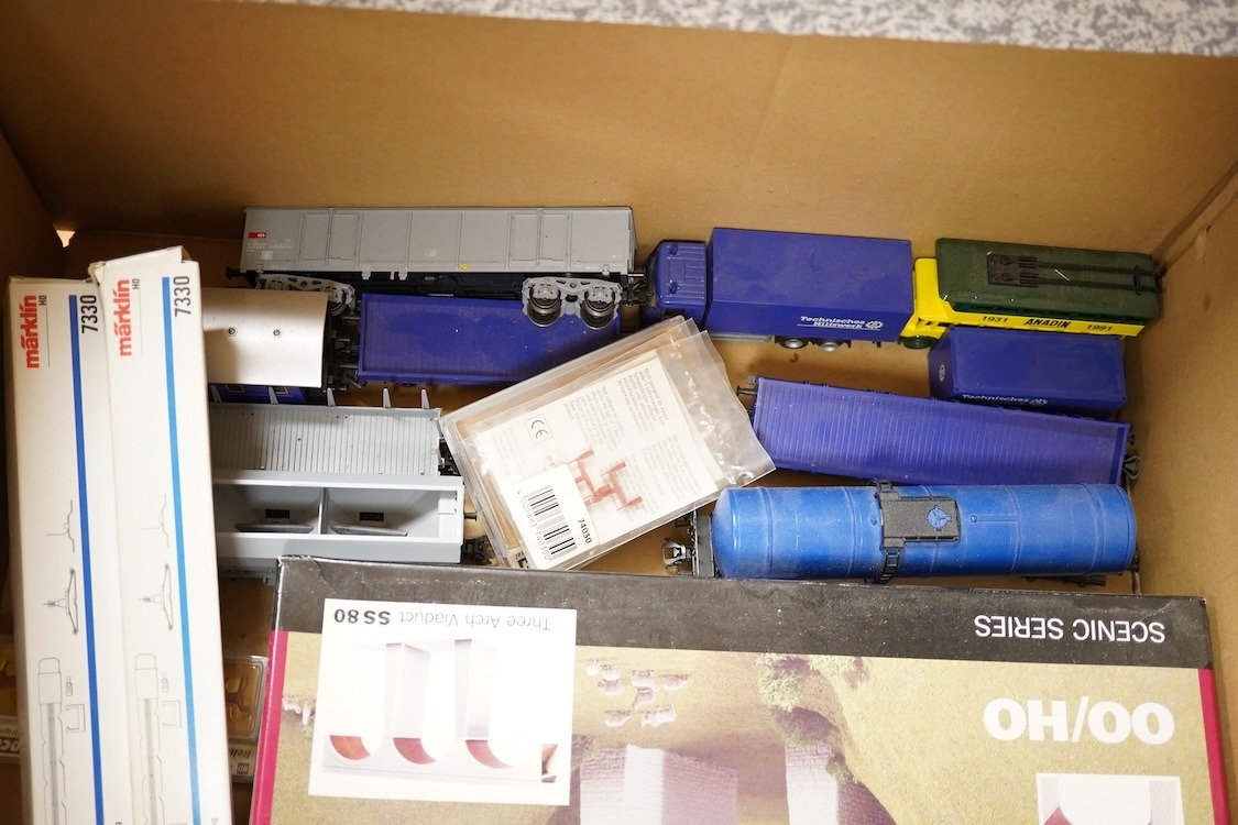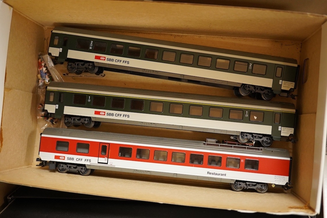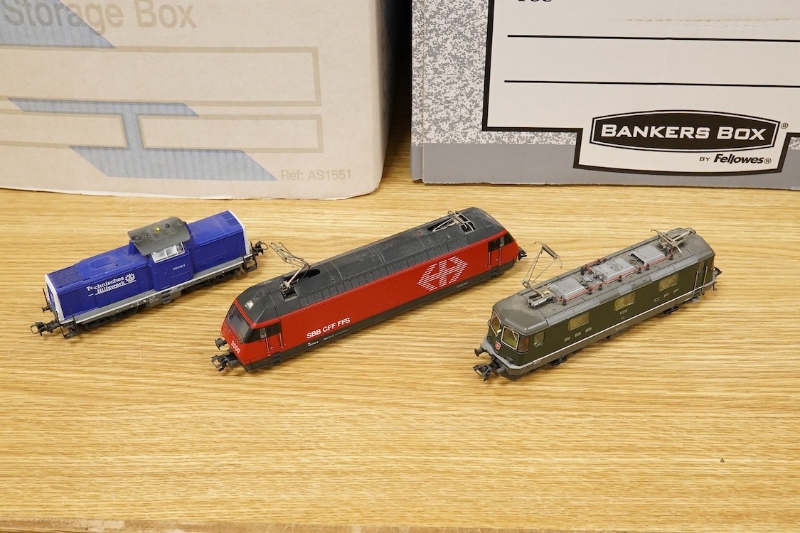 A collection of Marklin HO gauge Swiss railway including three SBB CFF FFS Bo-Bo locomotives; two pantograph electric locomotives and a diesel, three bogie coaches, nine freight wagons, an unconstructed Wills three arch viaduct kit, controllers, constructed buildings, a good quantity of track sections including sets of points, etc., scenic modelling accessories, other trackside accessories and manuals, etc.