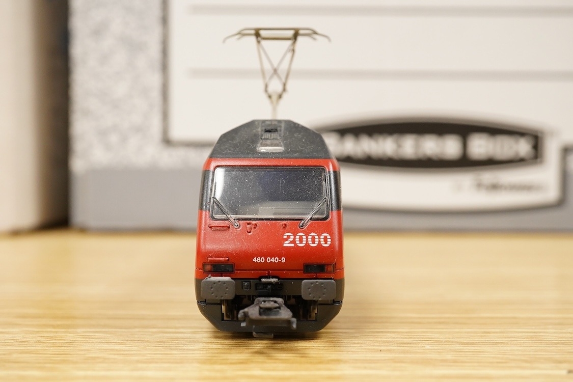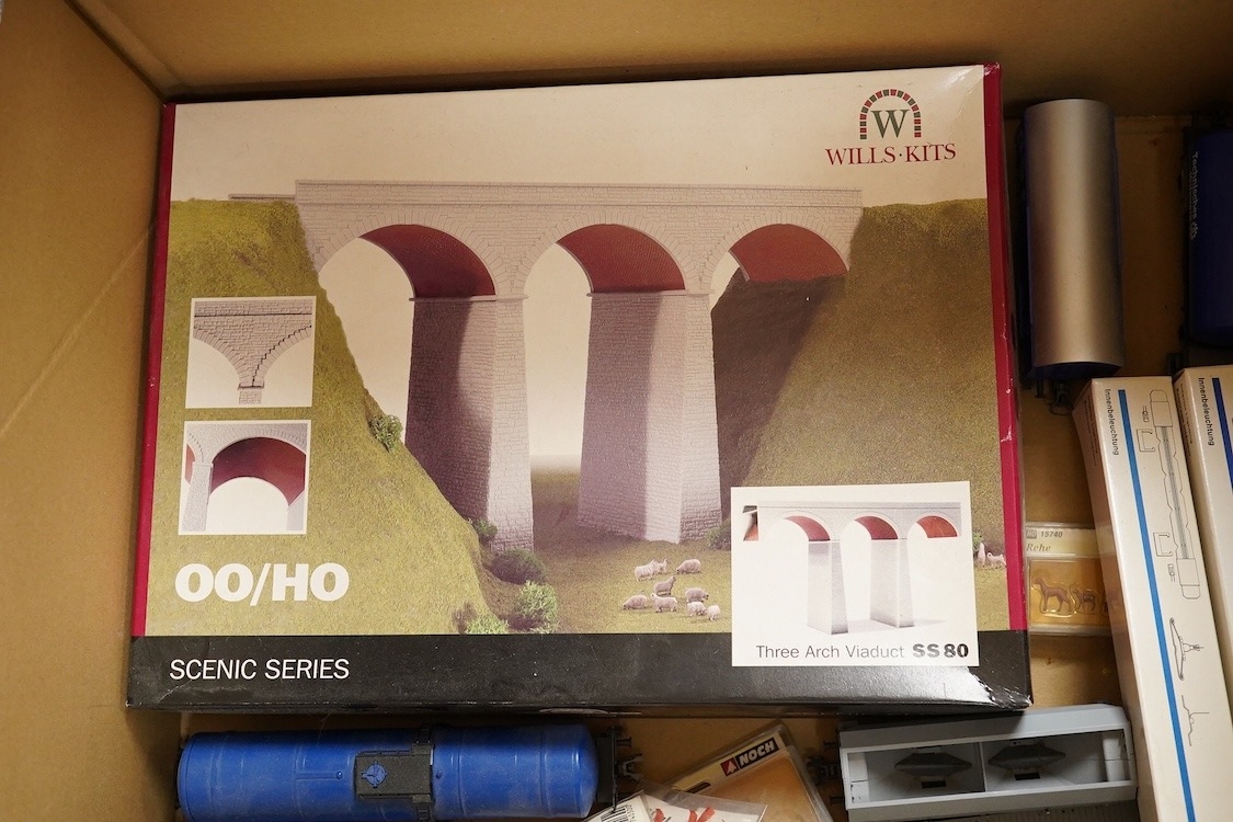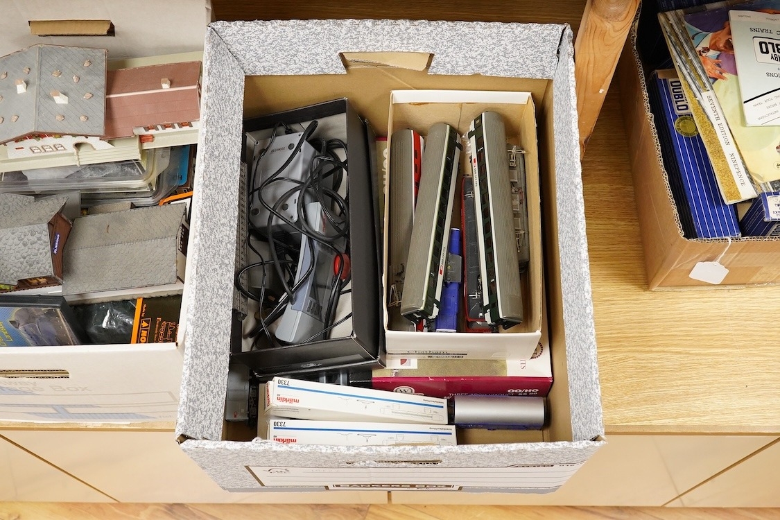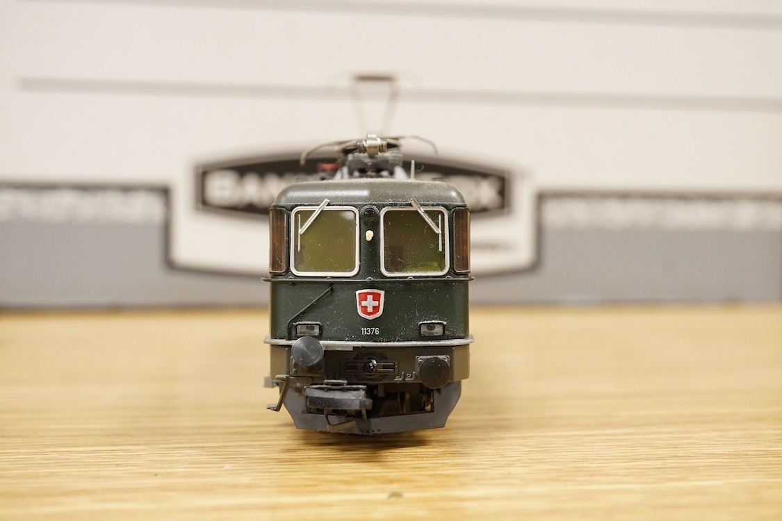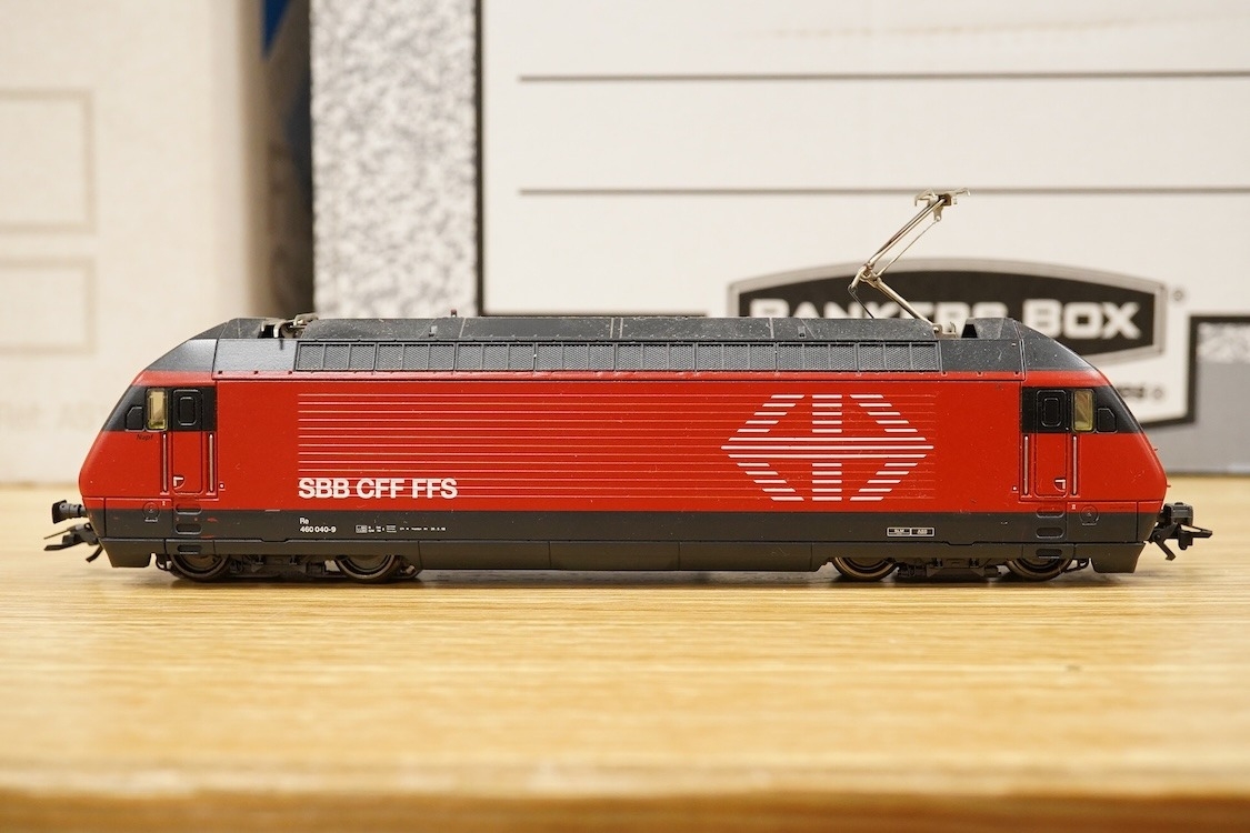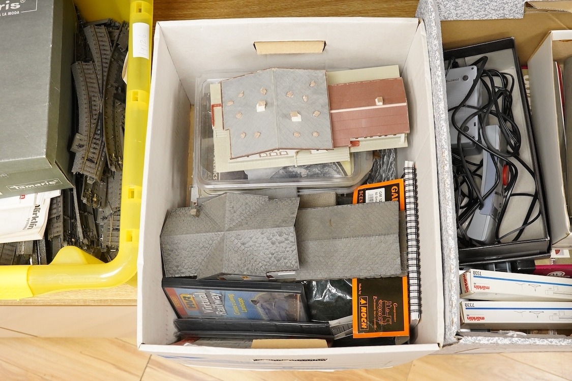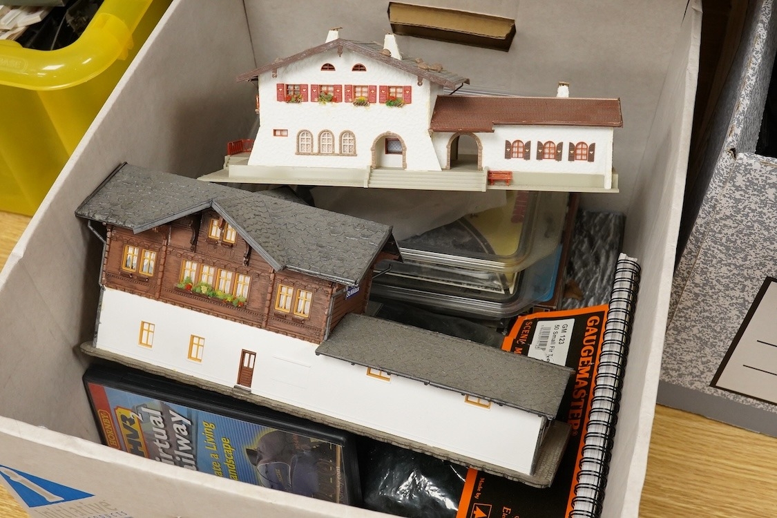 A collection of Marklin HO gauge Swiss railway including three SBB CFF FFS Bo-Bo locomotives; two pantograph electric locomotives and a diesel, three bogie coaches, nine freight wagons, an unconstructed Wills three arch viaduct kit, controllers, constructed buildings, a good quantity of track sections including sets of points, etc., scenic modelling accessories, other trackside accessories and manuals, etc.