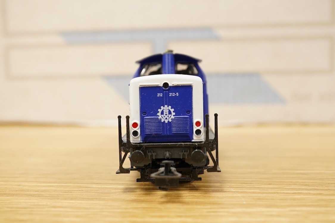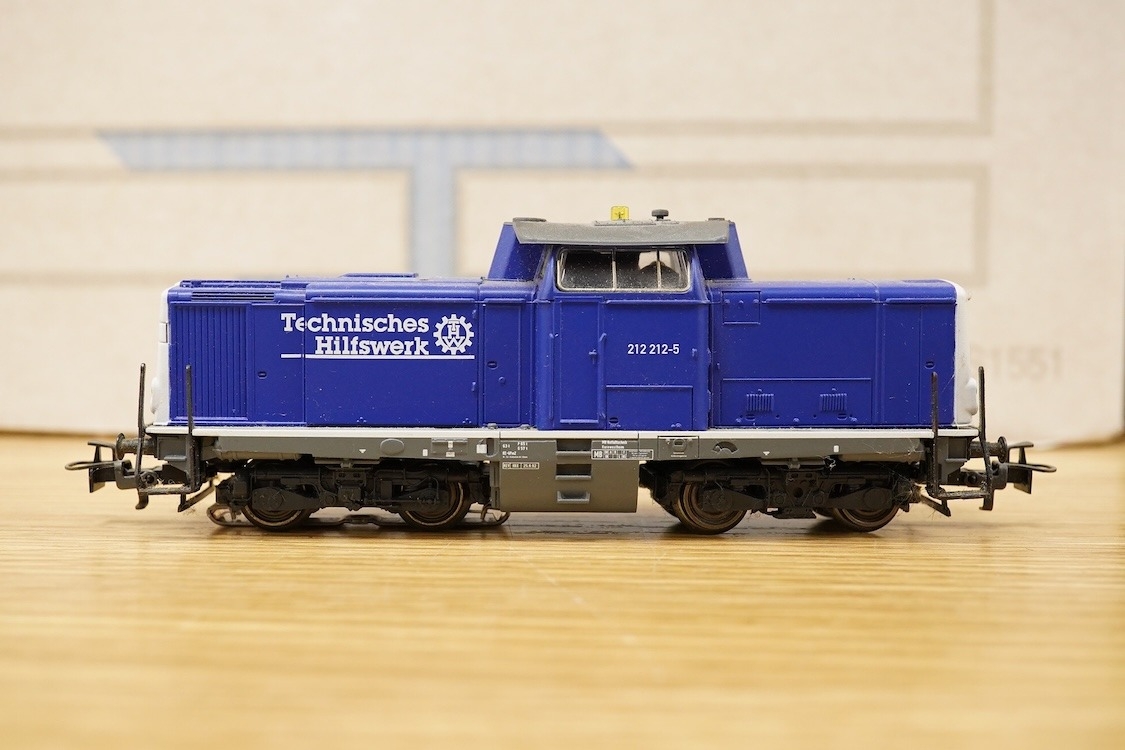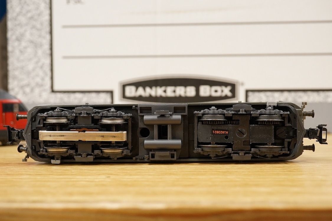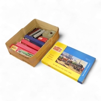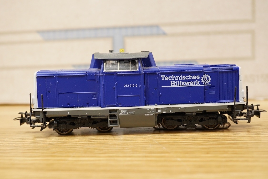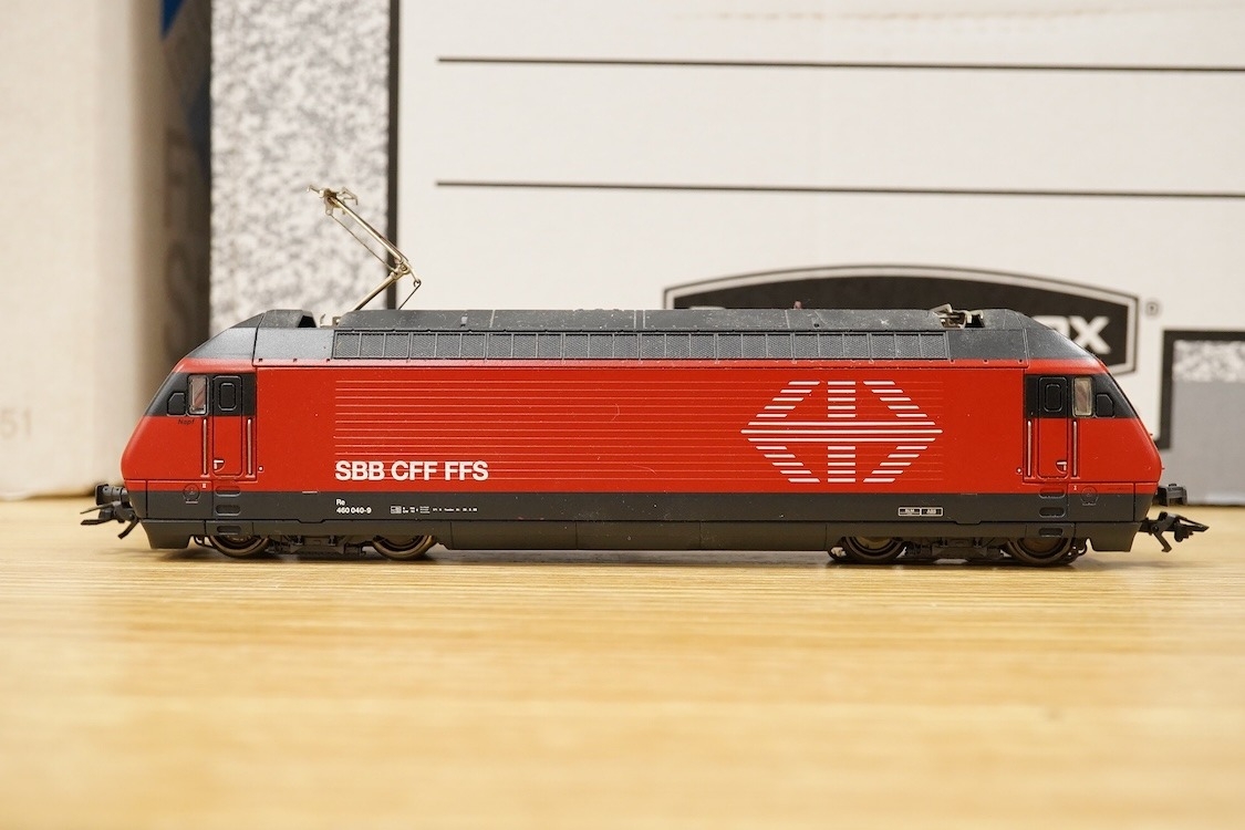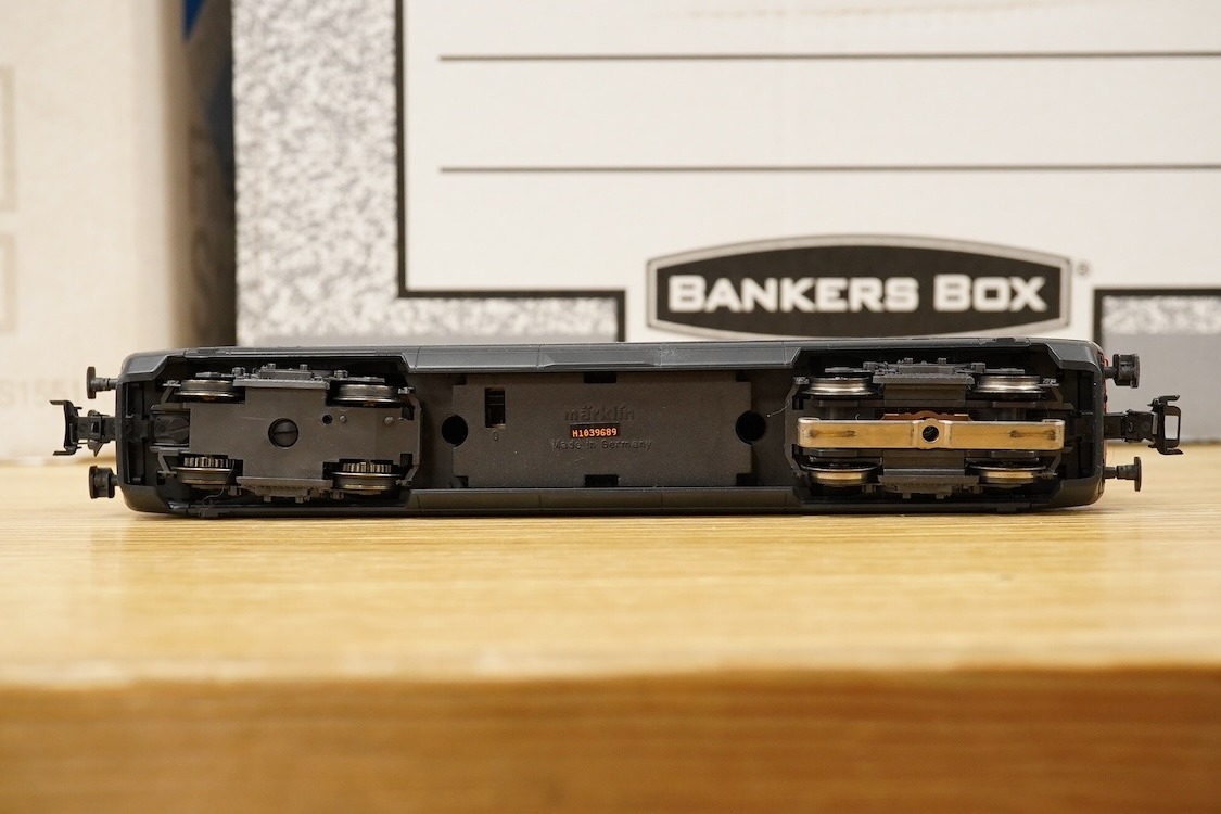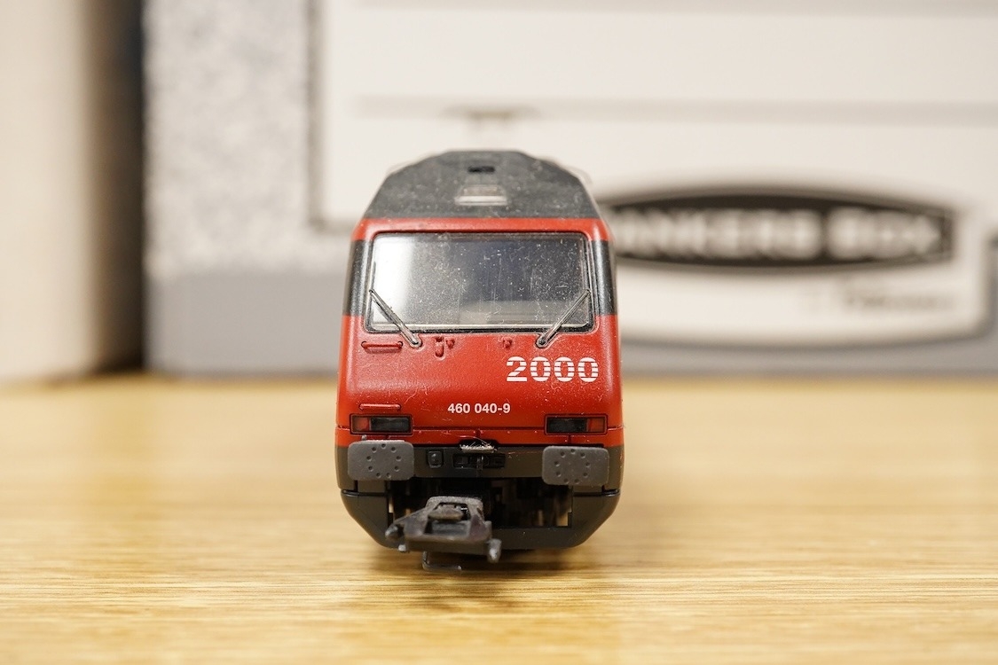 A collection of Marklin HO gauge Swiss railway including three SBB CFF FFS Bo-Bo locomotives; two pantograph electric locomotives and a diesel, three bogie coaches, nine freight wagons, an unconstructed Wills three arch viaduct kit, controllers, constructed buildings, a good quantity of track sections including sets of points, etc., scenic modelling accessories, other trackside accessories and manuals, etc.