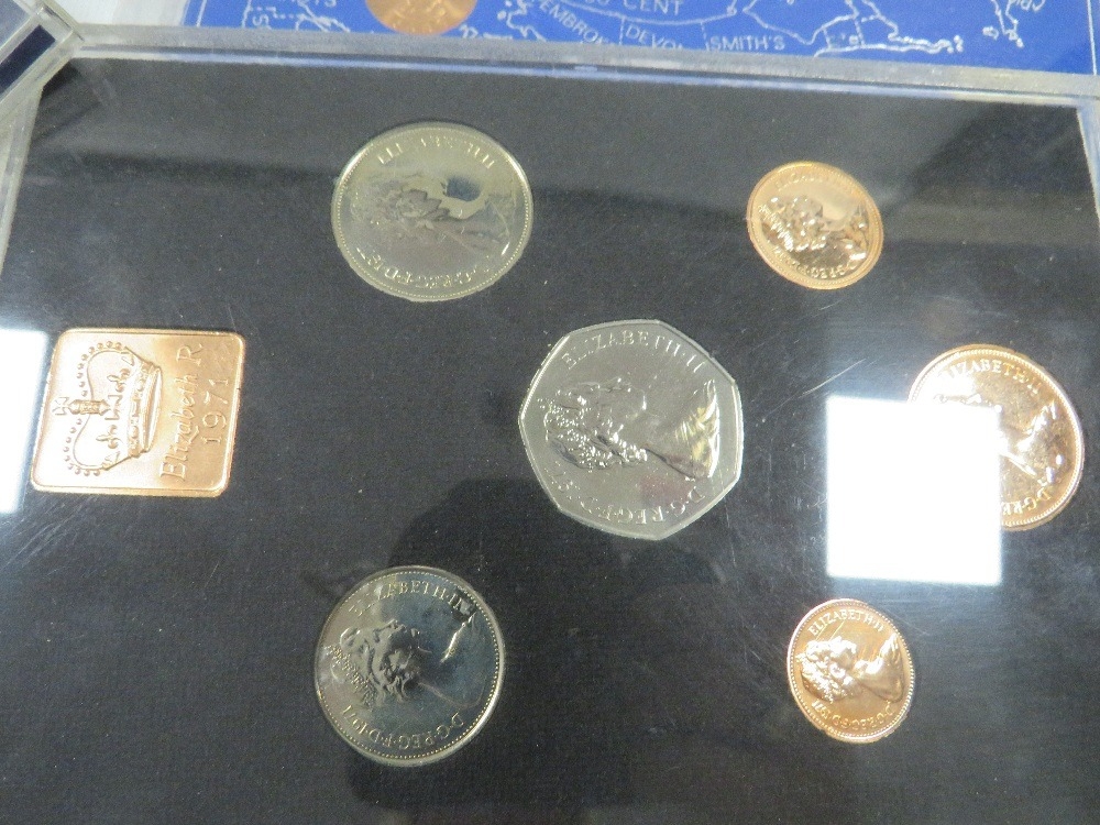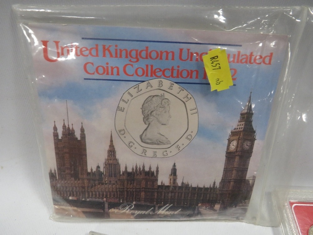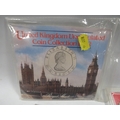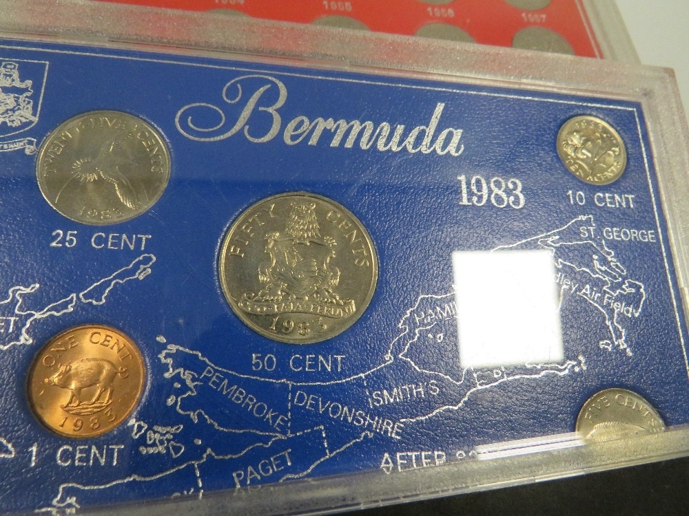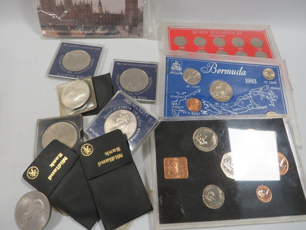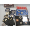 A tin of assorted coin sets etc