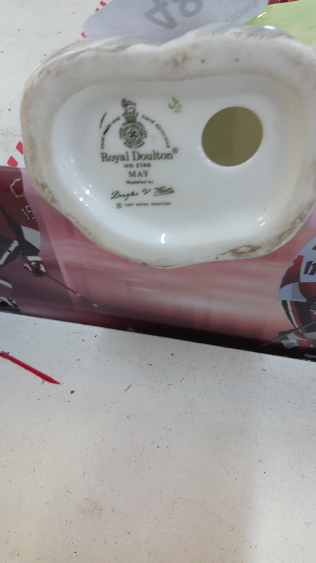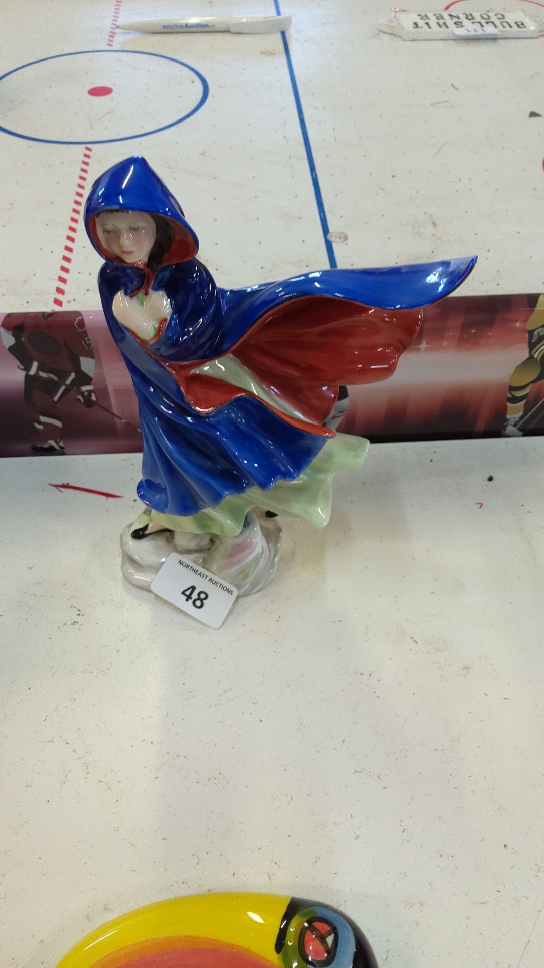A Royal Doulton bone china figure of "May", model HN 2748, depicting a girl in a wind-swept blue hooded cape over red and green dress, raised on an oval base.