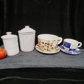 6 ceramic items including two oversized teacups with matching saucers. Also storage canisters