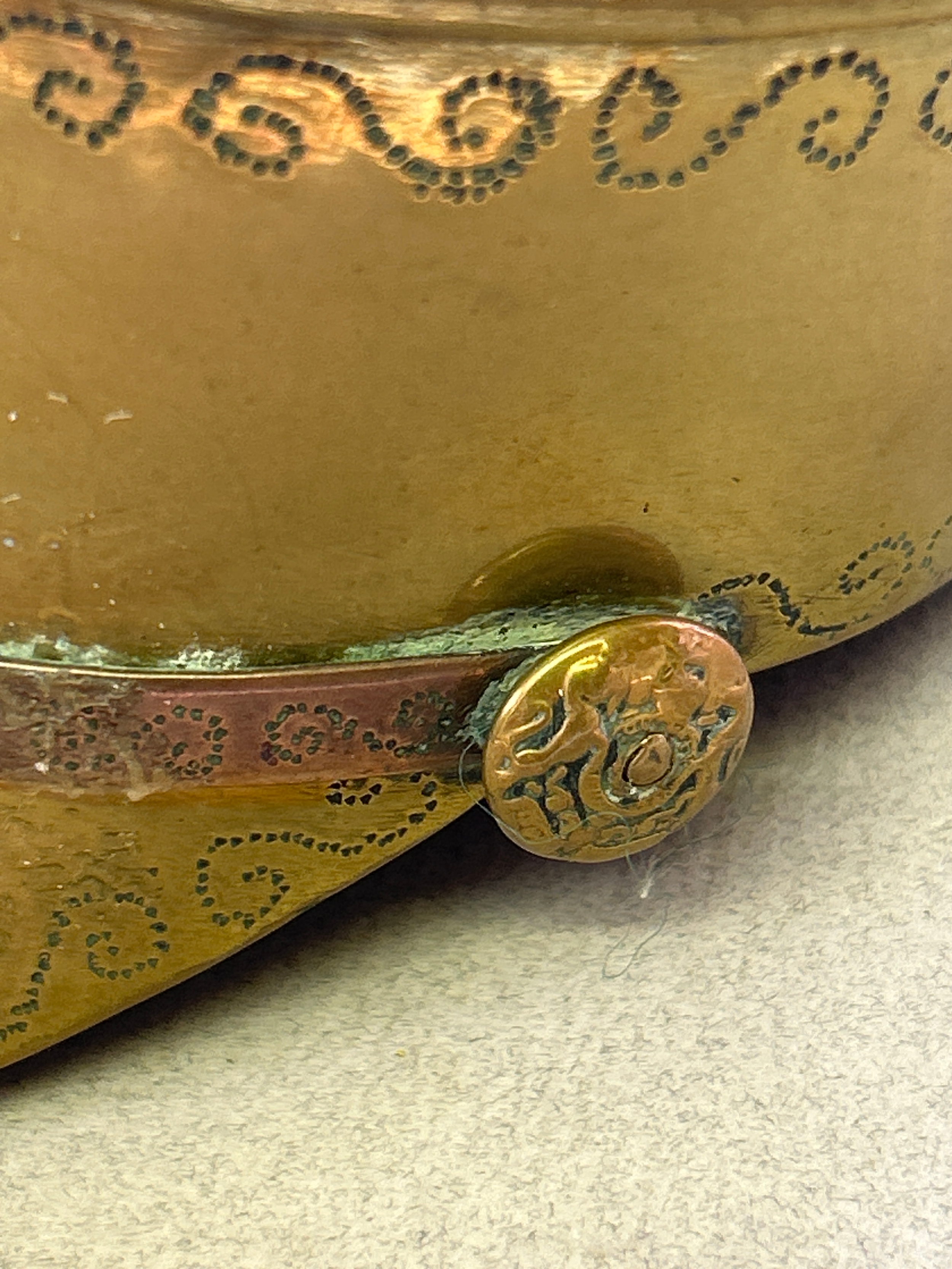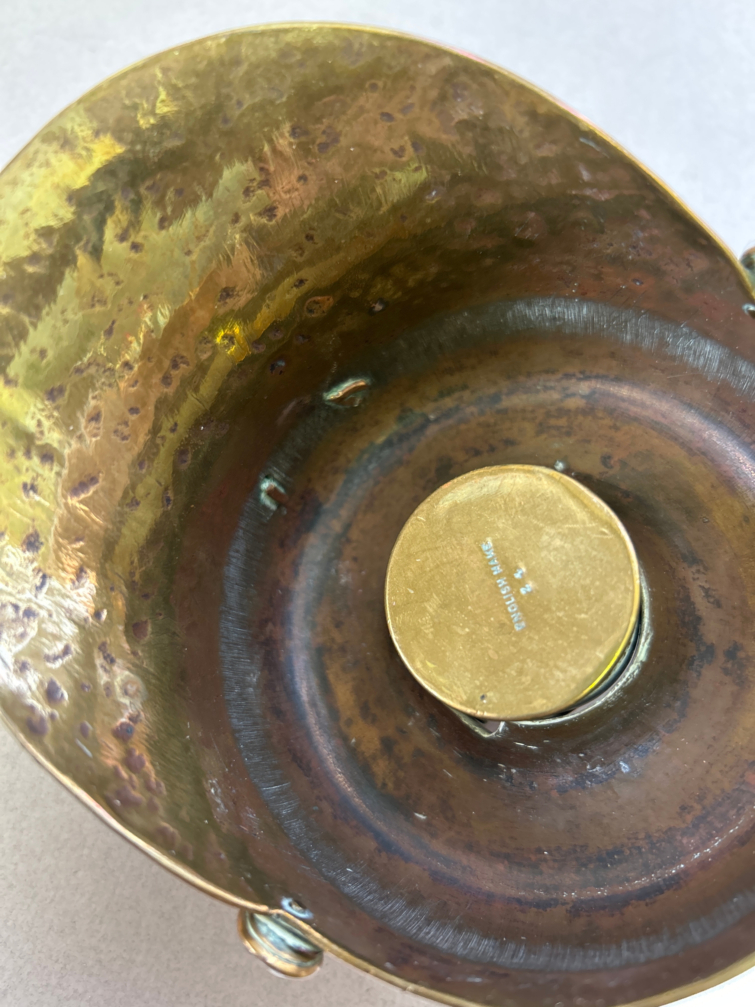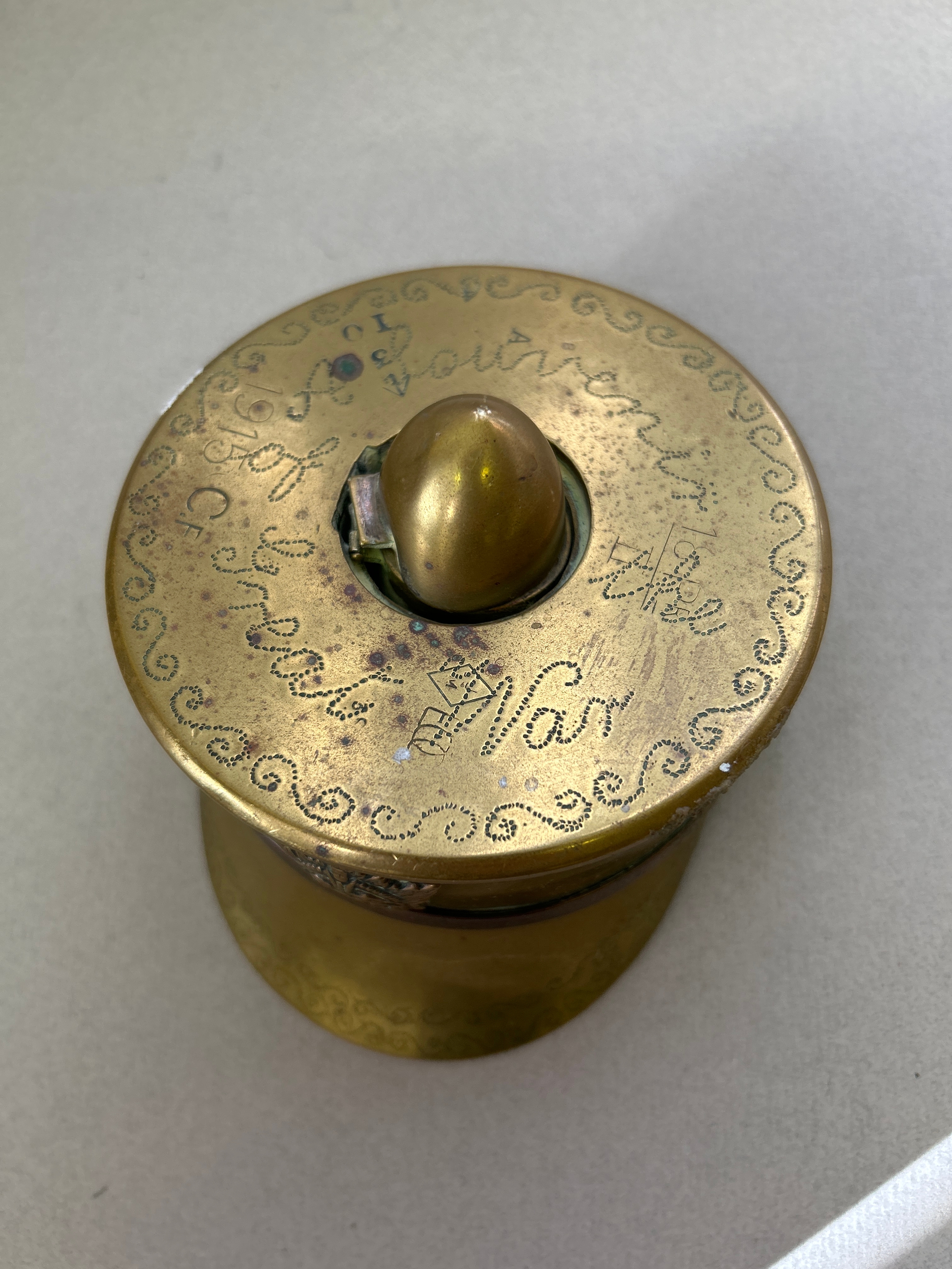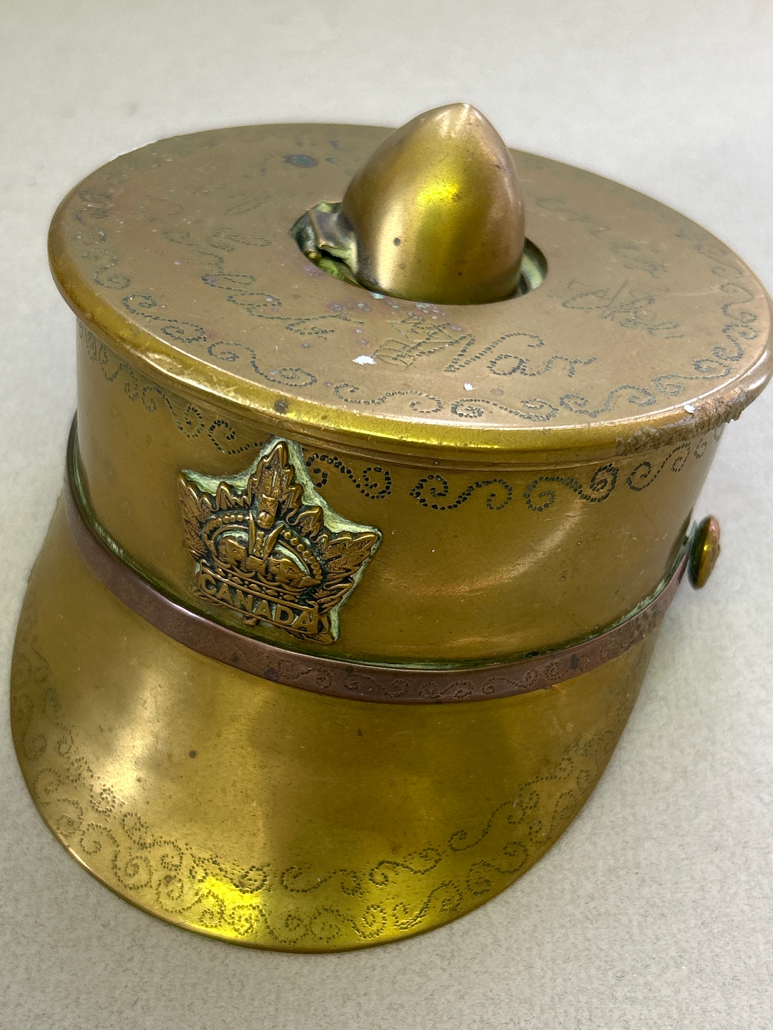A good WW1 trench art officers cap inkwell, with Canadian cap badge, punched decoration & inscription “Souvenir of the Great War”. Shell case dated 1915. The injwell stamped “English Make”.