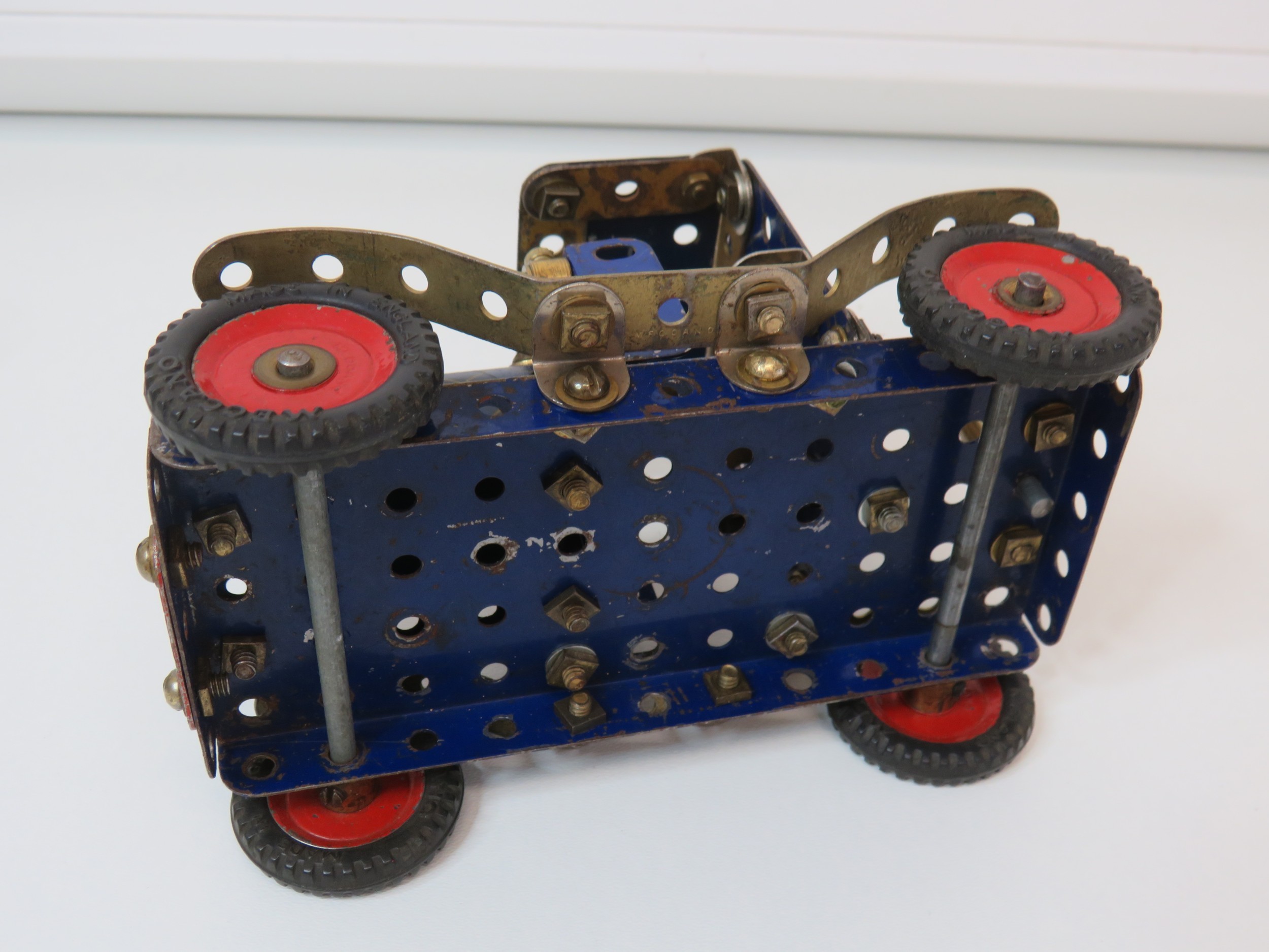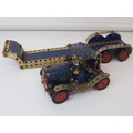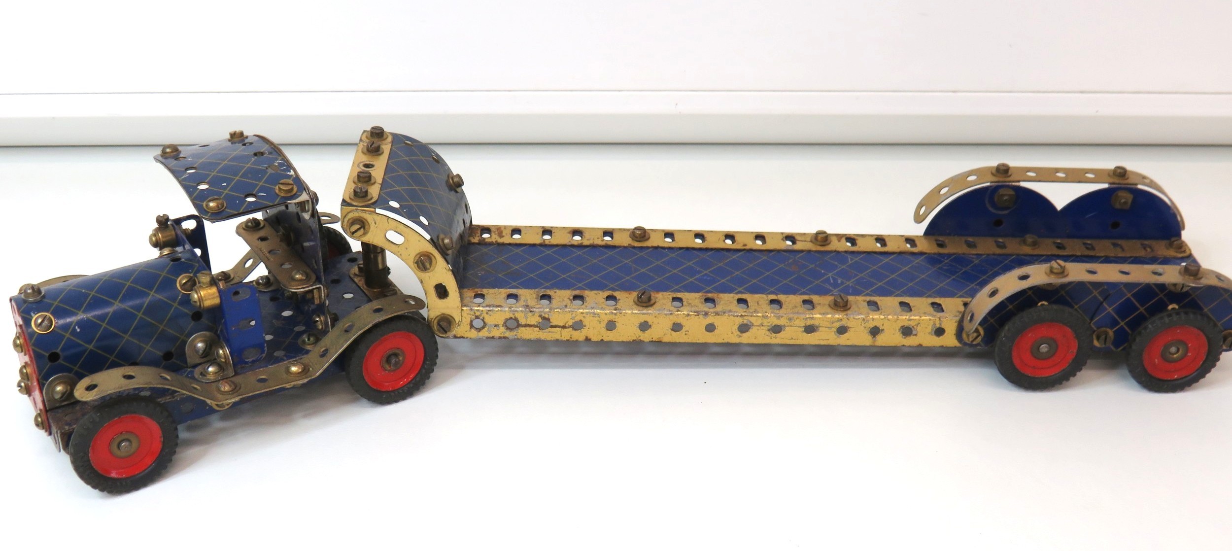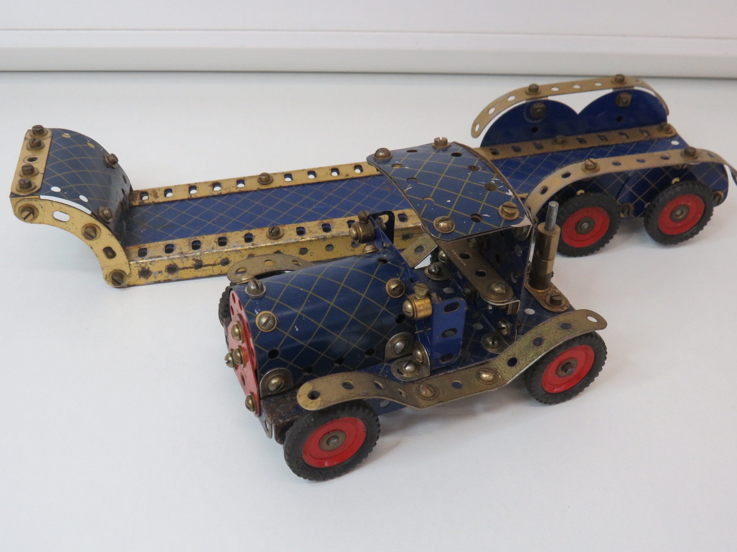 1950s Meccano tractor lorry and articulated low loader trailer.