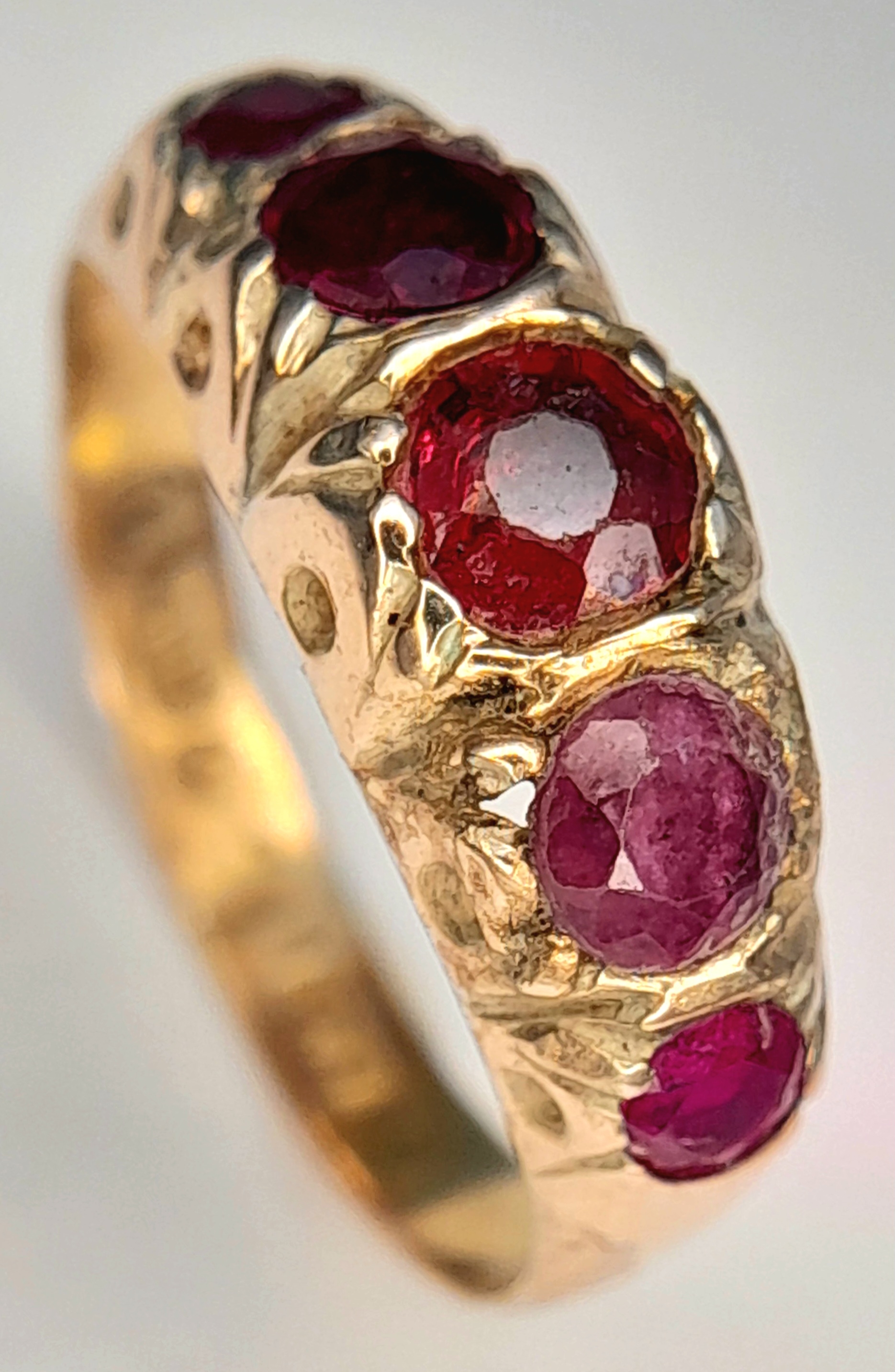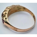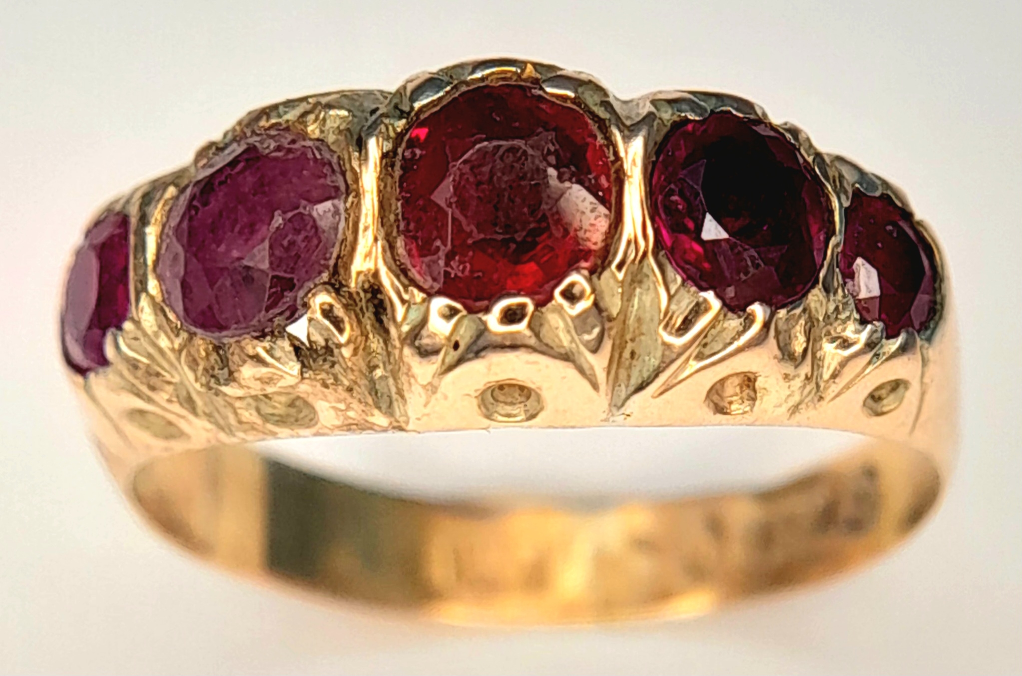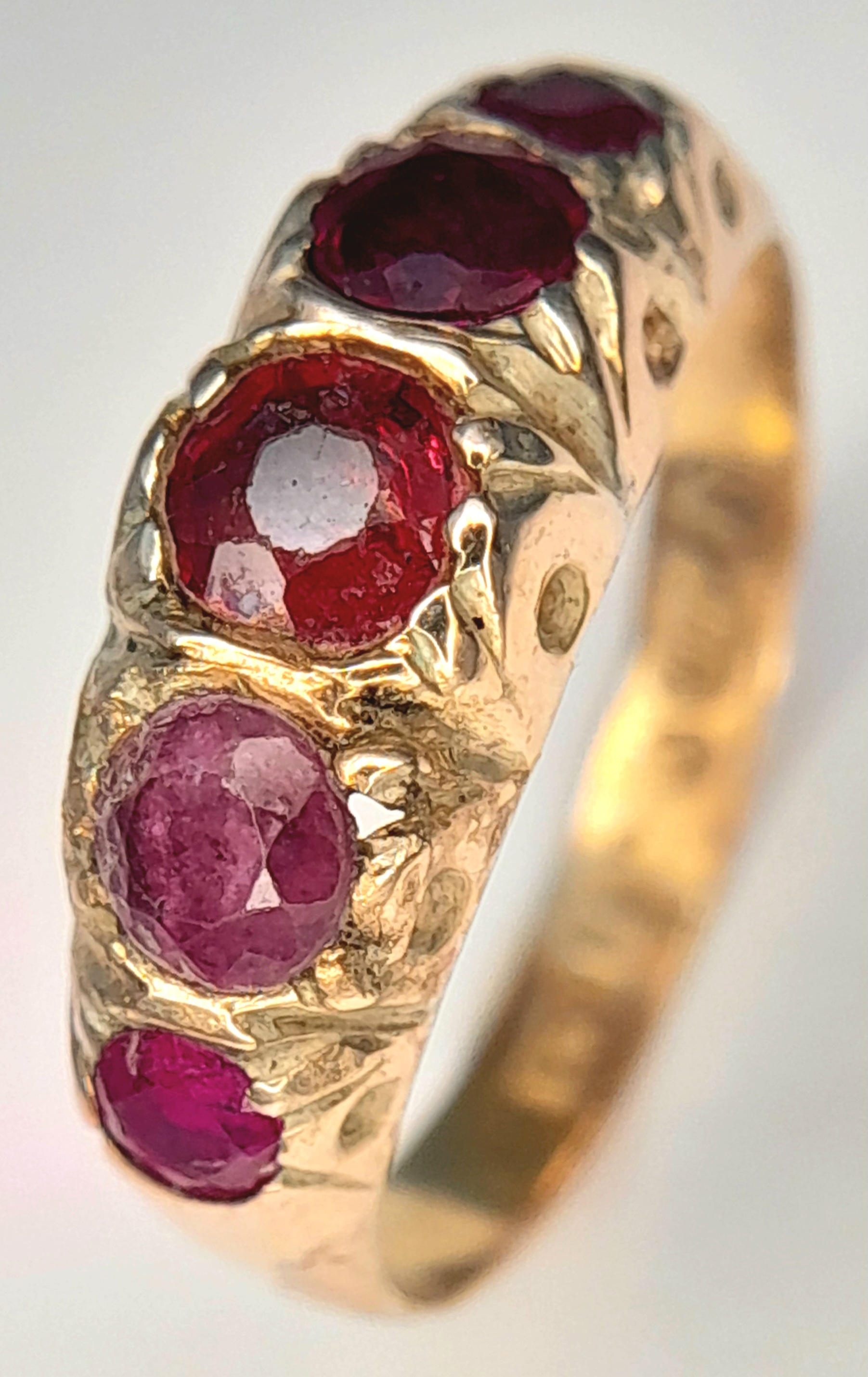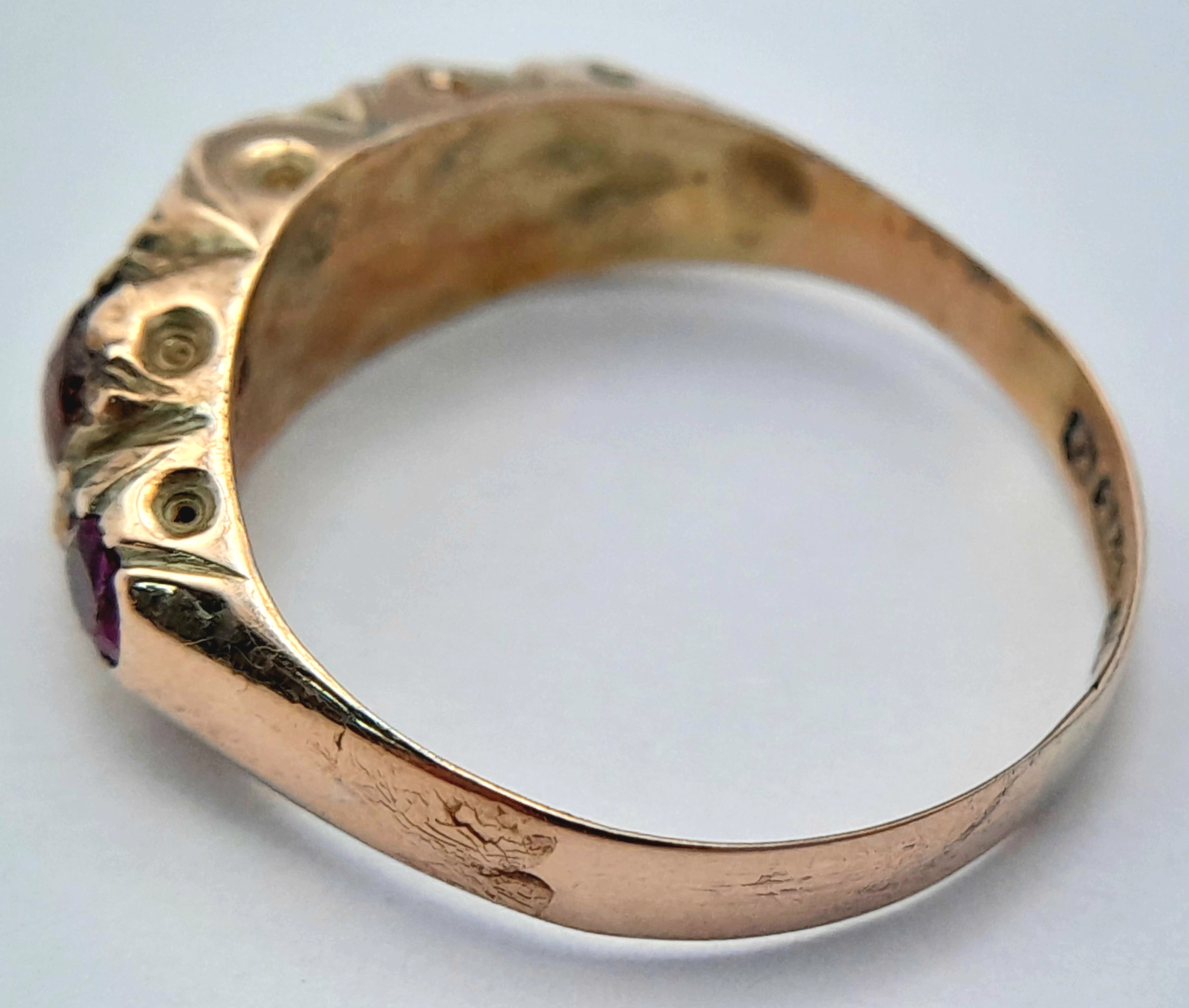 A Vintage 9K Gold Garnet, Amethyst and Ruby Five Stone Ring. Size J. 1.1g.