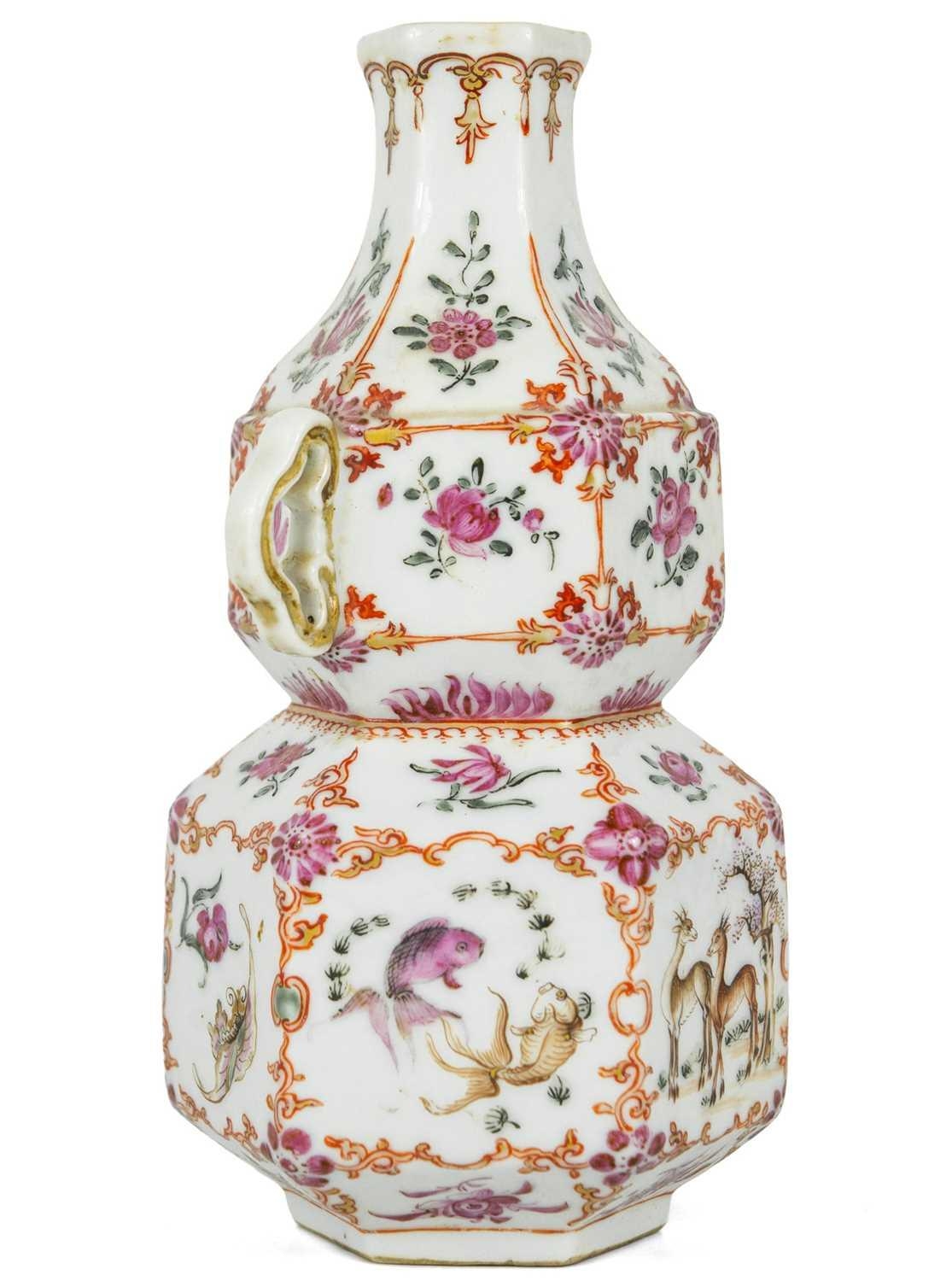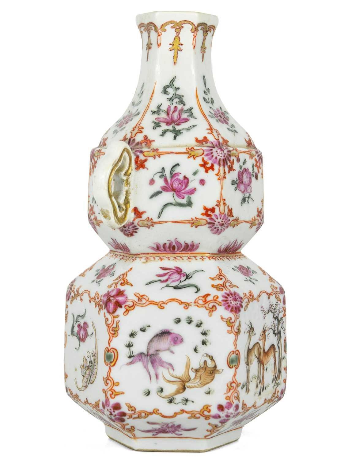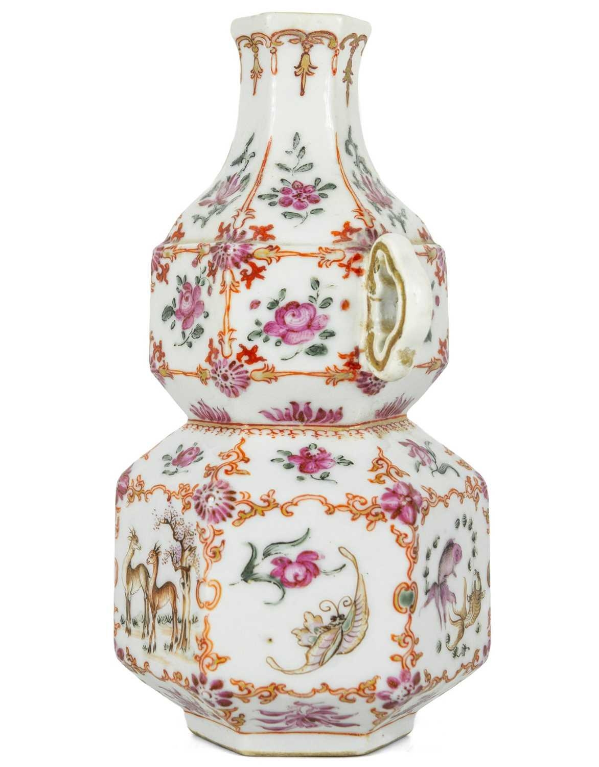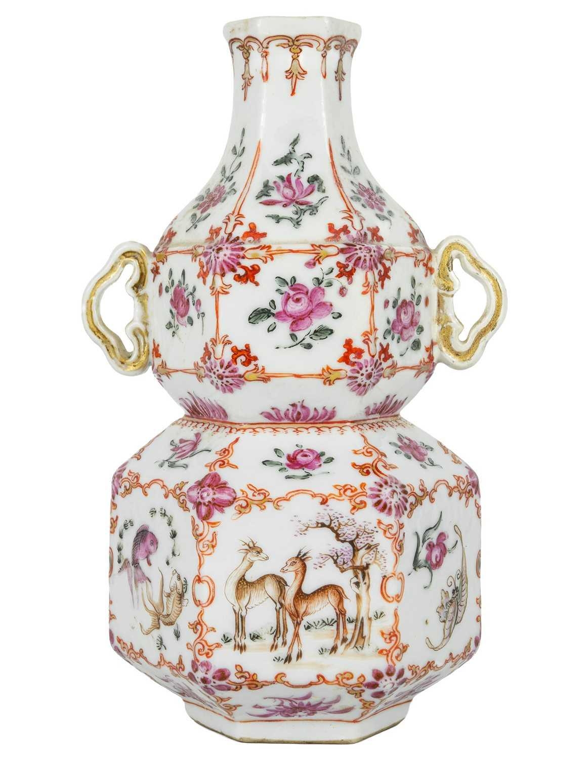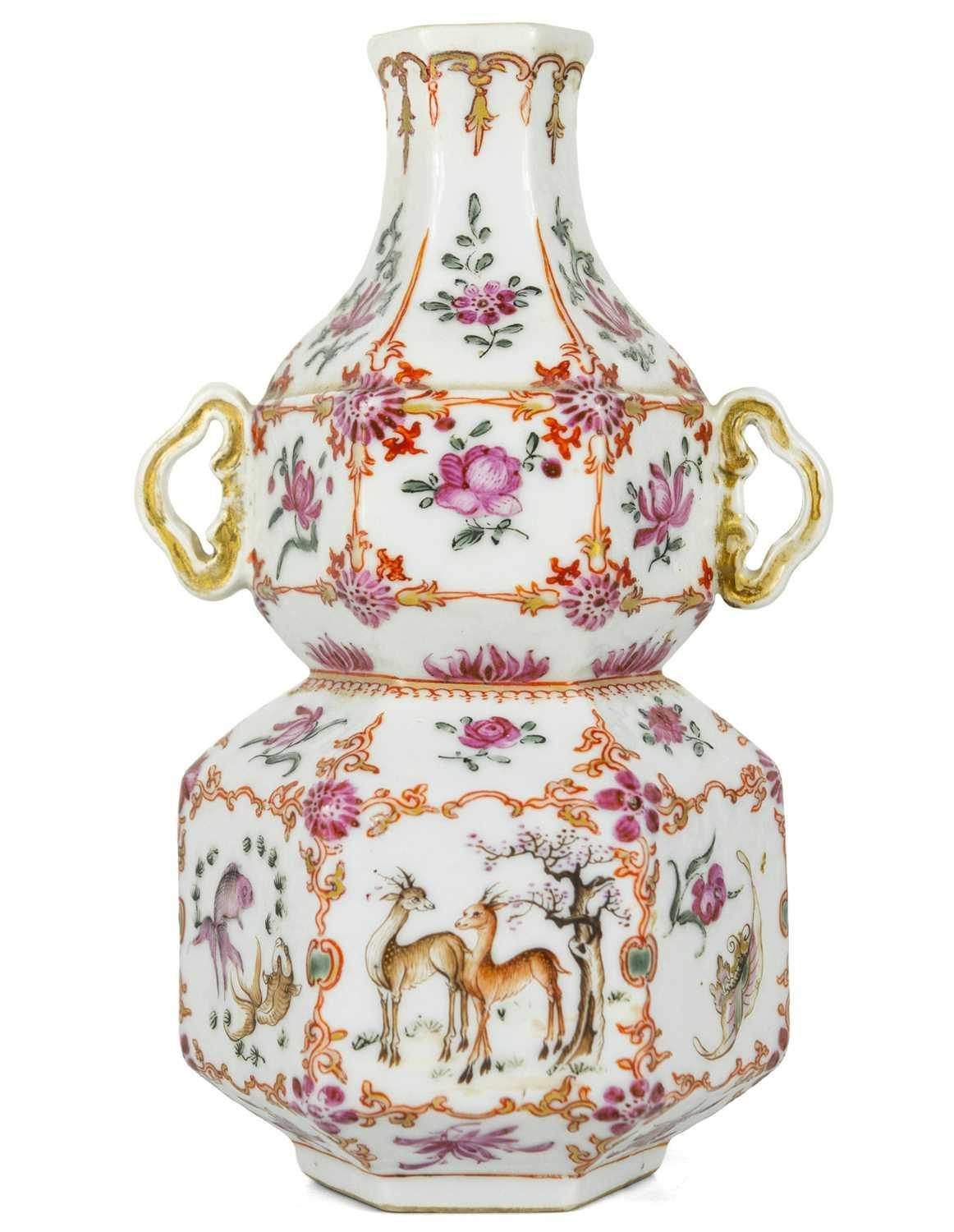 A Chinese famille rose porcelain double gourd vase, circa 1760. With twin handles and decorated with bats, deer and fish, old paper label to reverse, height 18cm, width 9cm, depth 8.5cm. No breaks or chips. Wear to the gilding and some scratches to the enamel. Generally good. Extra images on our website www.davidlay.co.uk