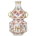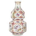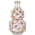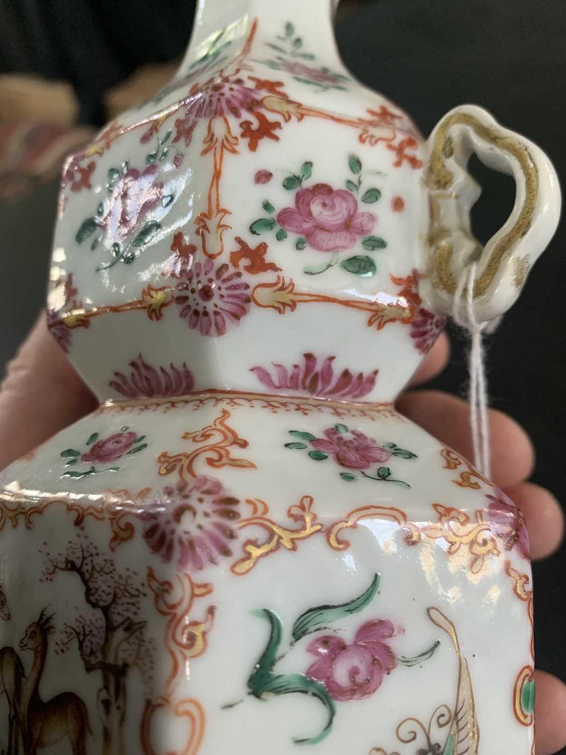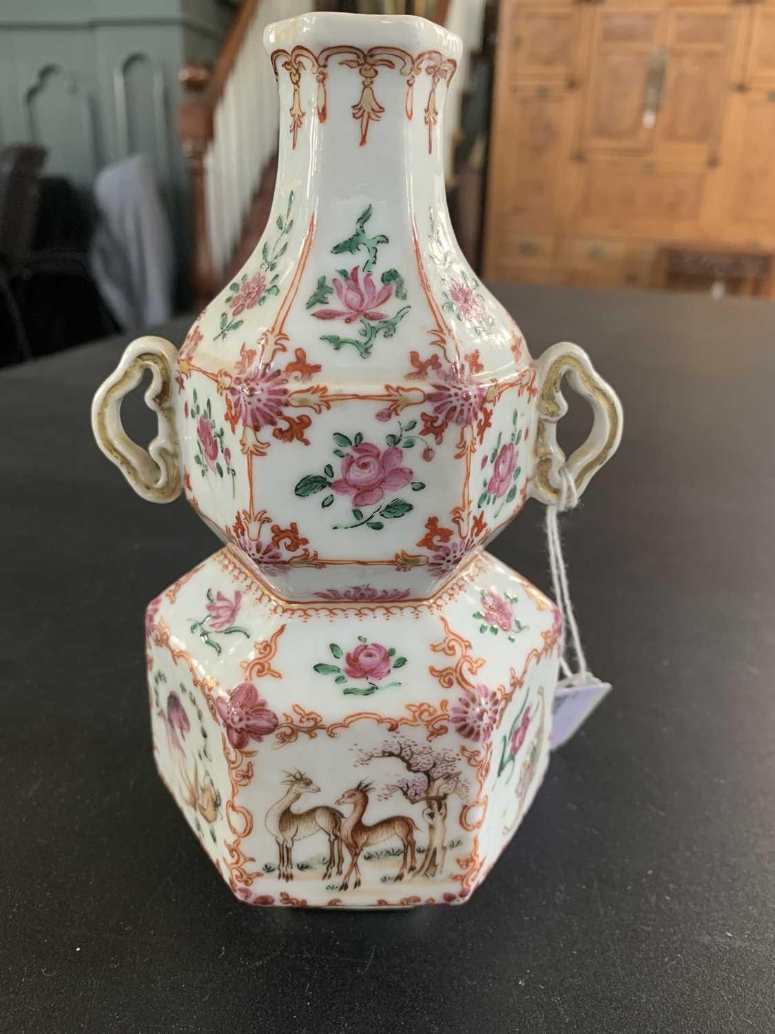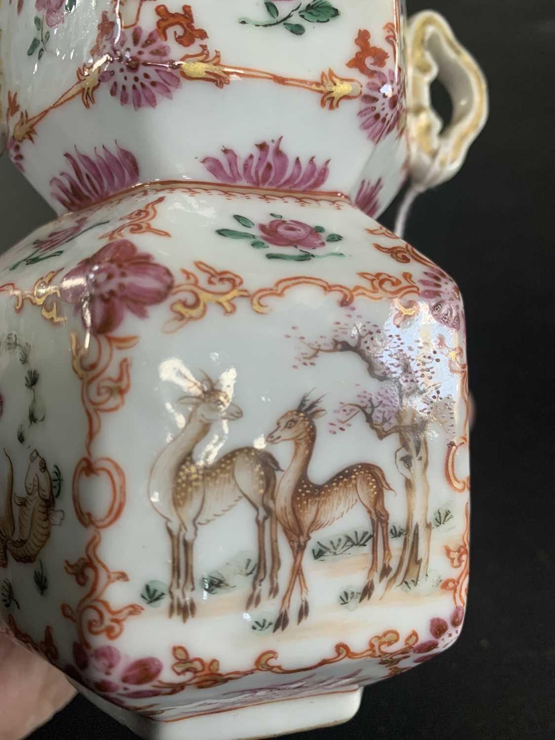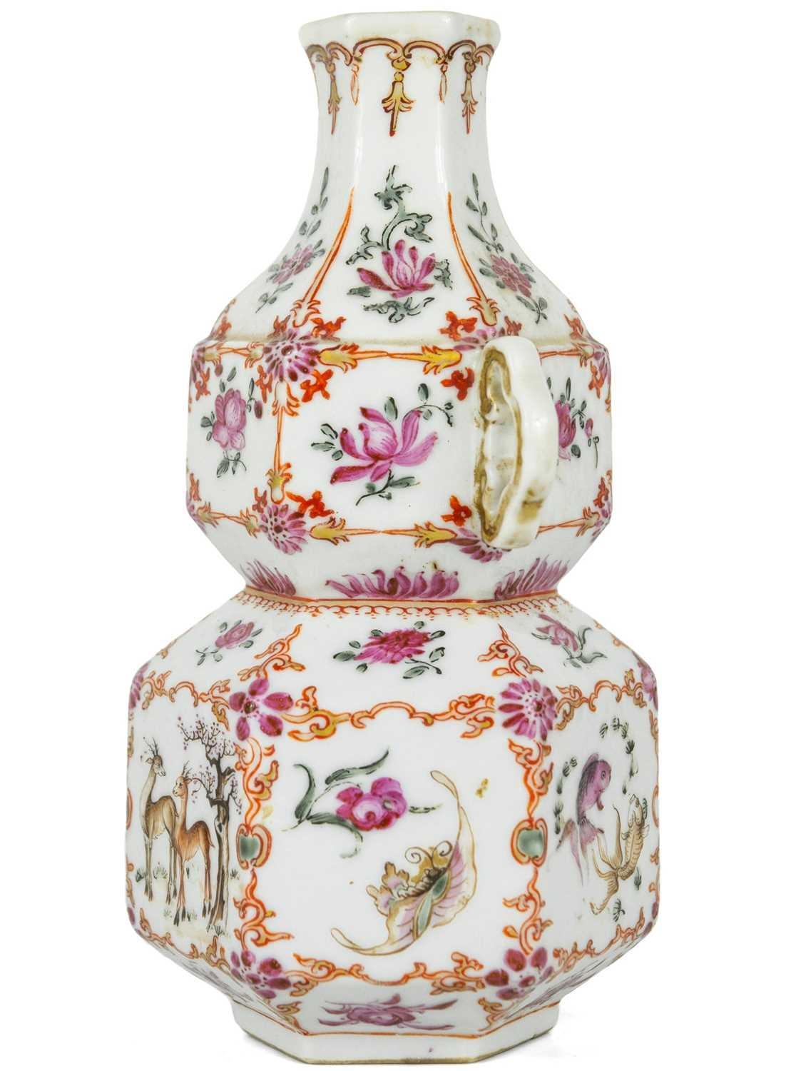 A Chinese famille rose porcelain double gourd vase, circa 1760. With twin handles and decorated with bats, deer and fish, old paper label to reverse, height 18cm, width 9cm, depth 8.5cm. No breaks or chips. Wear to the gilding and some scratches to the enamel. Generally good. Extra images on our website www.davidlay.co.uk