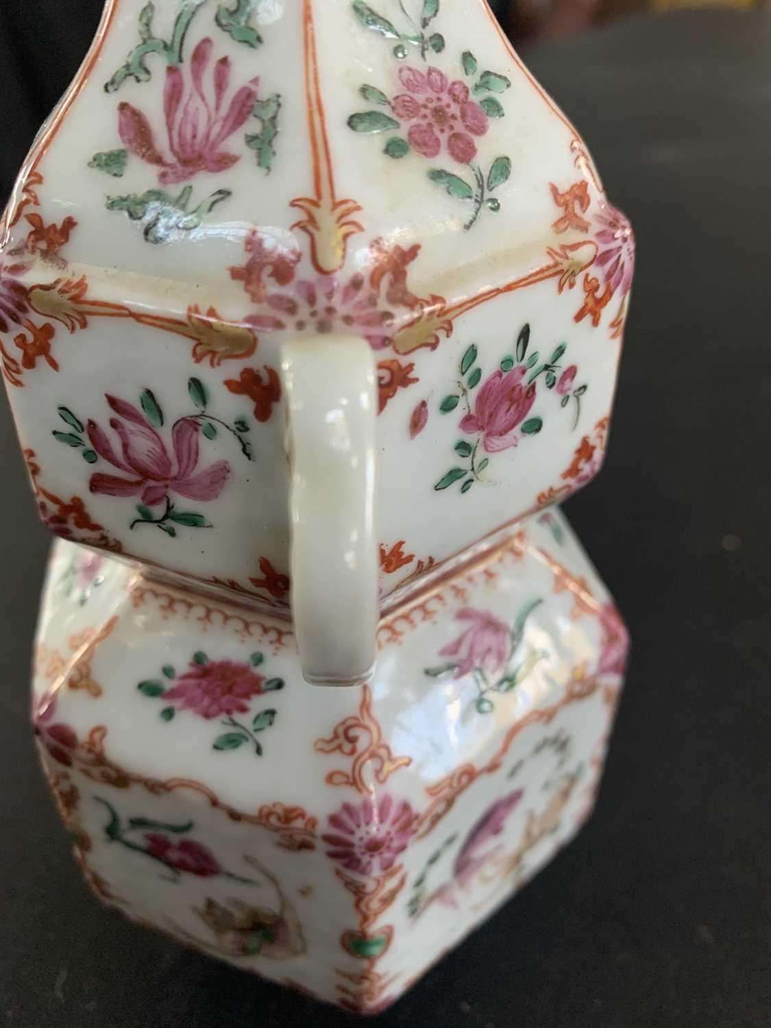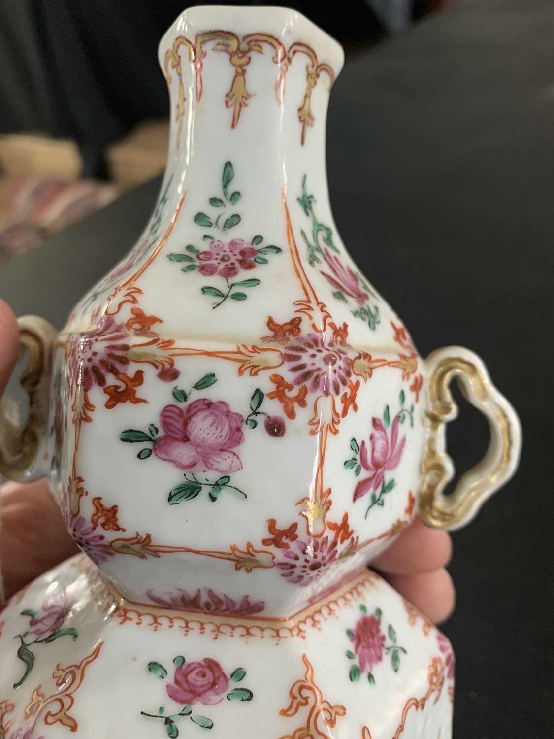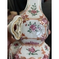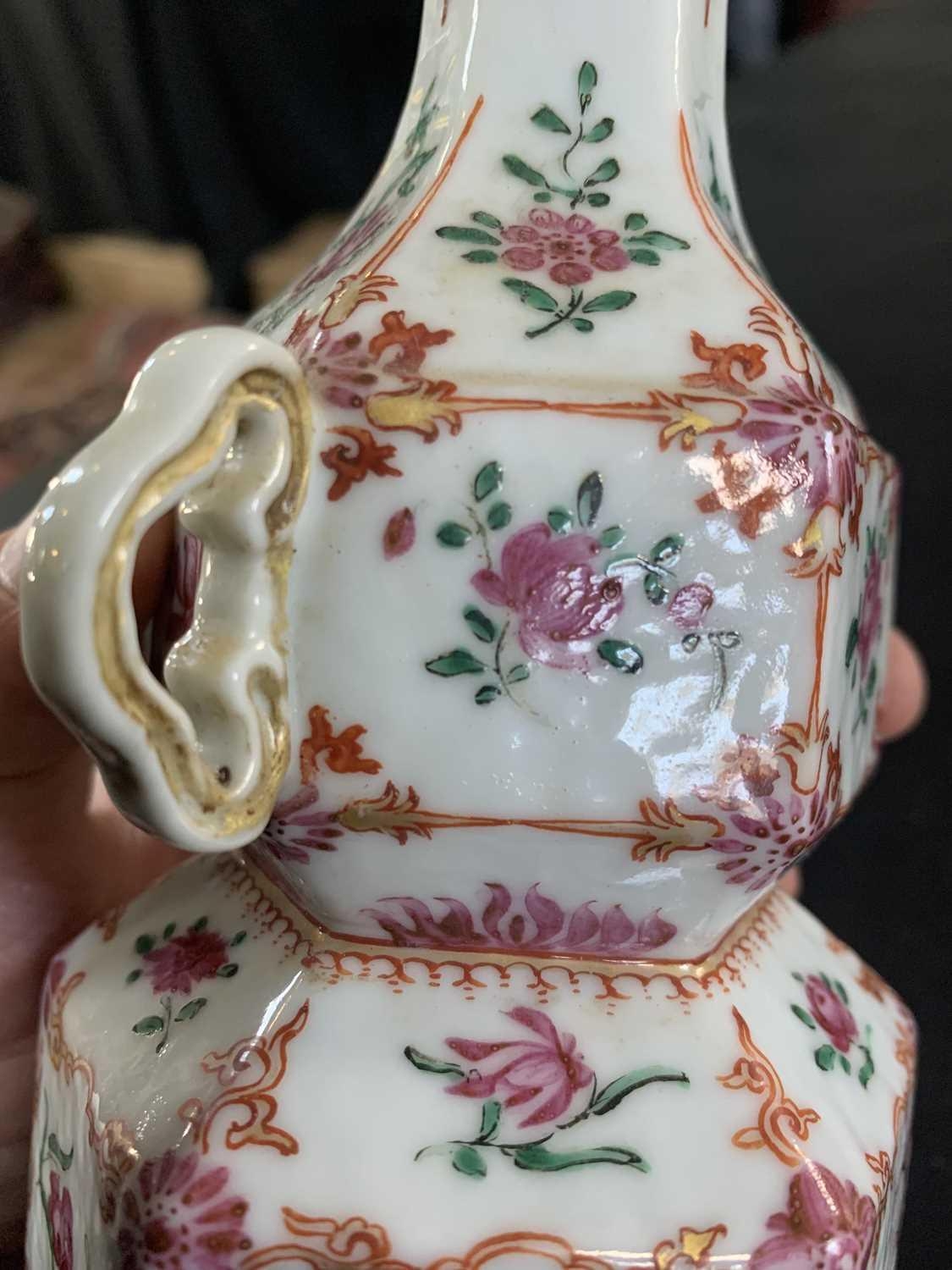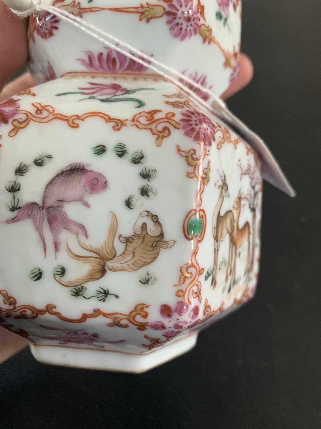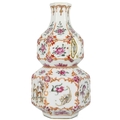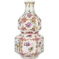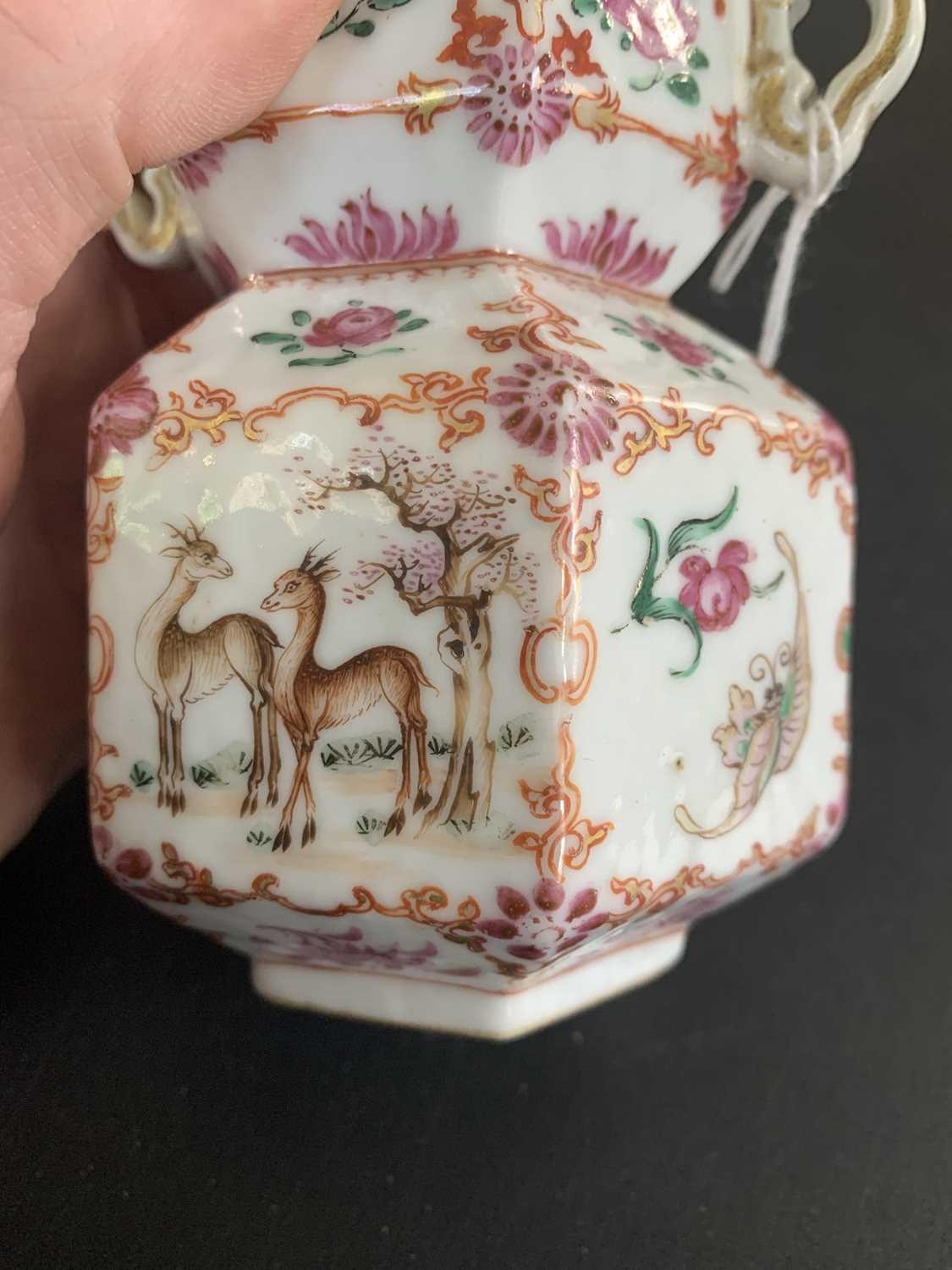 A Chinese famille rose porcelain double gourd vase, circa 1760. With twin handles and decorated with bats, deer and fish, old paper label to reverse, height 18cm, width 9cm, depth 8.5cm. No breaks or chips. Wear to the gilding and some scratches to the enamel. Generally good. Extra images on our website www.davidlay.co.uk