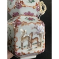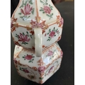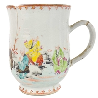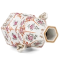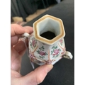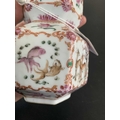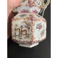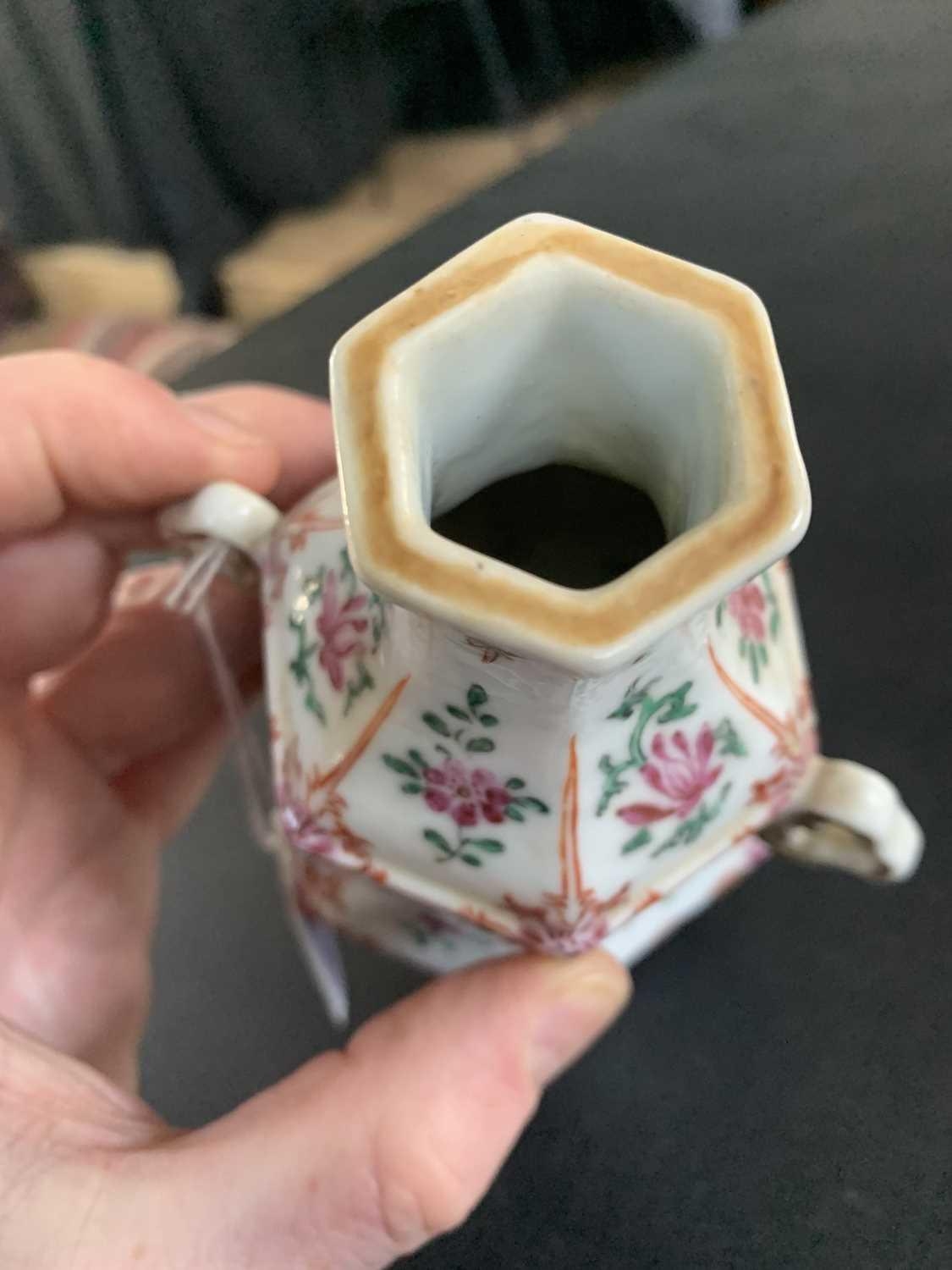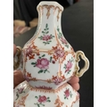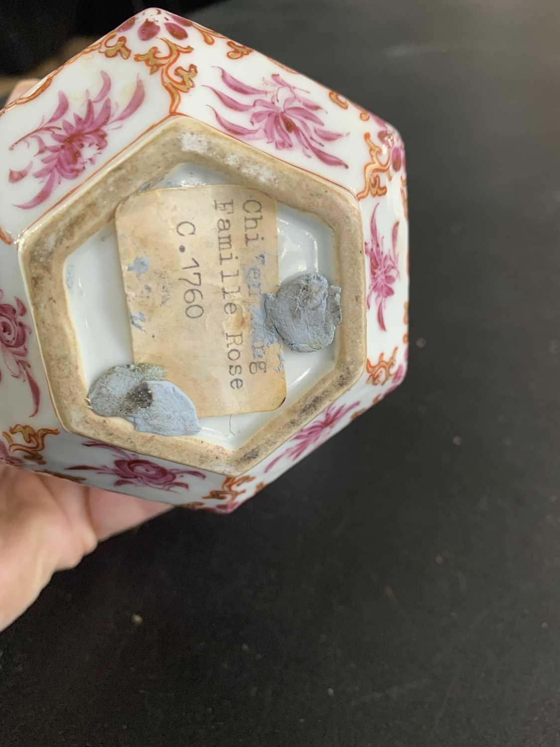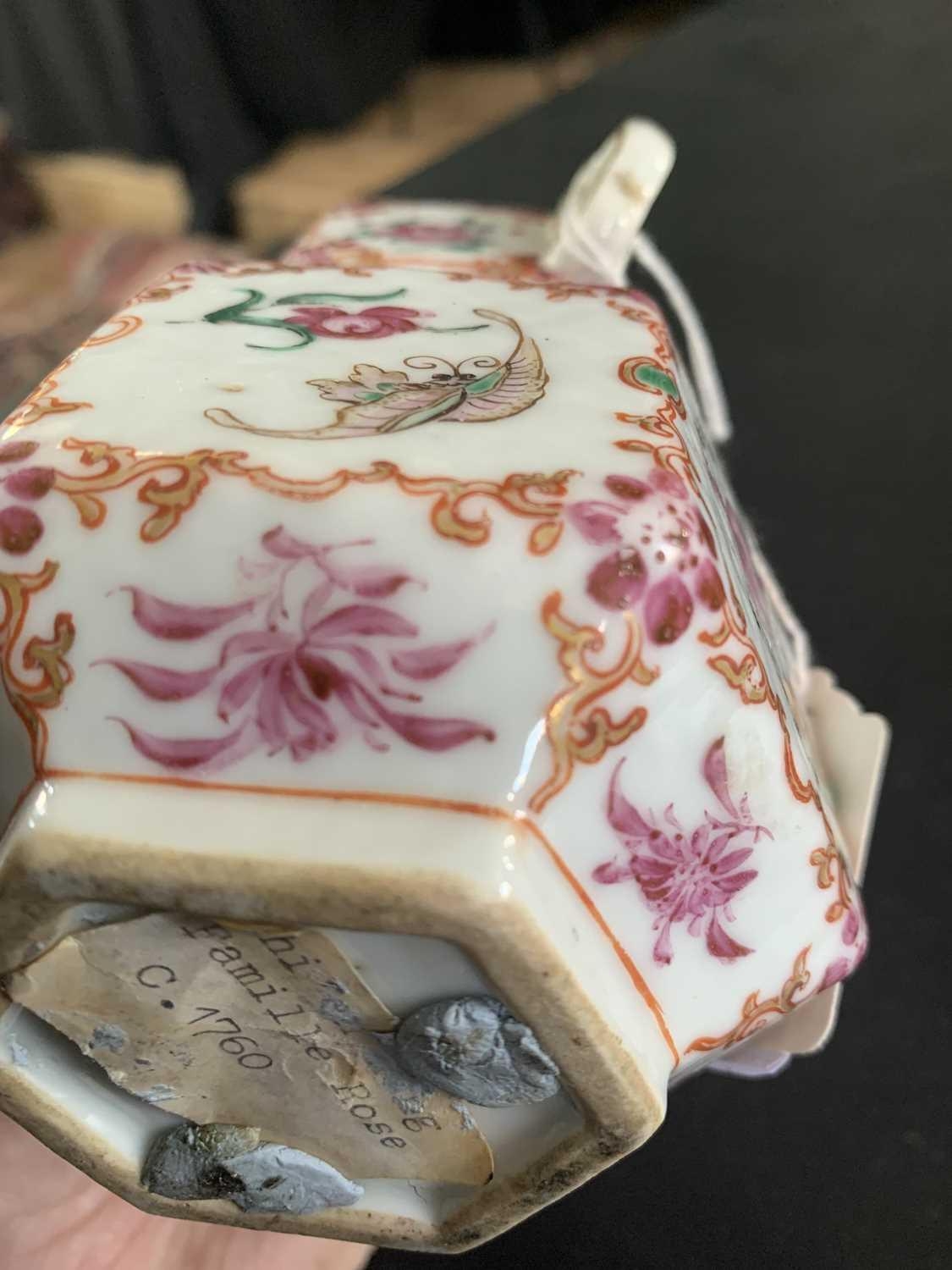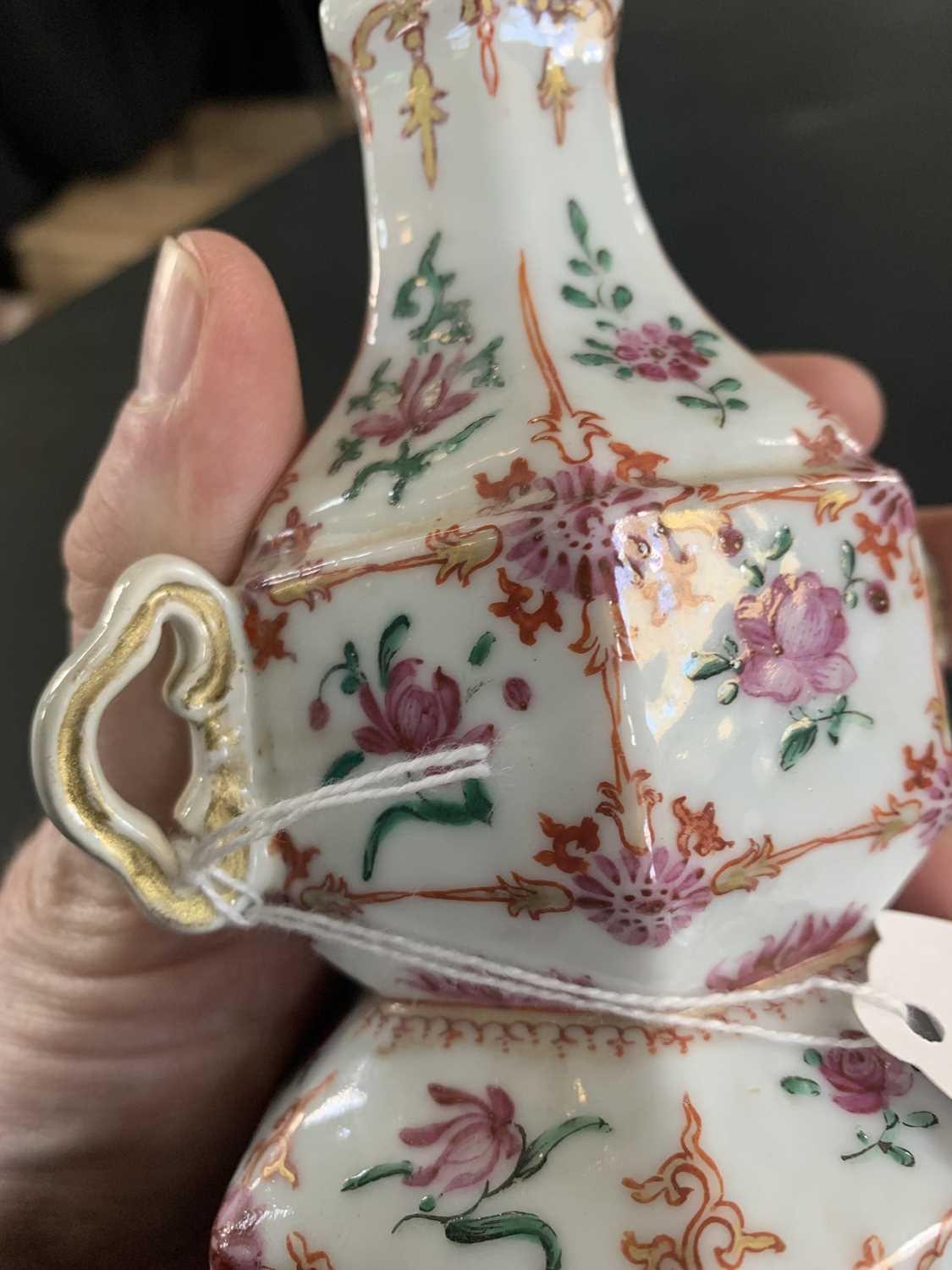 A Chinese famille rose porcelain double gourd vase, circa 1760. With twin handles and decorated with bats, deer and fish, old paper label to reverse, height 18cm, width 9cm, depth 8.5cm. No breaks or chips. Wear to the gilding and some scratches to the enamel. Generally good. Extra images on our website www.davidlay.co.uk