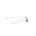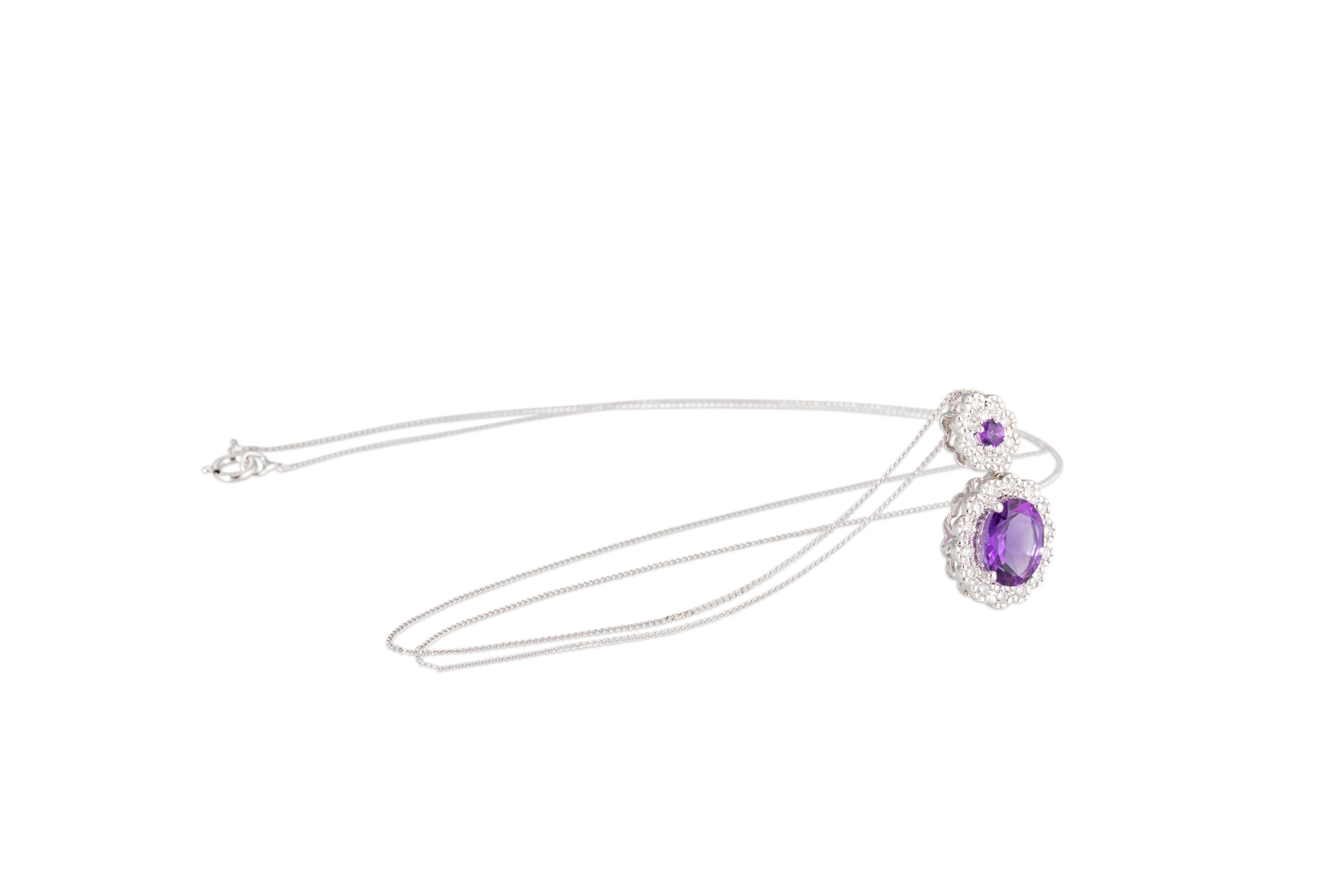AN AMETHYST AND DIAMOND SET CLUSTER PENDANT, the round amethyst to diamond set surround suspending a larger oval cut amethyst with diamond set surround, mounted in 18ct white gold to a 9ct white gold chain. Estimated: total weight of amethysts: 1.11 ct, weight of diamonds: 0.19 ct in total. Length ca. 19" (inc. drop of pendant)