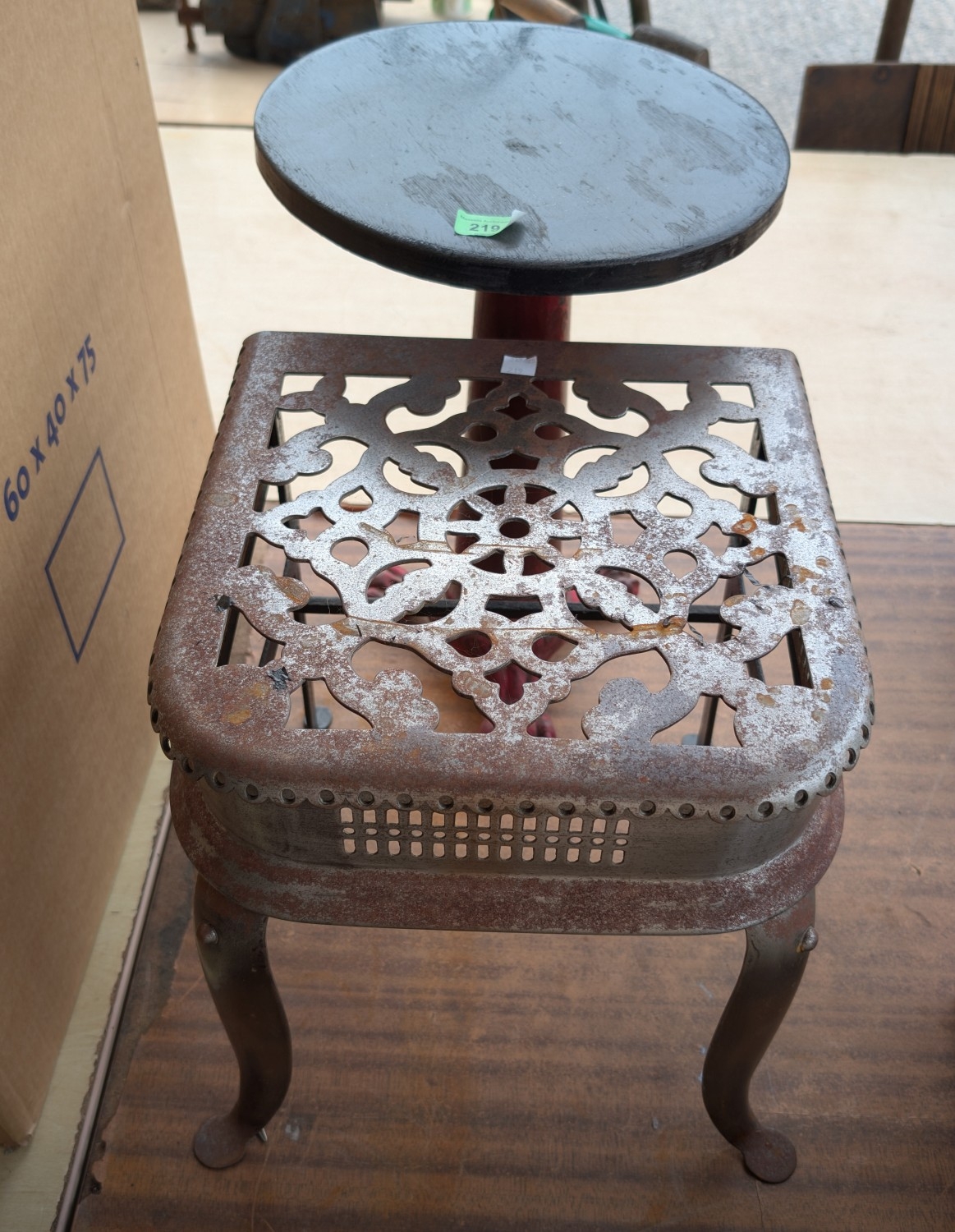 A 19th century steel footman; a circular machinists stool on cast iron base.