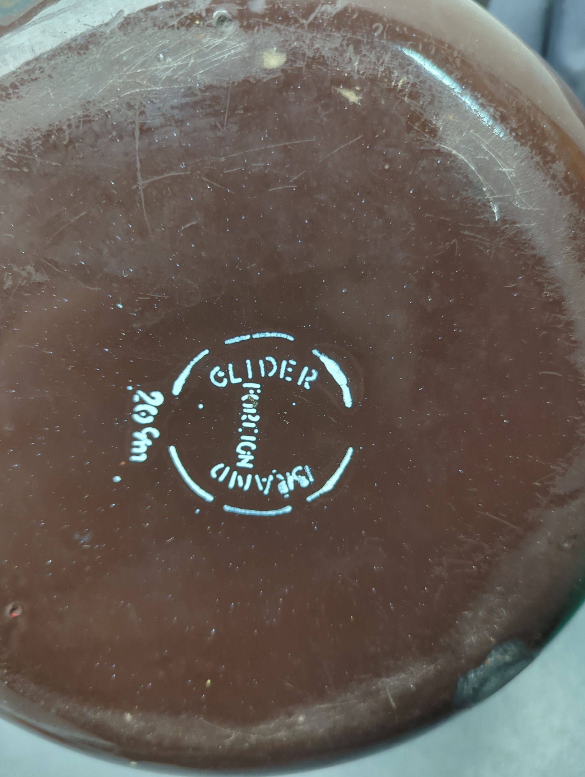A brown ceramic teapot marked "Glider" and "Foreign" at the base, indicating its model and possible origin. It features a classic shape with a lid, spout, and handle. The teapot's simple yet elegant design is accentuated by its glossy finish.