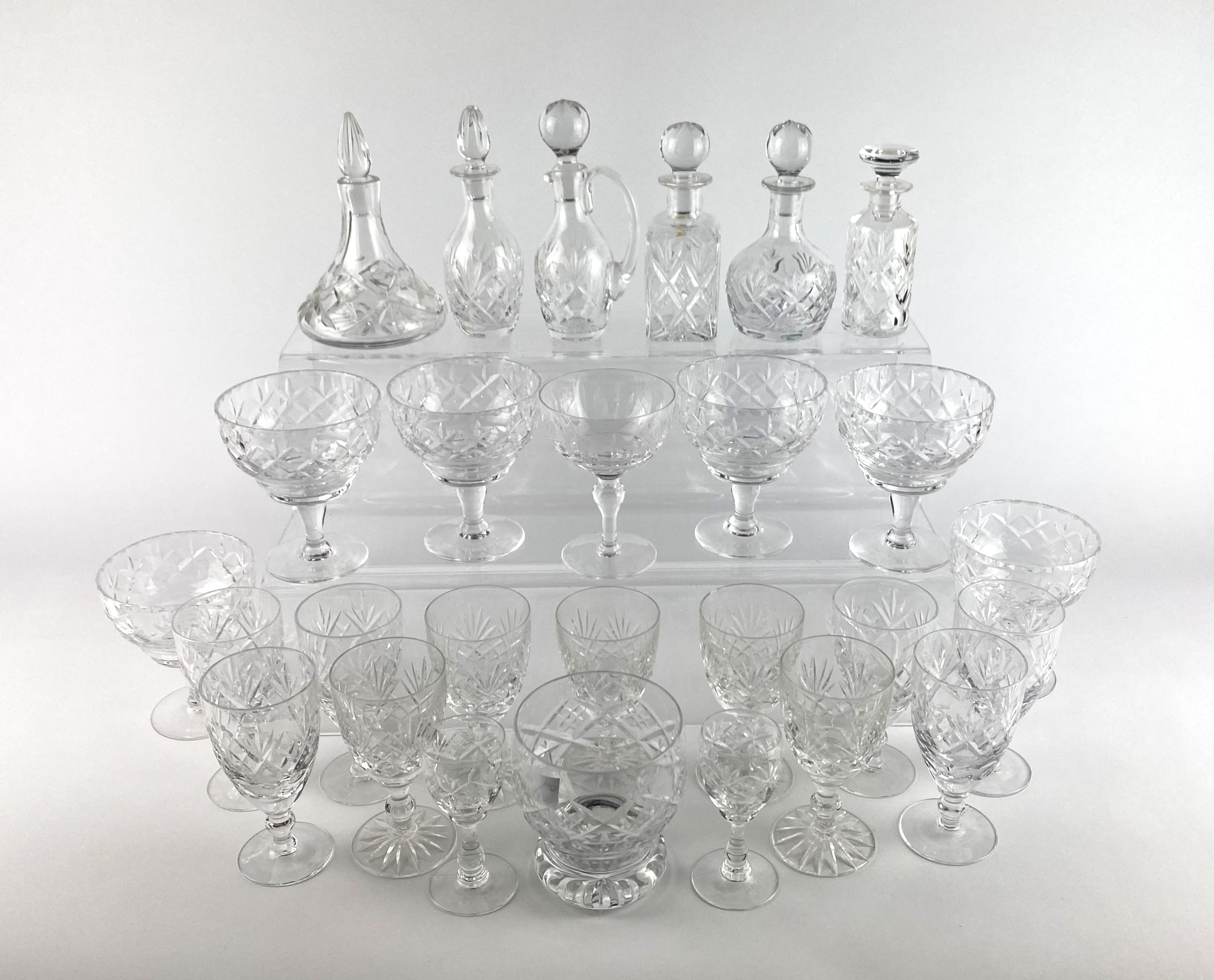 A collection of six cut glass dessert glasses, together with a set of five cut glass port glasses, a champagne coupe, a rummer, a set of six cut glass wine glasses, a pair of cut glass liqueur glasses, six cut glass bottles of various designs, the first height 10cm (qty)