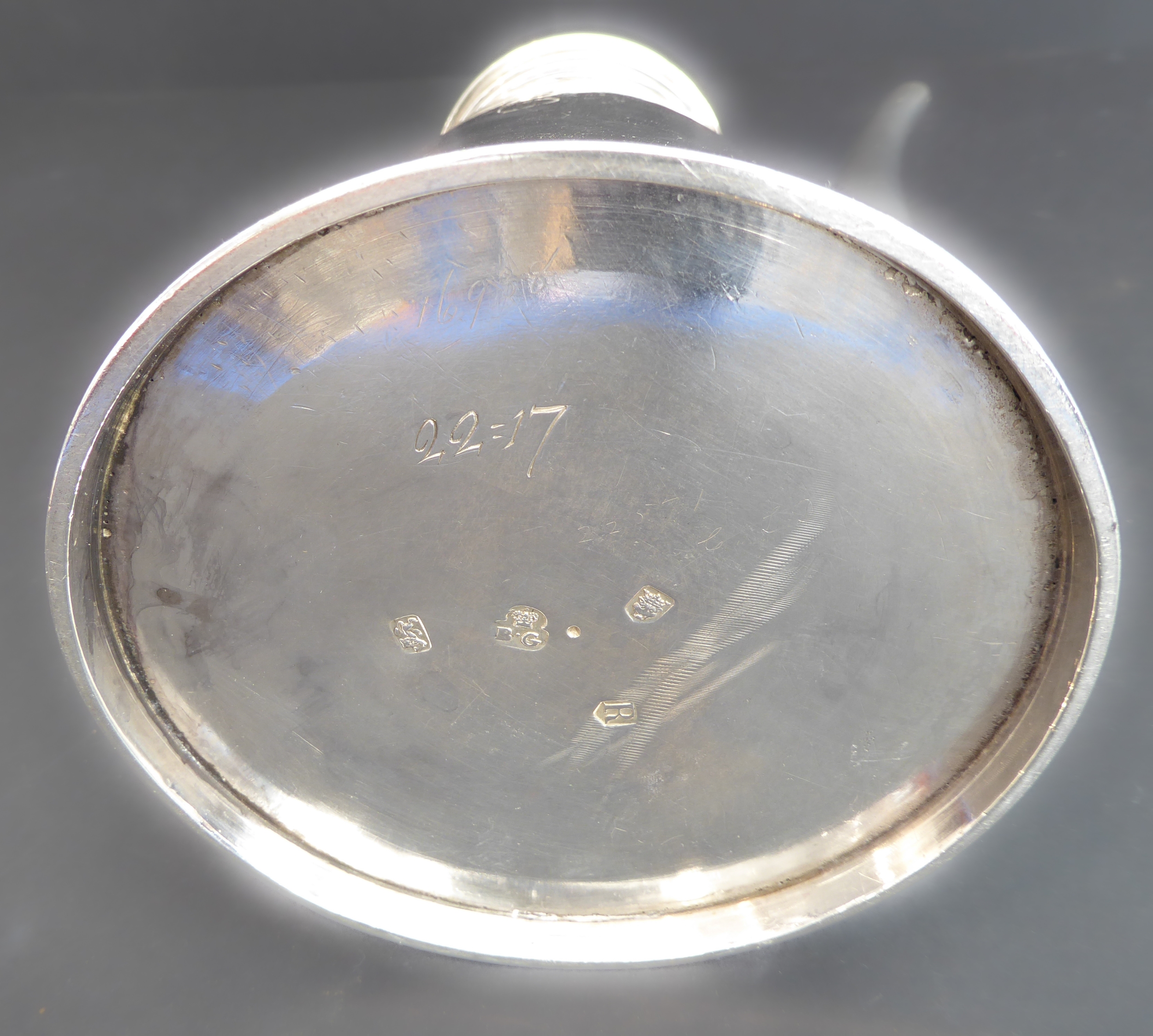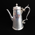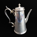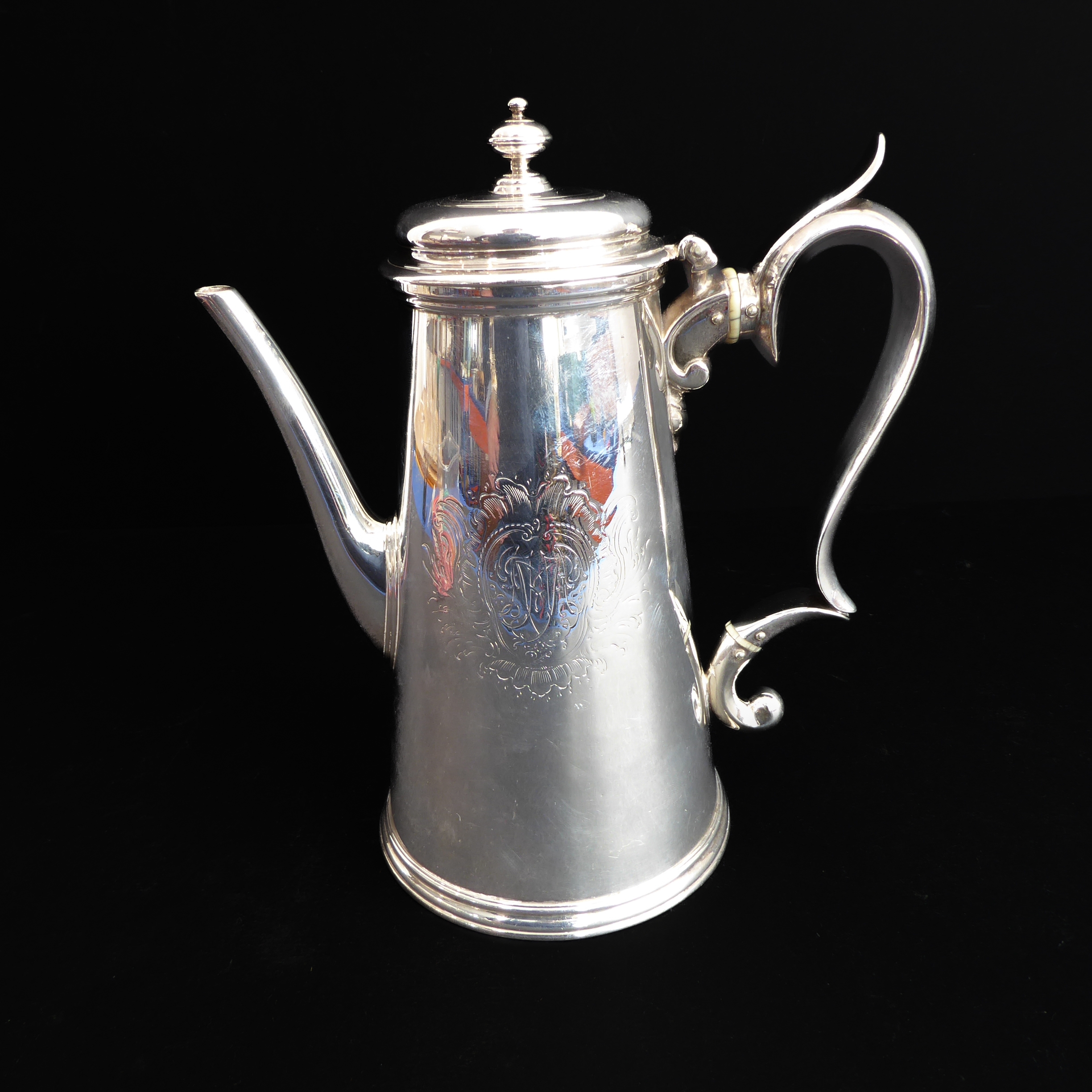 A large and heavy hallmarked-silver coffee-pot of conical form: the hinged cover above a scrolling shaped handle with small bone insulators; the body engraved with monogrammed cartouche and large initial 'C' opposing; raised on circular reeded foot; maker's mark B.G. below a crown; assayed London 1732. (20.5 cm to tip of finial) (Approx. 740g)