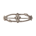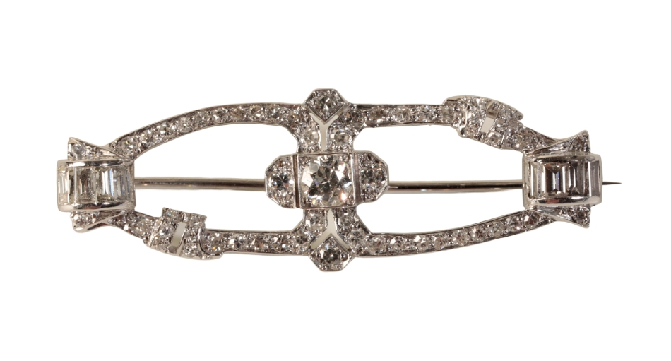AN ART DECO DIAMOND BROOCH, of geometric design, the unmarked white metal open-work frame, set with round-cut and baguette-cut diamonds, the central diamond of approx.0..30ct, 4.5cm wide