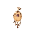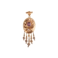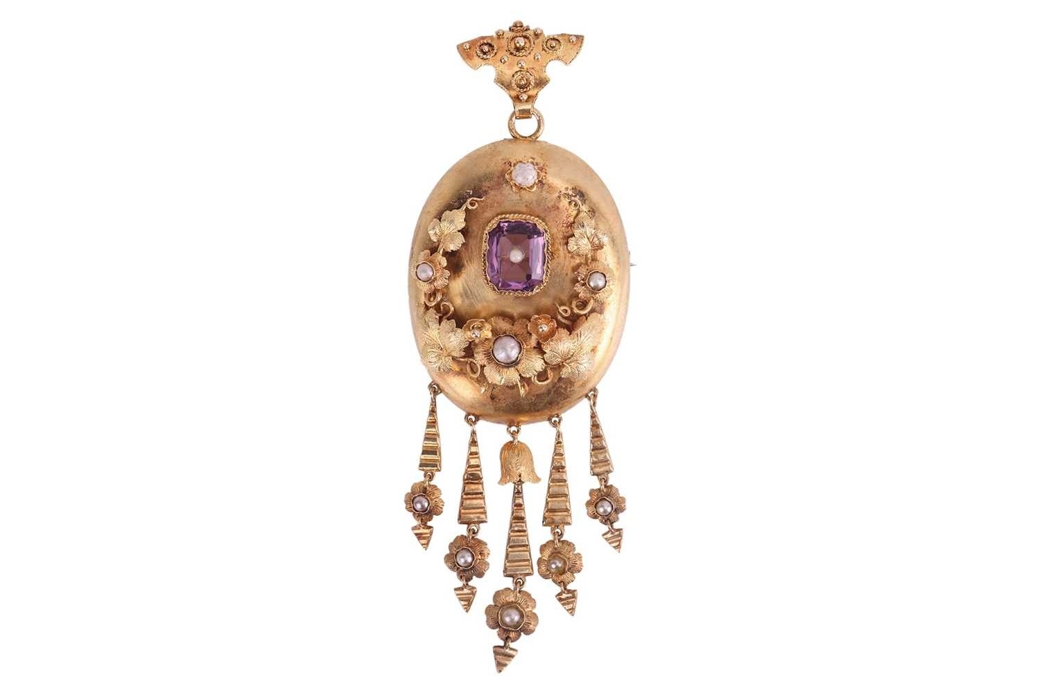 A Late 19th century Etruscan Revival brooch cum pendant, of oval form, with applied floral motifs, set with an octagonal-cut purple paste, with fringe below embellished with flowerheads and imitation pearls, on a hinged bail with twisted cables and granulated details, brooch fittings to the reverse, yellow metal stamped with Dutch oak leaf assay mark for 14ct, 8.5cm x 3.0cm, 7.9 grams.