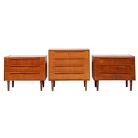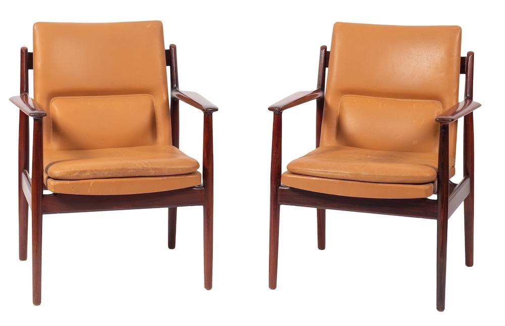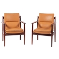 A pair of Danish rosewood and upholstered open armchairs, by Arne Vodder for Sibast Furniture, circa 1960s; the rectangular backs and seats with faux leather coverings, with shaped arms; the straight legs with 'H' form stretcher; 88cm high, 68cm wide
